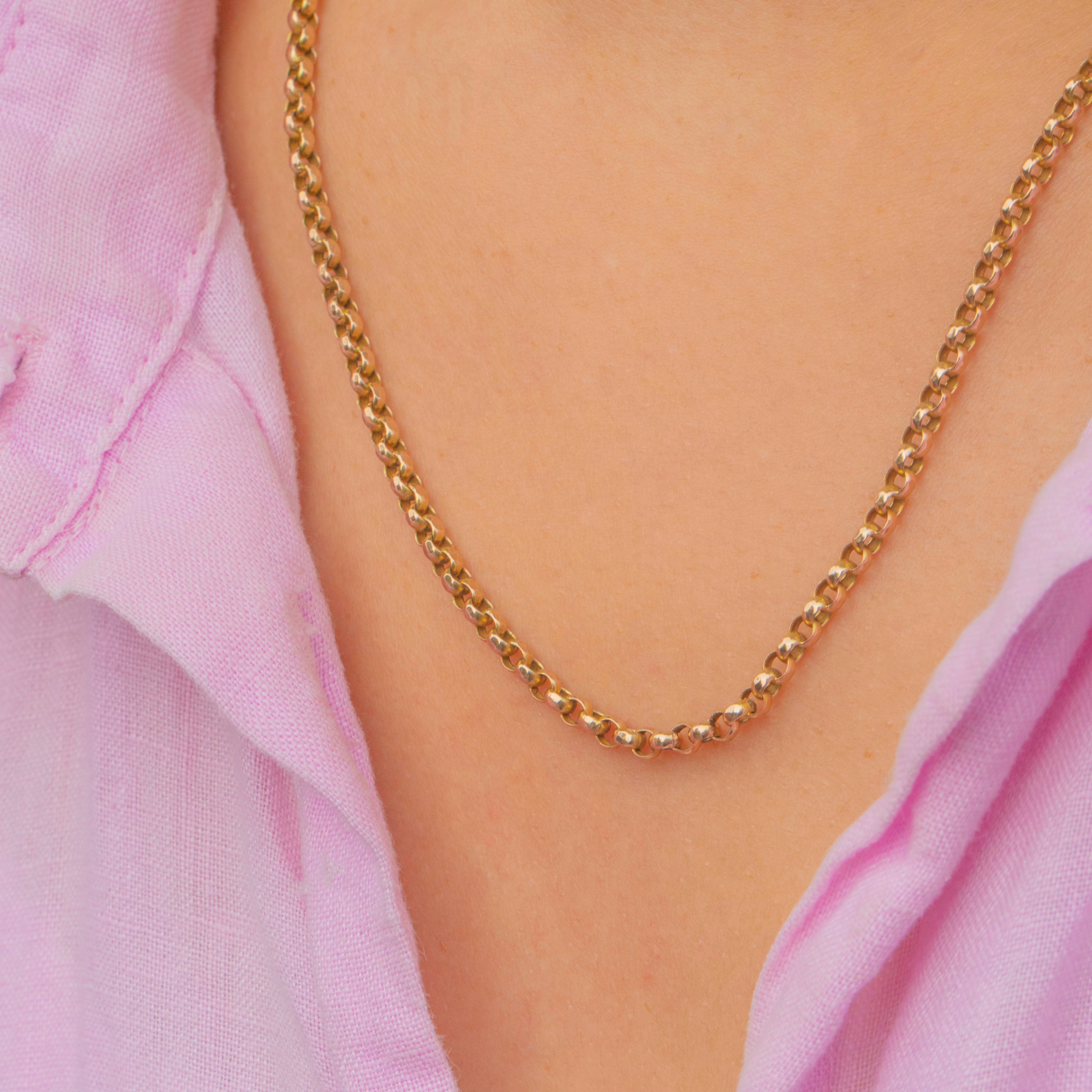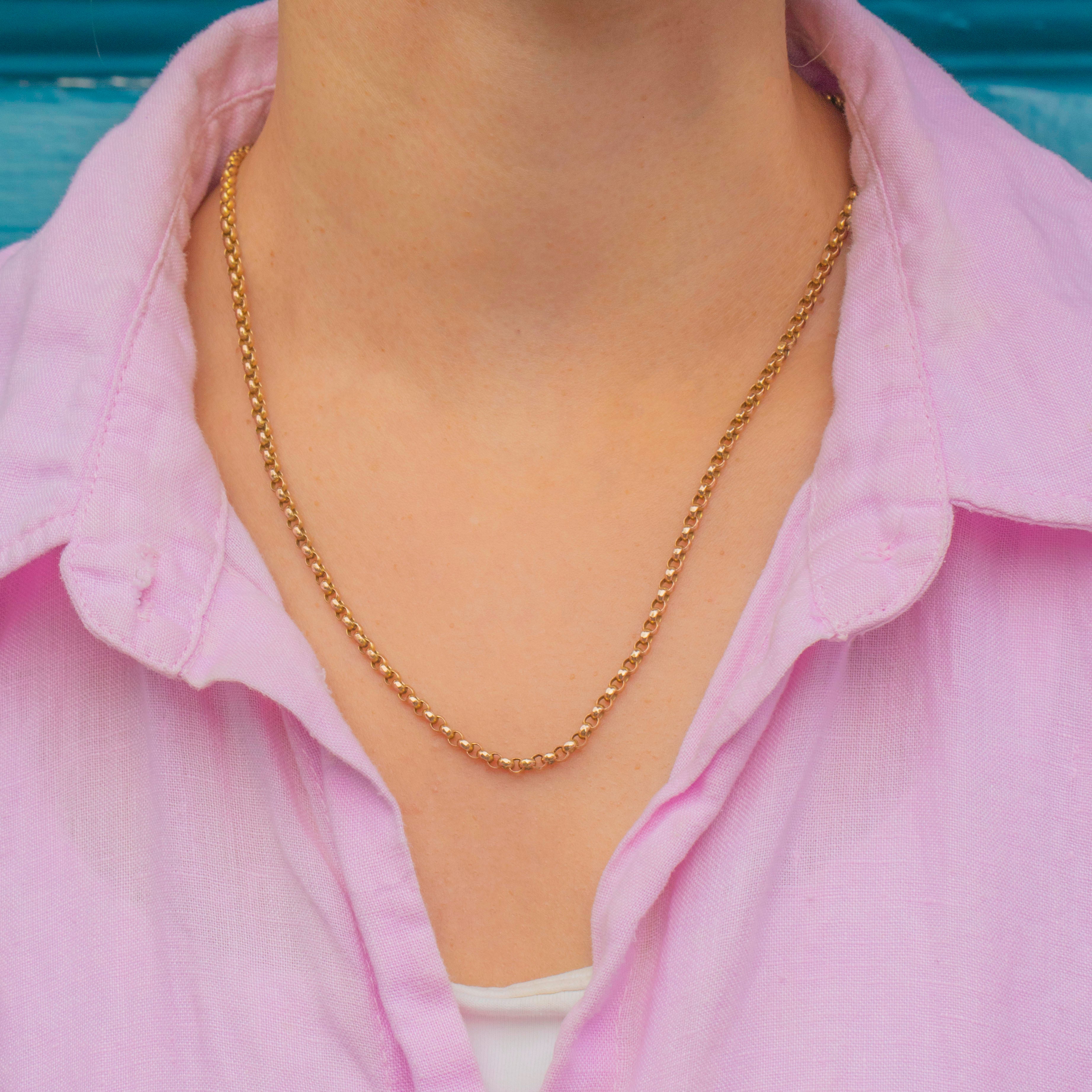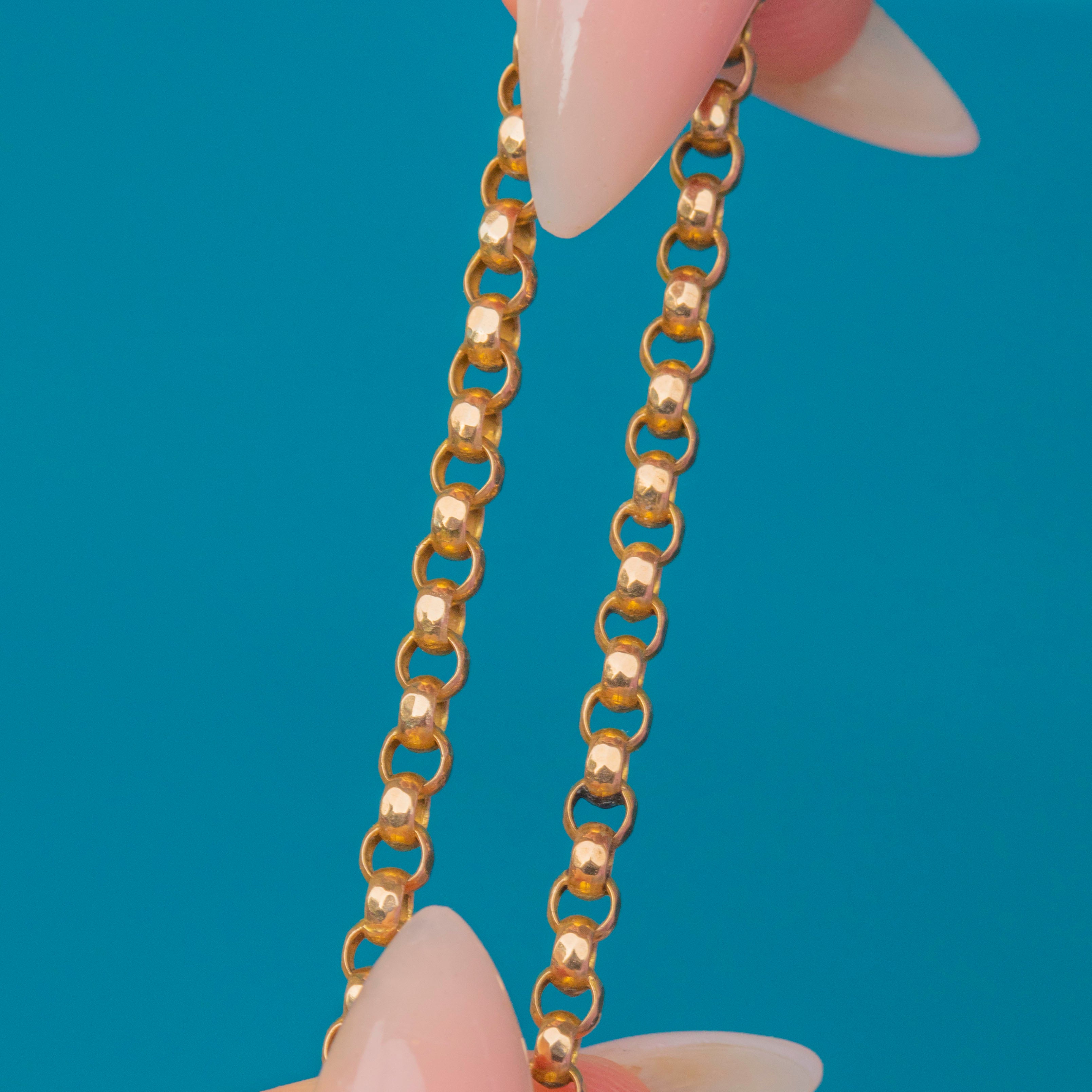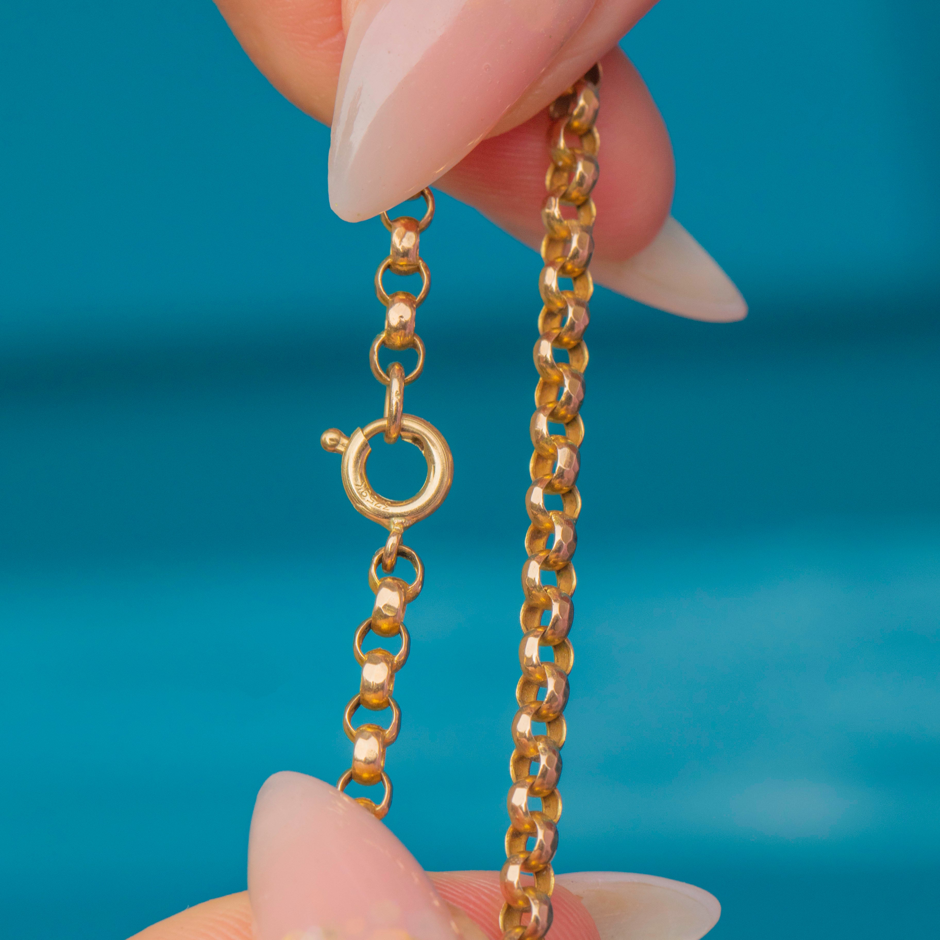 This antique Victorian chain is crafted in rich 9ct Yellow Gold, formed of classic round Belcher links. Measuring 20" in length, the 3mm wide links strike the perfect balance between delicacy and presence, making it a versatile piece to wear alone, layered, or adorned with a pendant or locket.