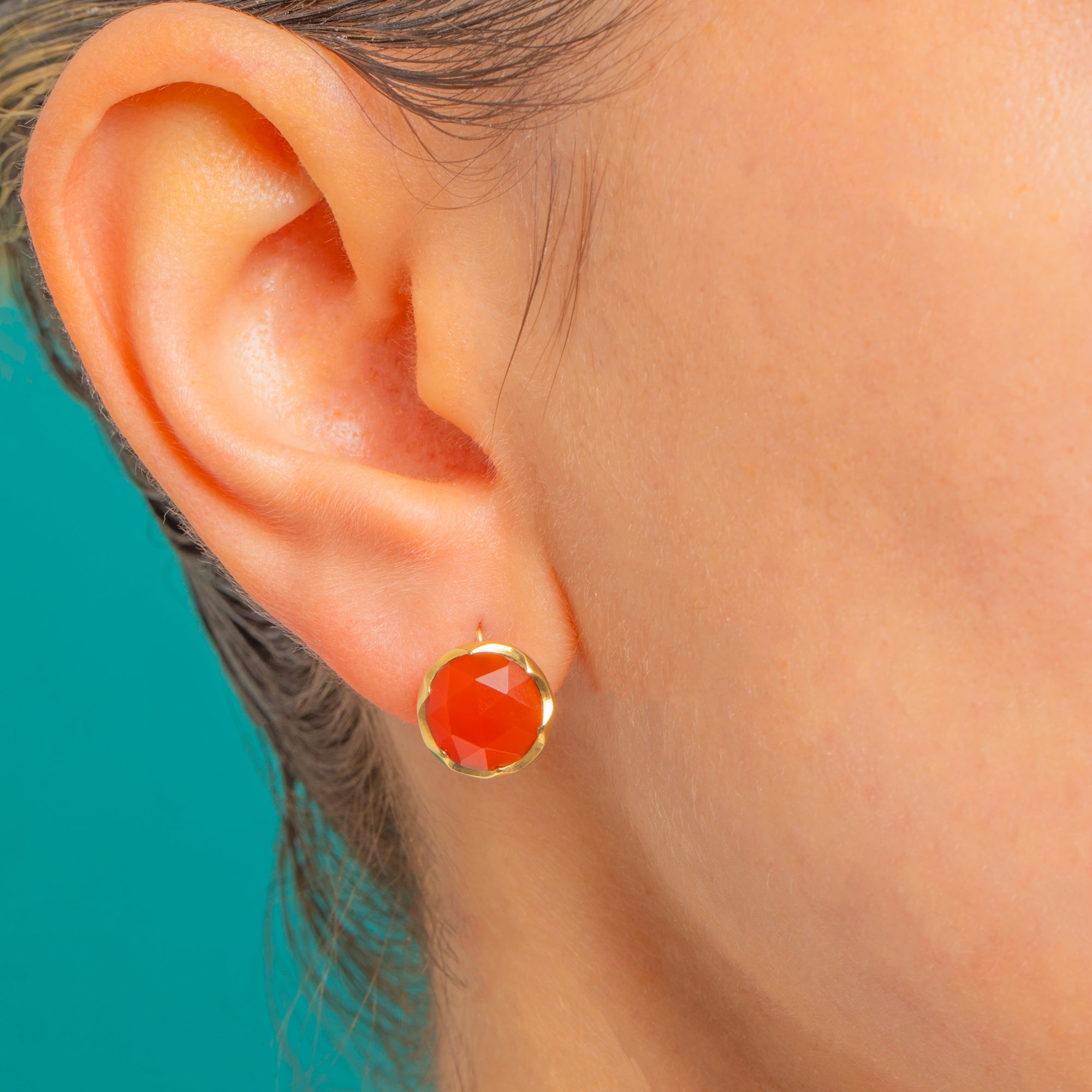 EXCELLENT: Carnelians are bright and lively with crisp facets and no eye-visible chips or abrasions. Gold settings and hooks are smooth and well-preserved with only light surface wear consistent with age. No signs of repair; stones are secure and ready to wear.