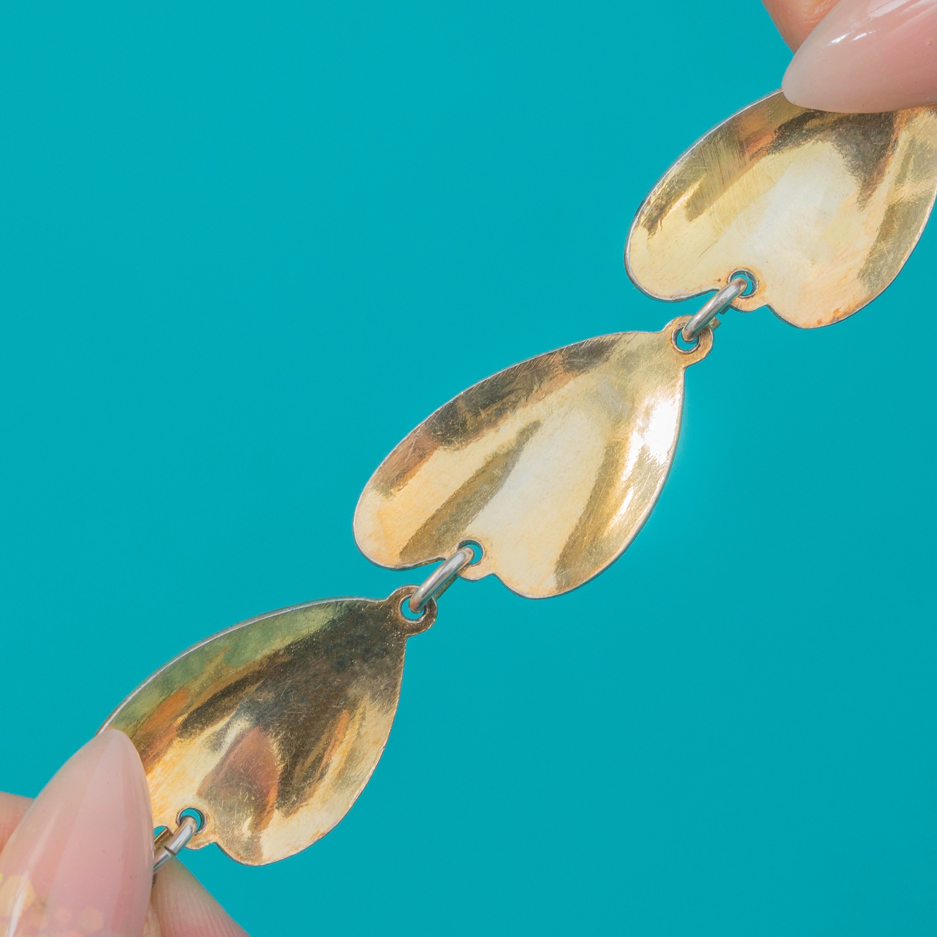 An iconic Mid-20th Century David Andersen enamel leaf bracelet in gilded Silver. The bracelet is formed of a series of softly curved leaves, richly enamelled with vibrant lilypad-green and fine vein detailing that mimic the natural textures of nature & catch the light beautifully.