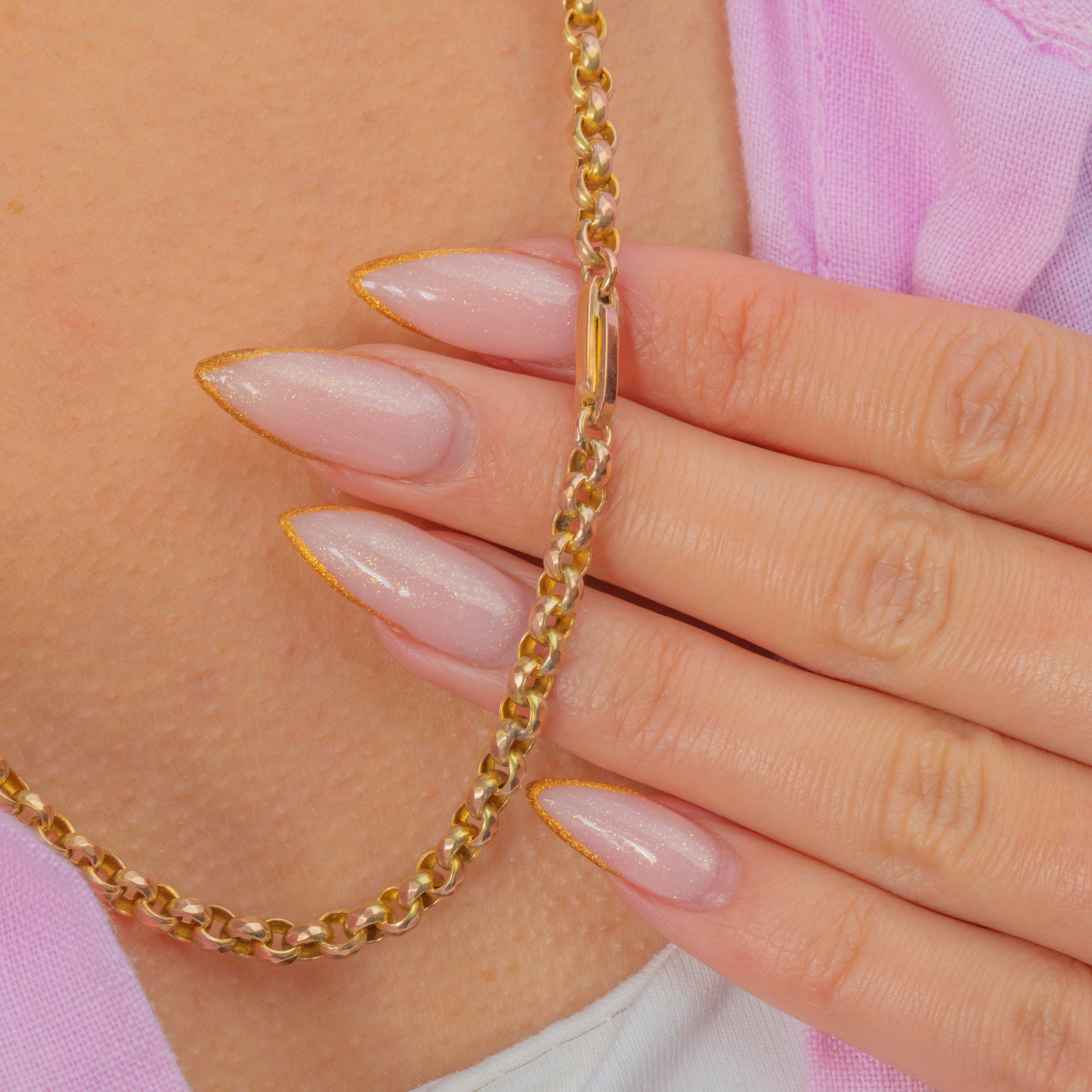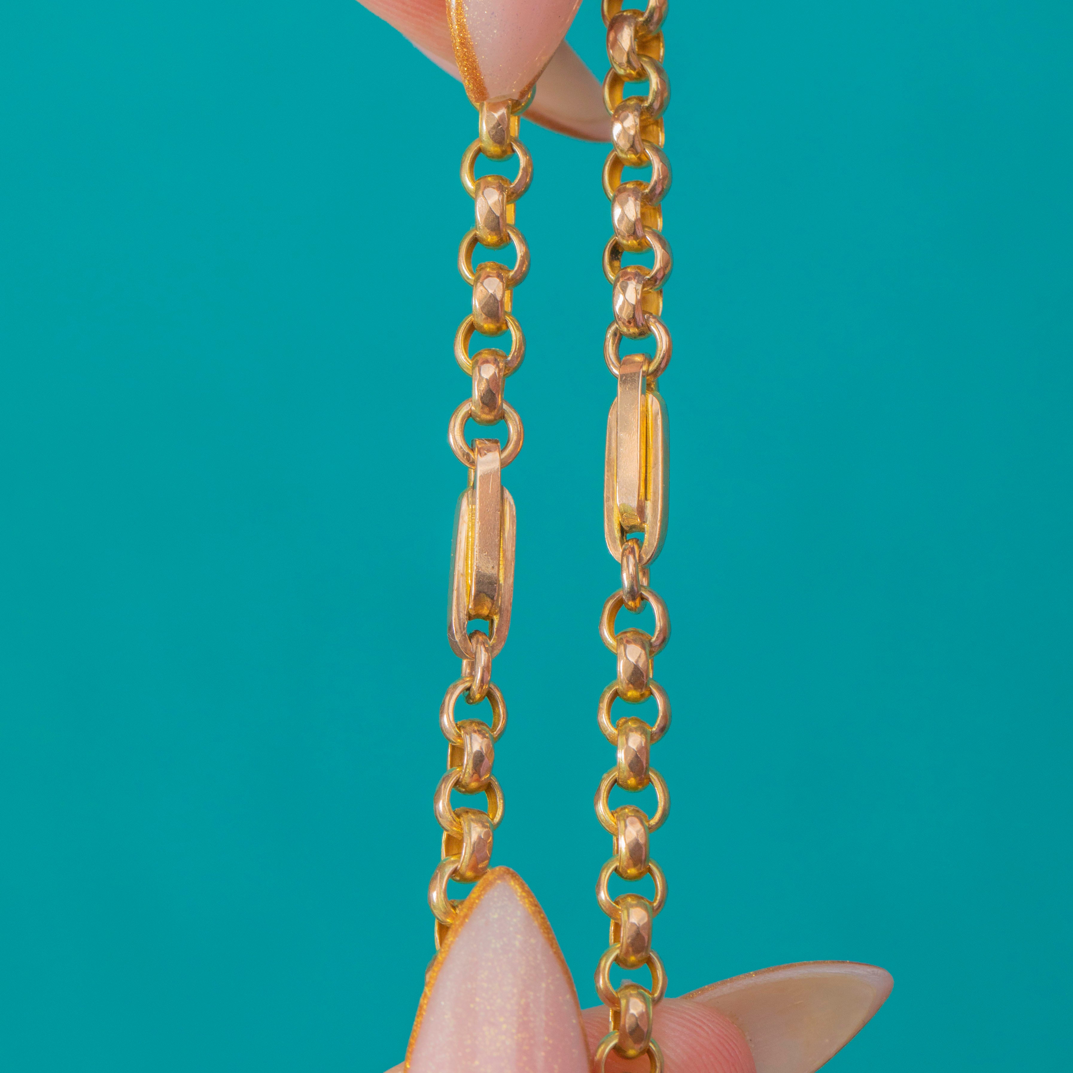 This Antique 9ct Gold belcher and fetter link chain is a timeless Victorian classic, featuring beautifully made alternating links that give it both texture and elegance. At a generous 23.5" length, it’s perfect for wearing alone, layering, or styling with your favourite pendants and lockets.