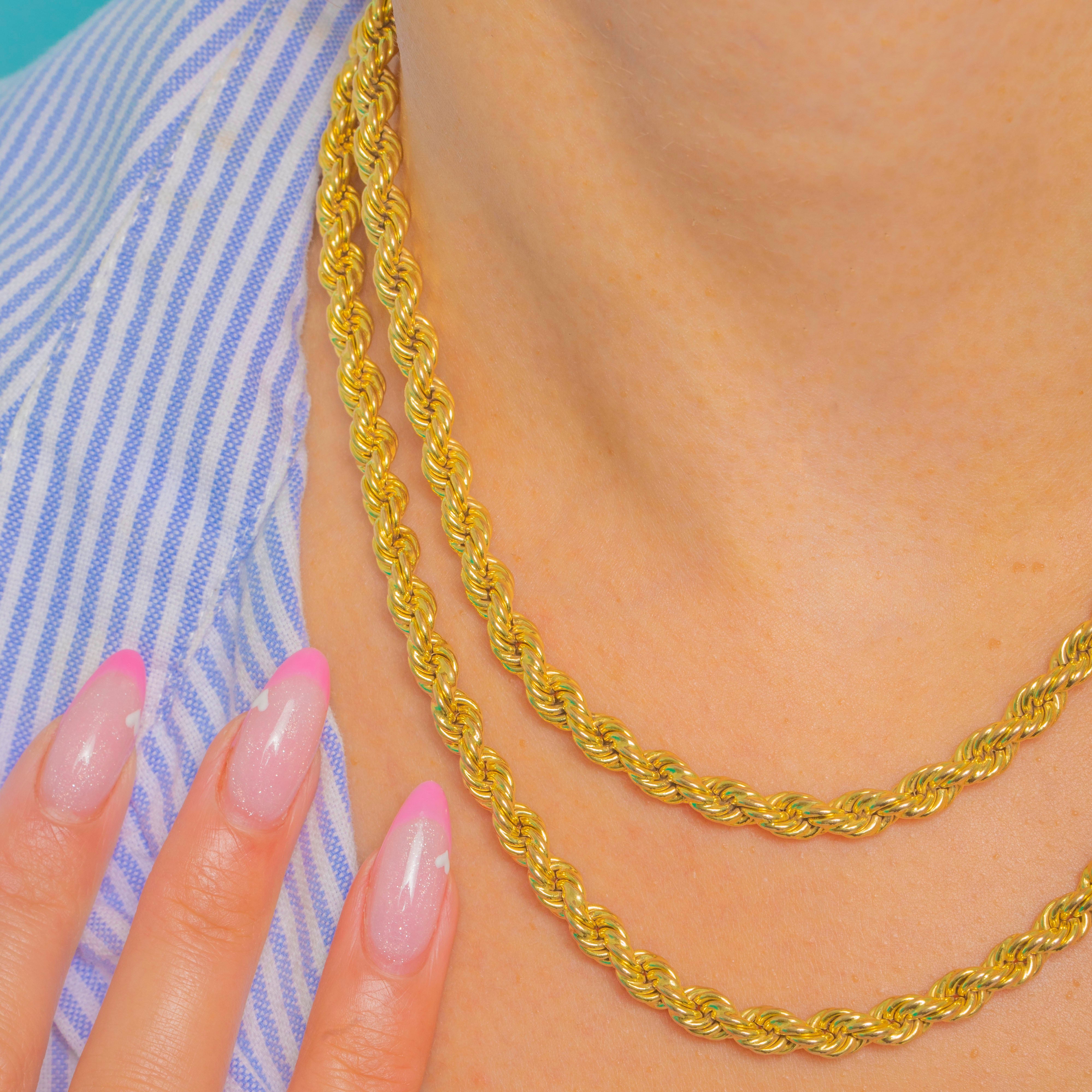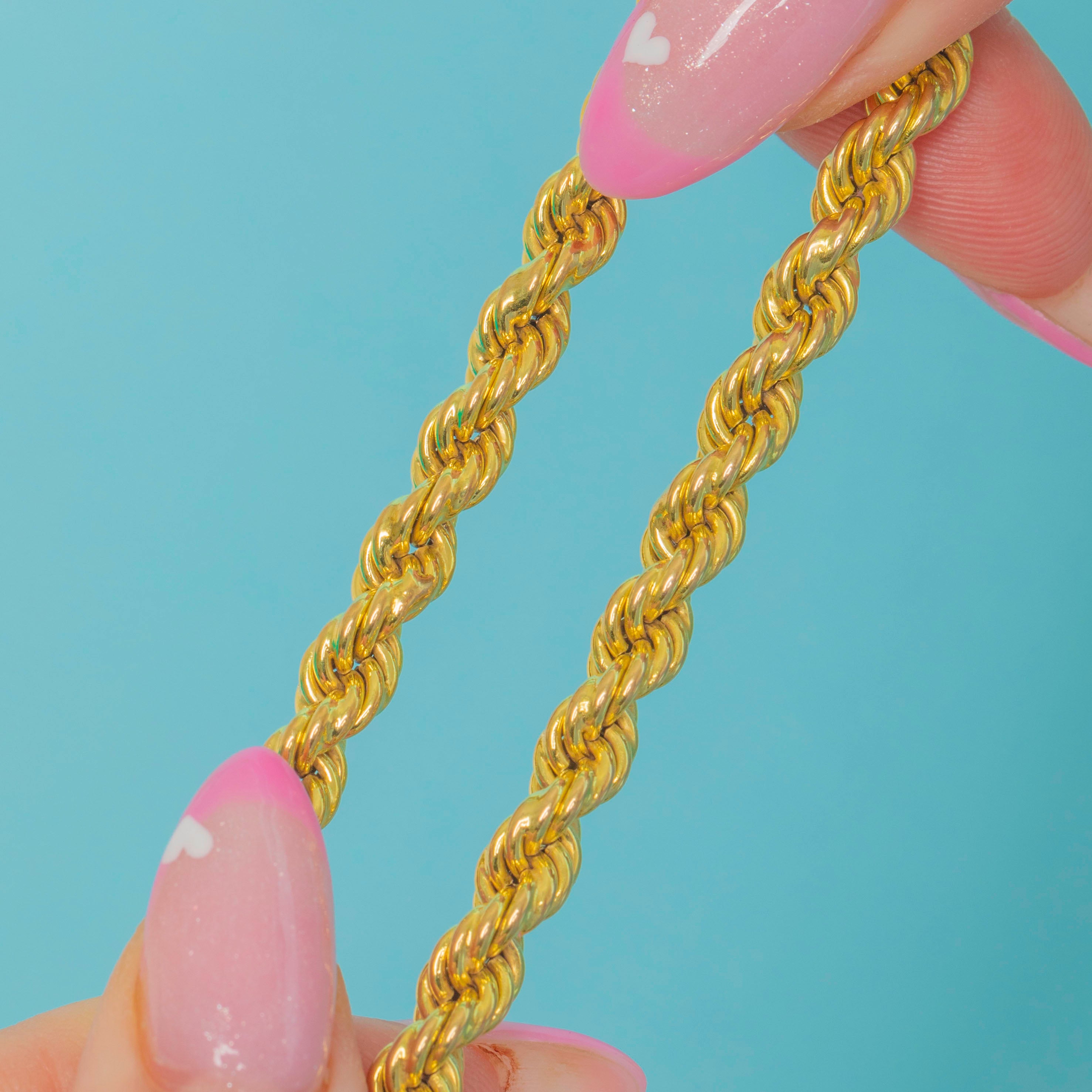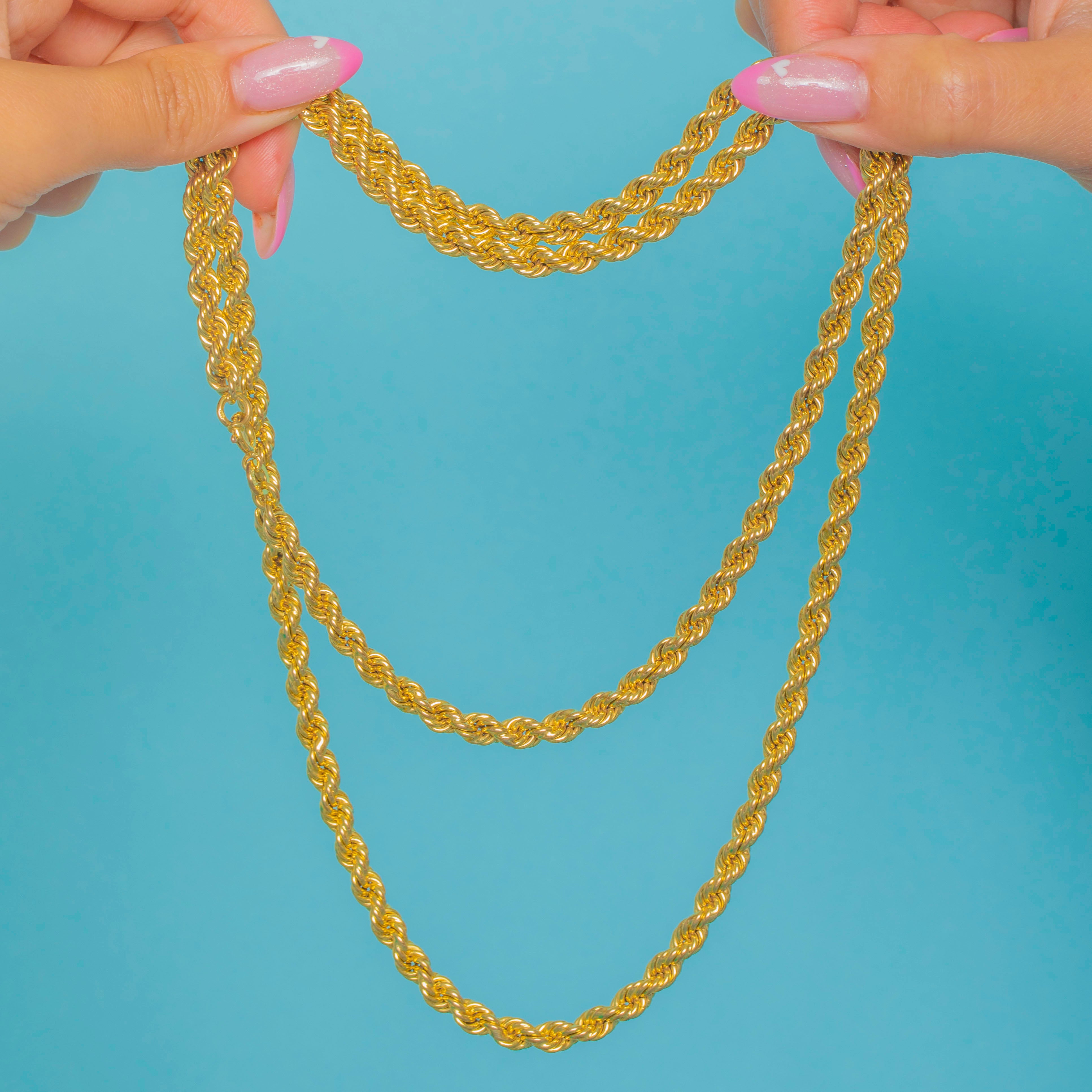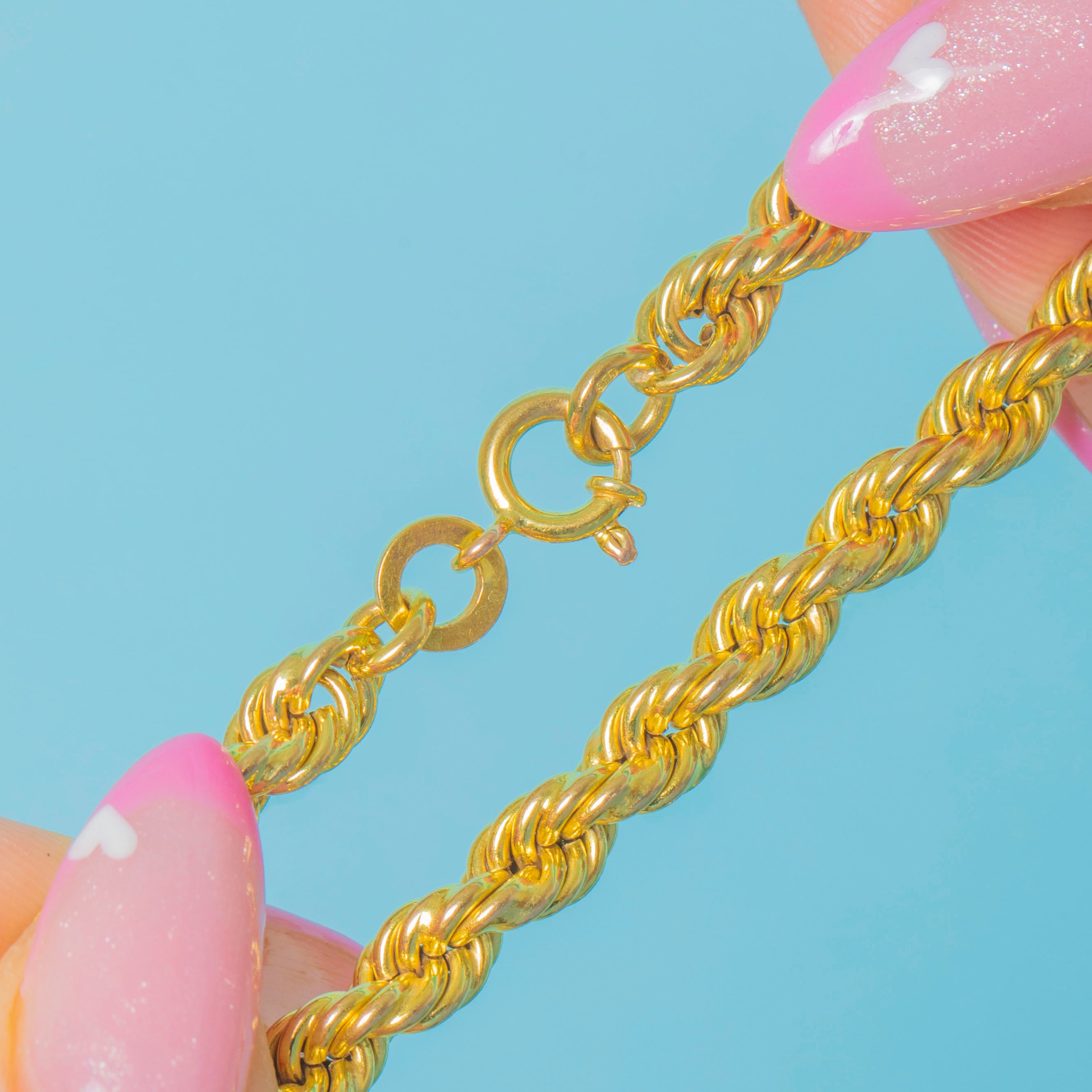 A luxurious and beautifully made 1970s rope chain in solid 9ct Gold, showcasing the classic twisted design that reflects the light from every angle. At a generous 30" length and 5mm thickness, it’s a statement piece that drapes elegantly and exudes vintage glamour.