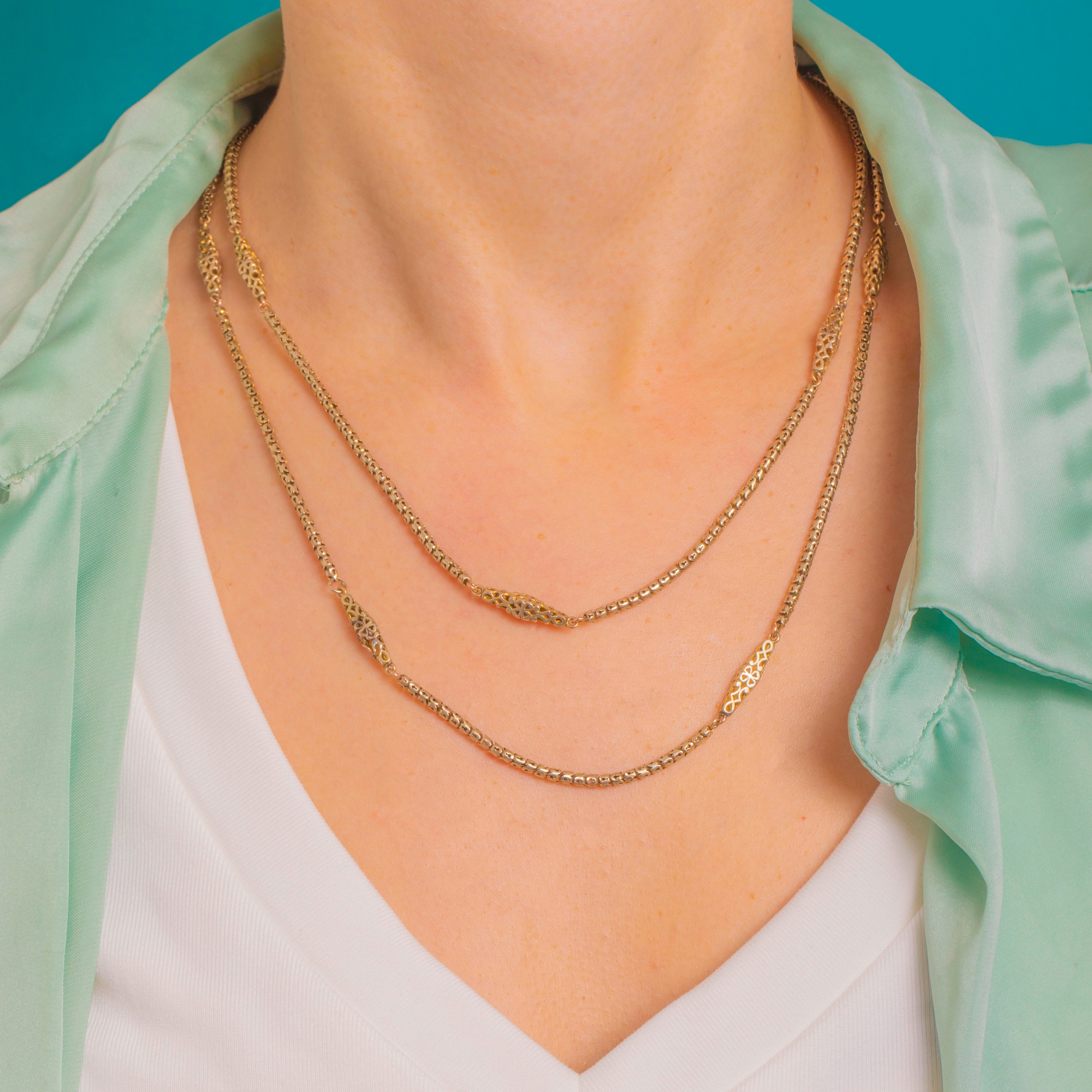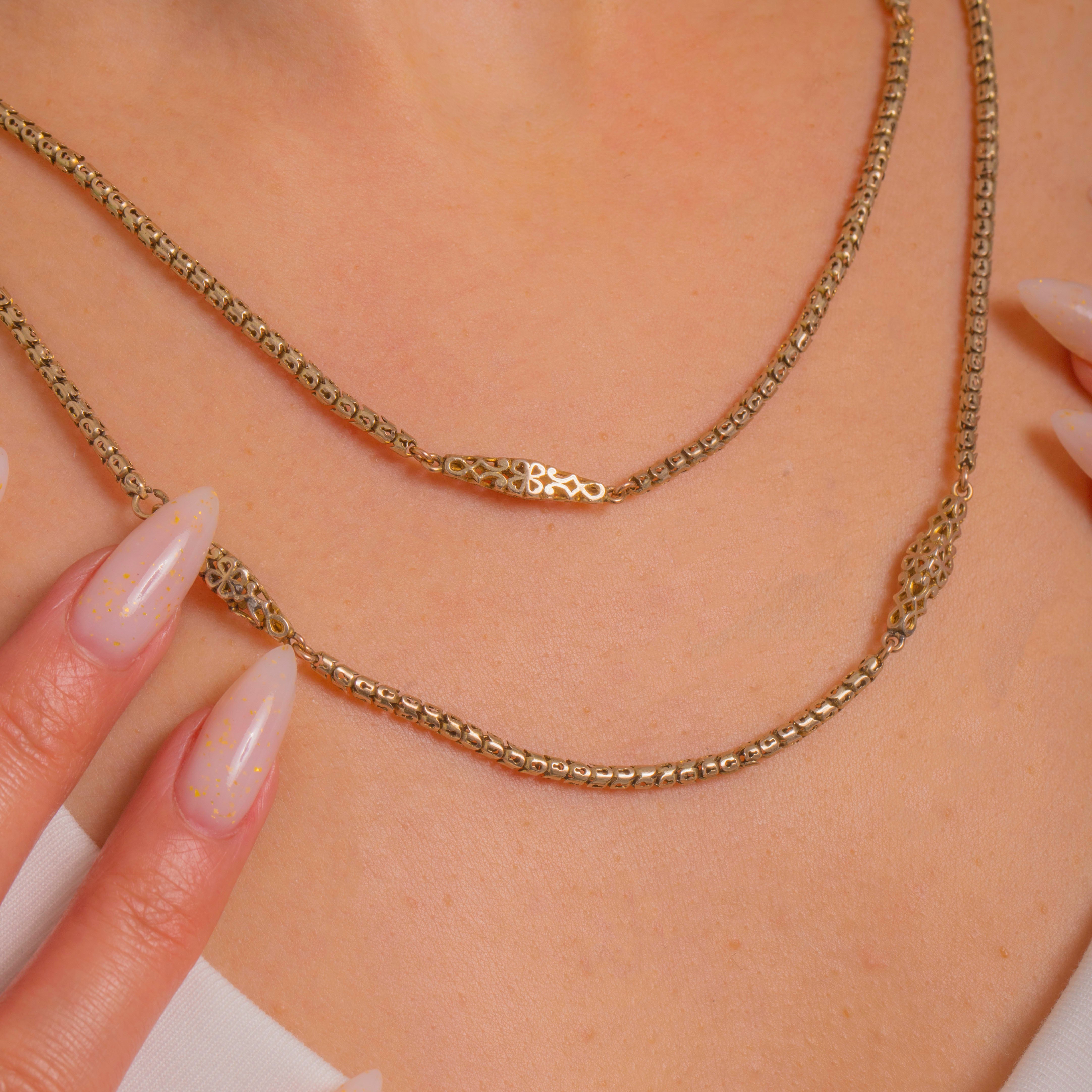 EXCELLENT: Light surface wear and an attractive patina to the Gold, commensurate with age. Pierced details remain crisp with links and stations secure and well-aligned. No visible repairs or alterations noted, and the chain has been well cared for.