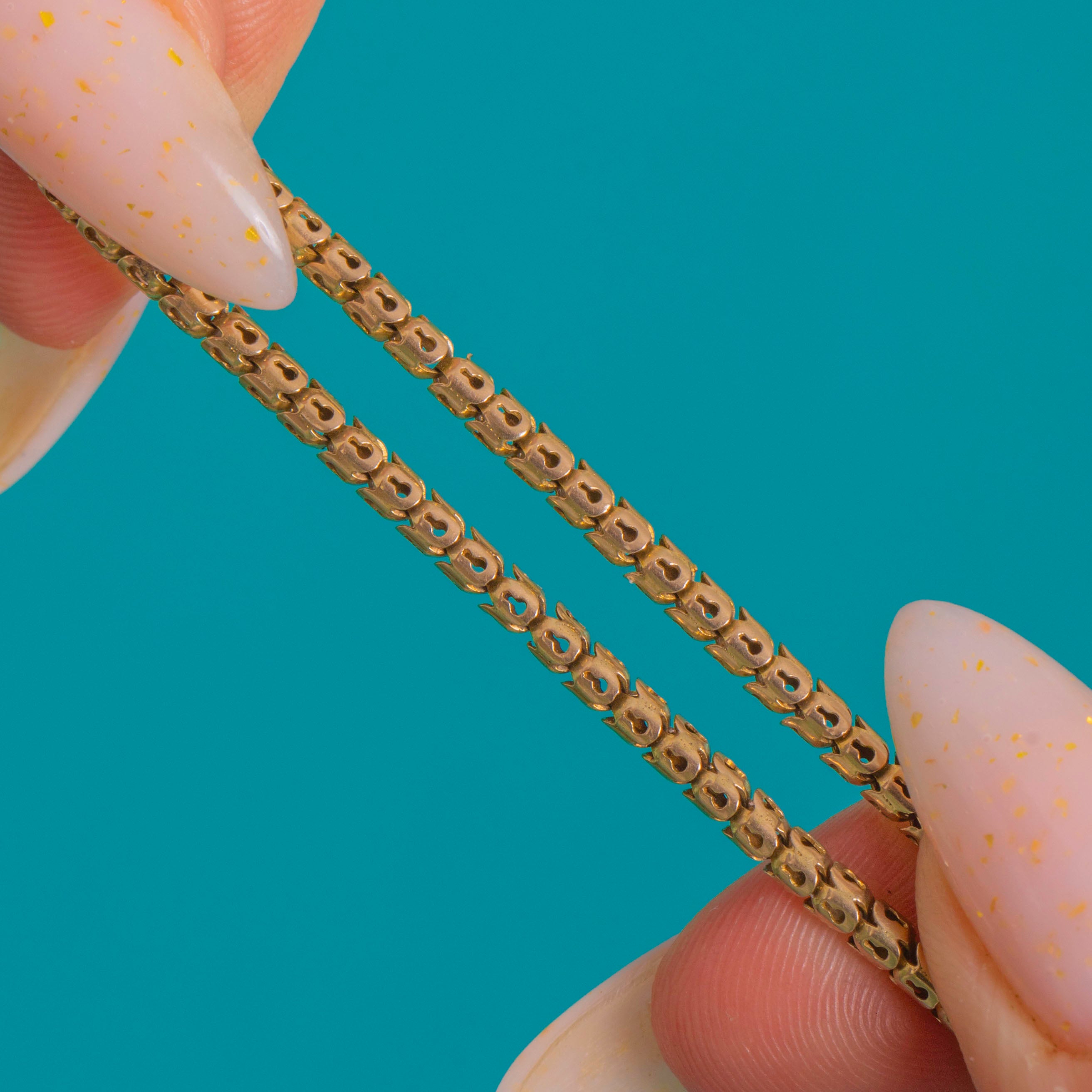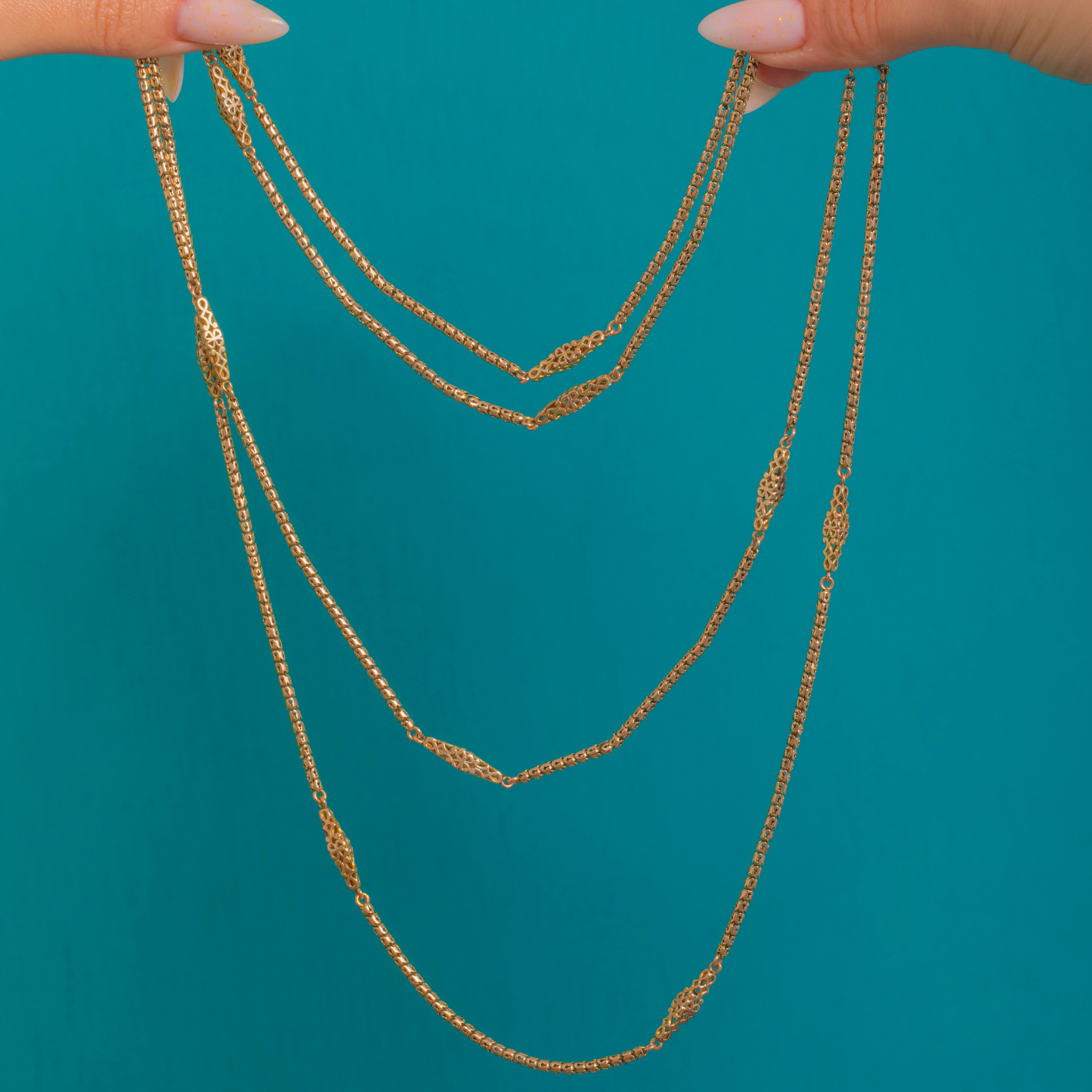 Captivating in its delicacy yet wonderfully wearable, this Victorian 9ct Gold longuard chain is composed of pierced fancy links punctuated by elongated navette openwork stations. The airy lattice and scrollwork give it a refined, decorative rhythm, while the warm glow of 9ct Gold brings a softly luminous finish.