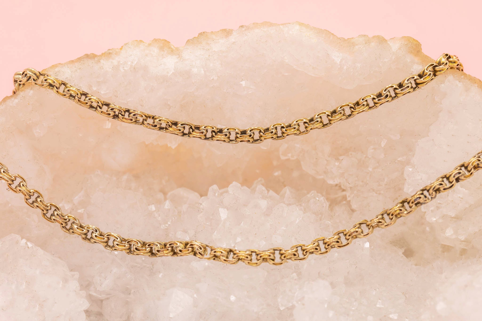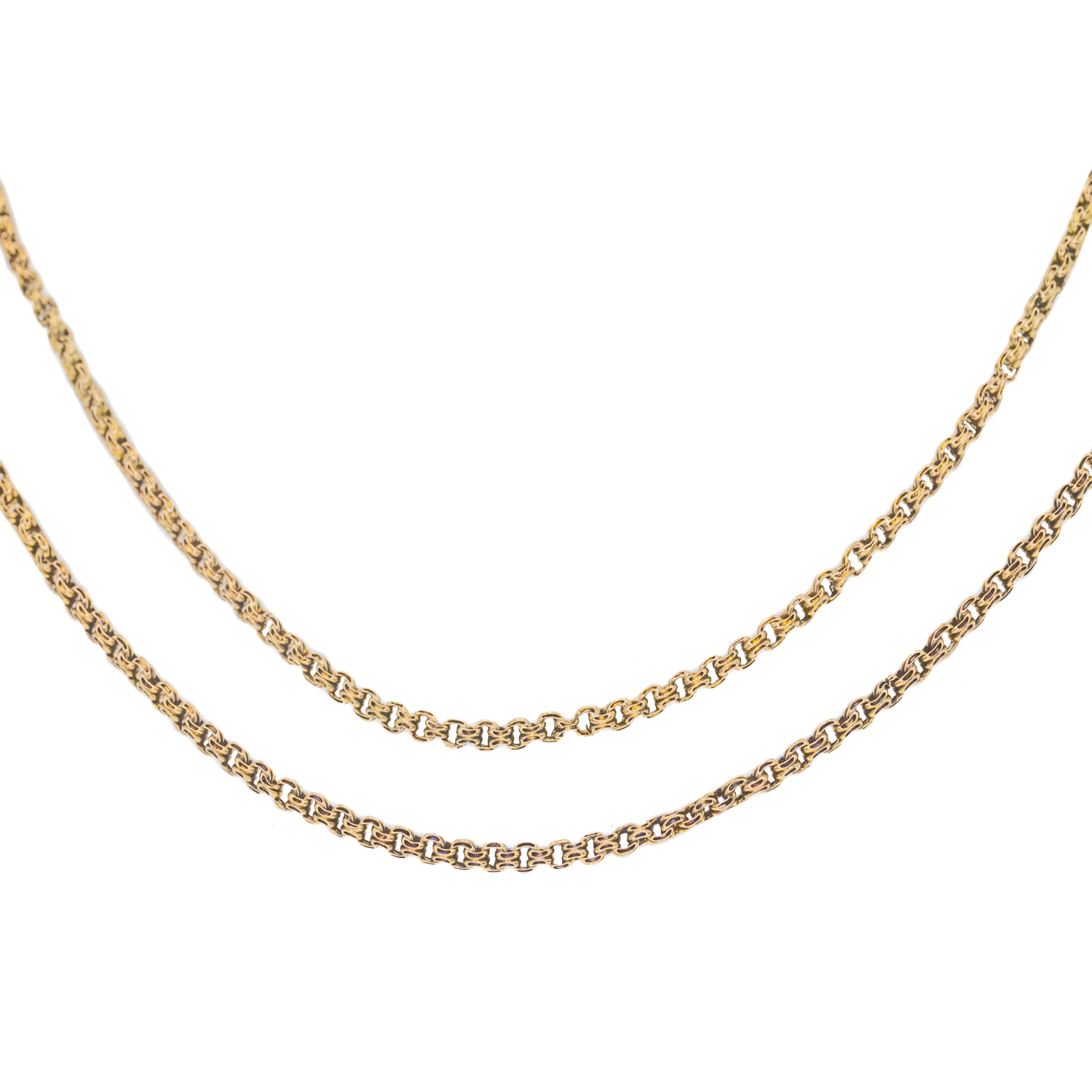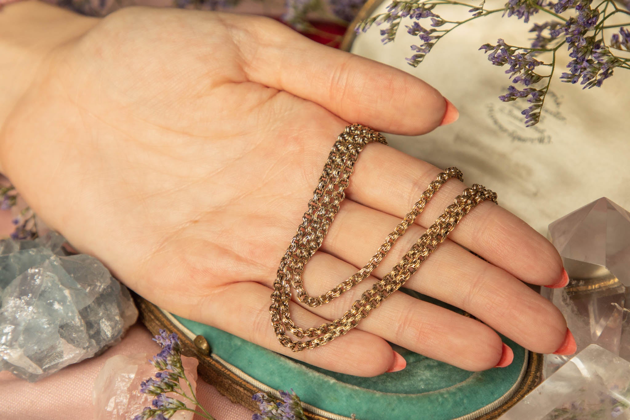 EXCELLENT. This antique 9ct Gold longuard chain is in wonderful condition for her age. Her links are all securely attached for your peace of mind, and there is no clasp to worry about. She'd look great stacked alongside other Gold chains!
