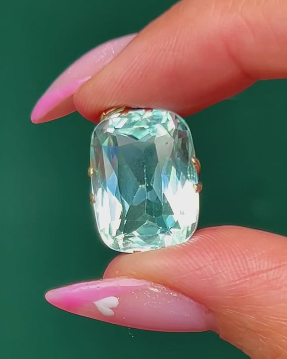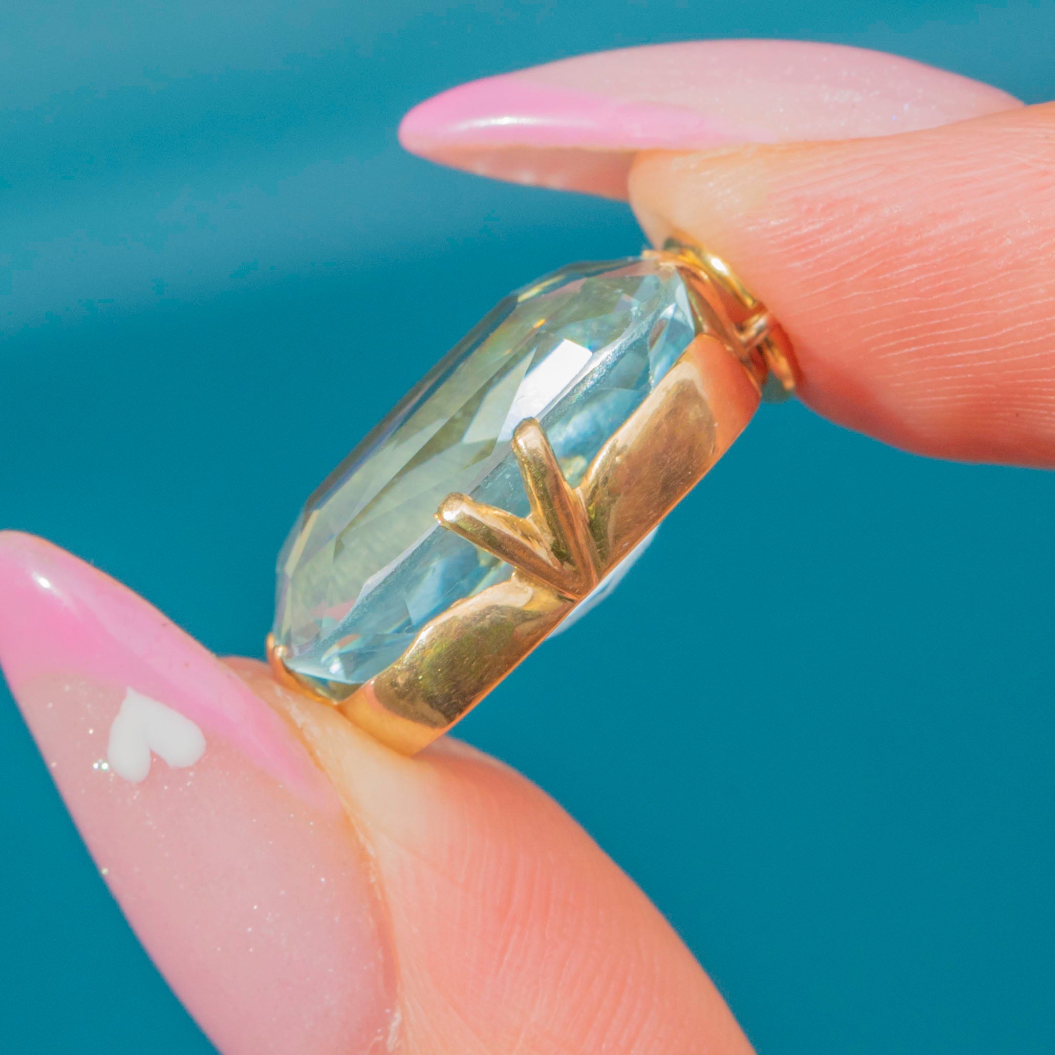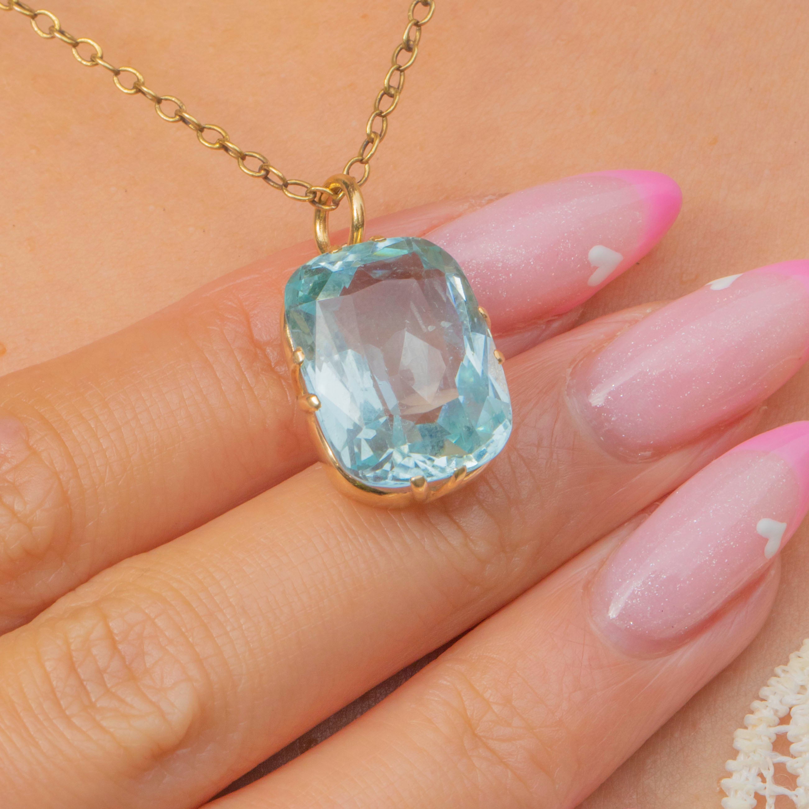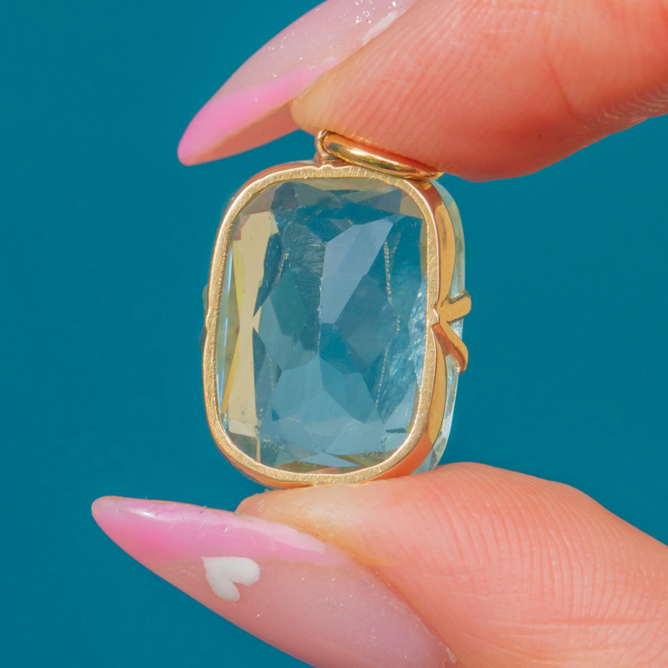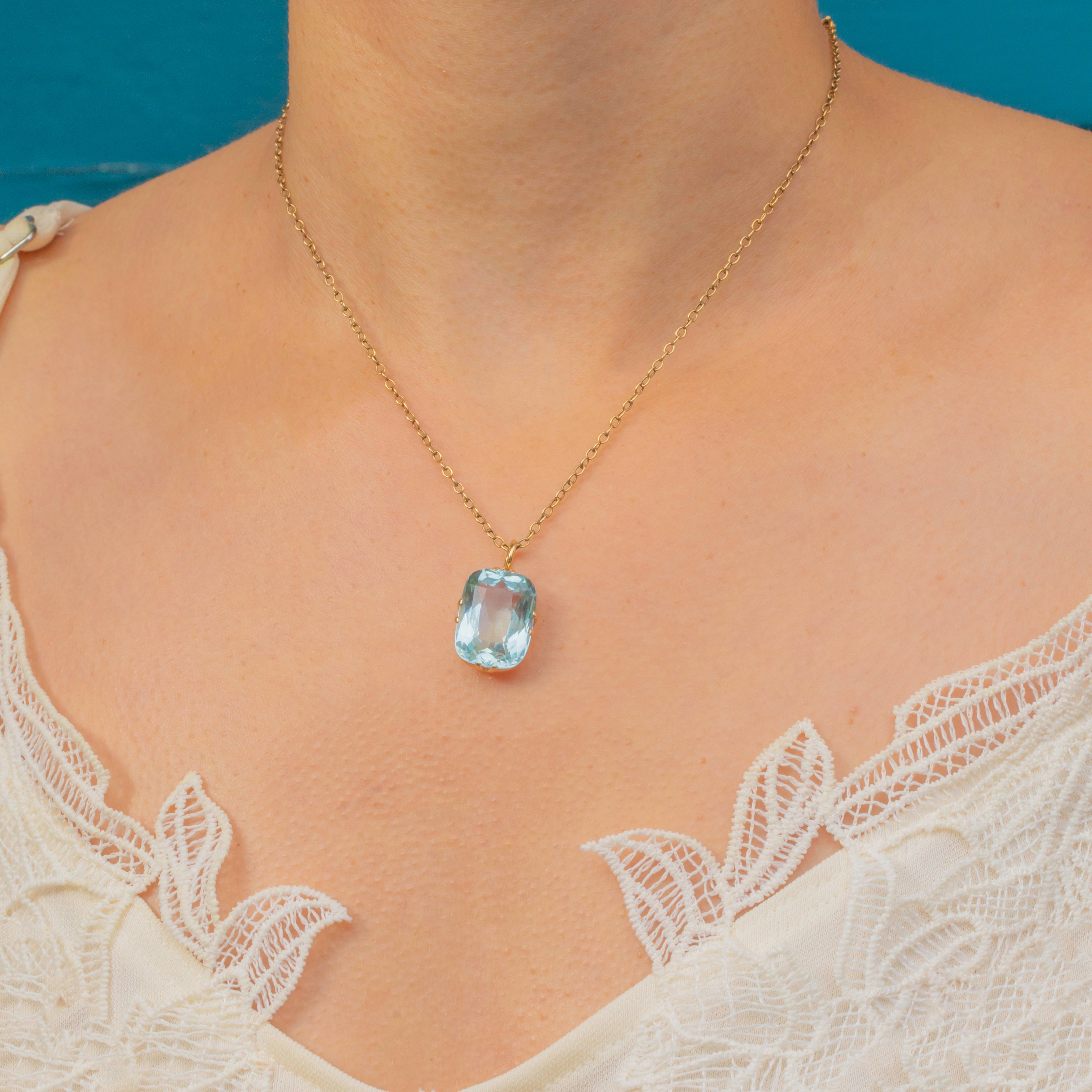 A dazzling Art Deco Aquamarine pendant set in 14ct Gold, radiating the cool sophistication of the era. The large 15.00ct Aquamarine displays a crisp, icy blue hue and beautiful transparency, its clean geometric cut capturing the light from every angle.