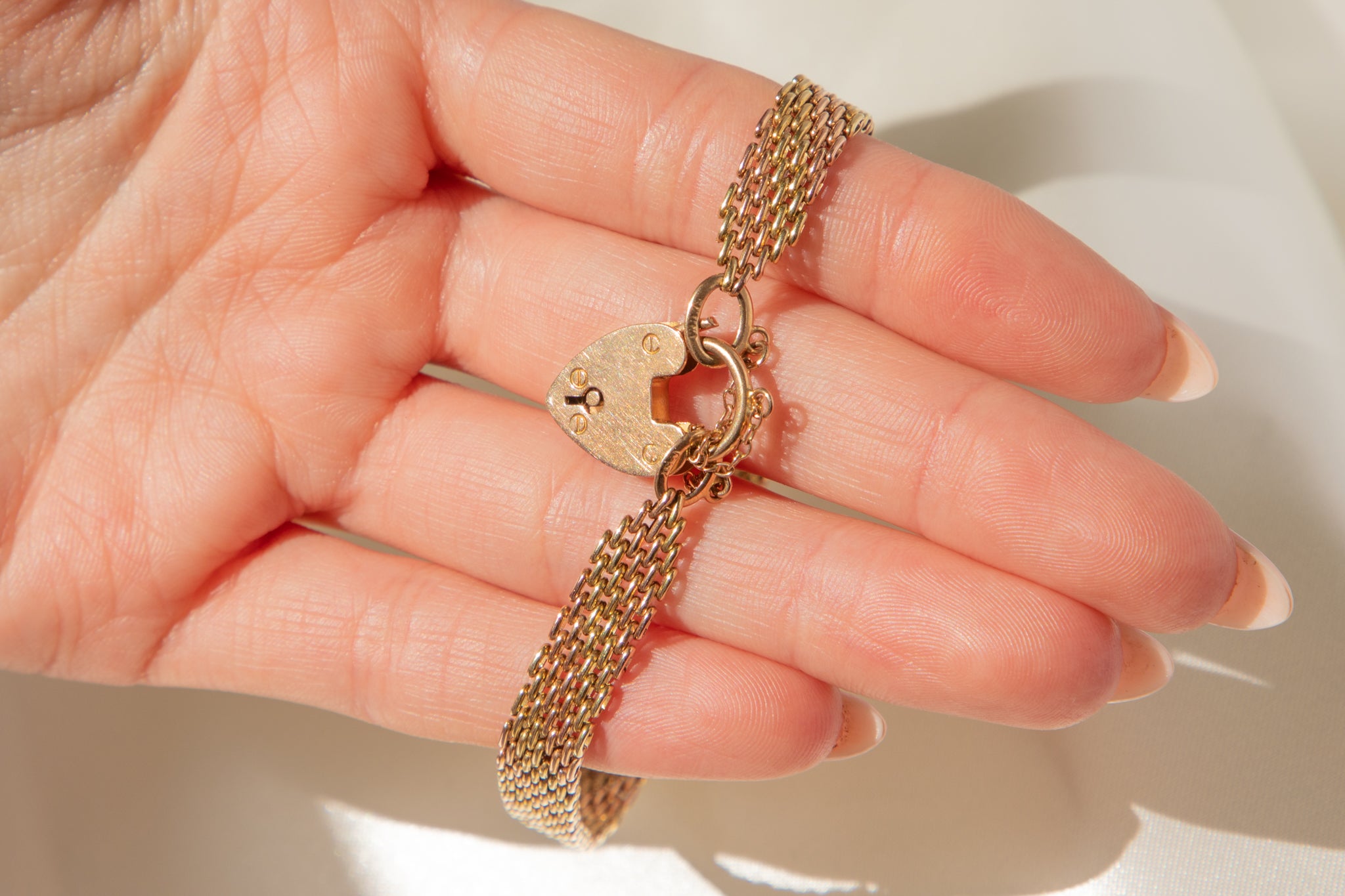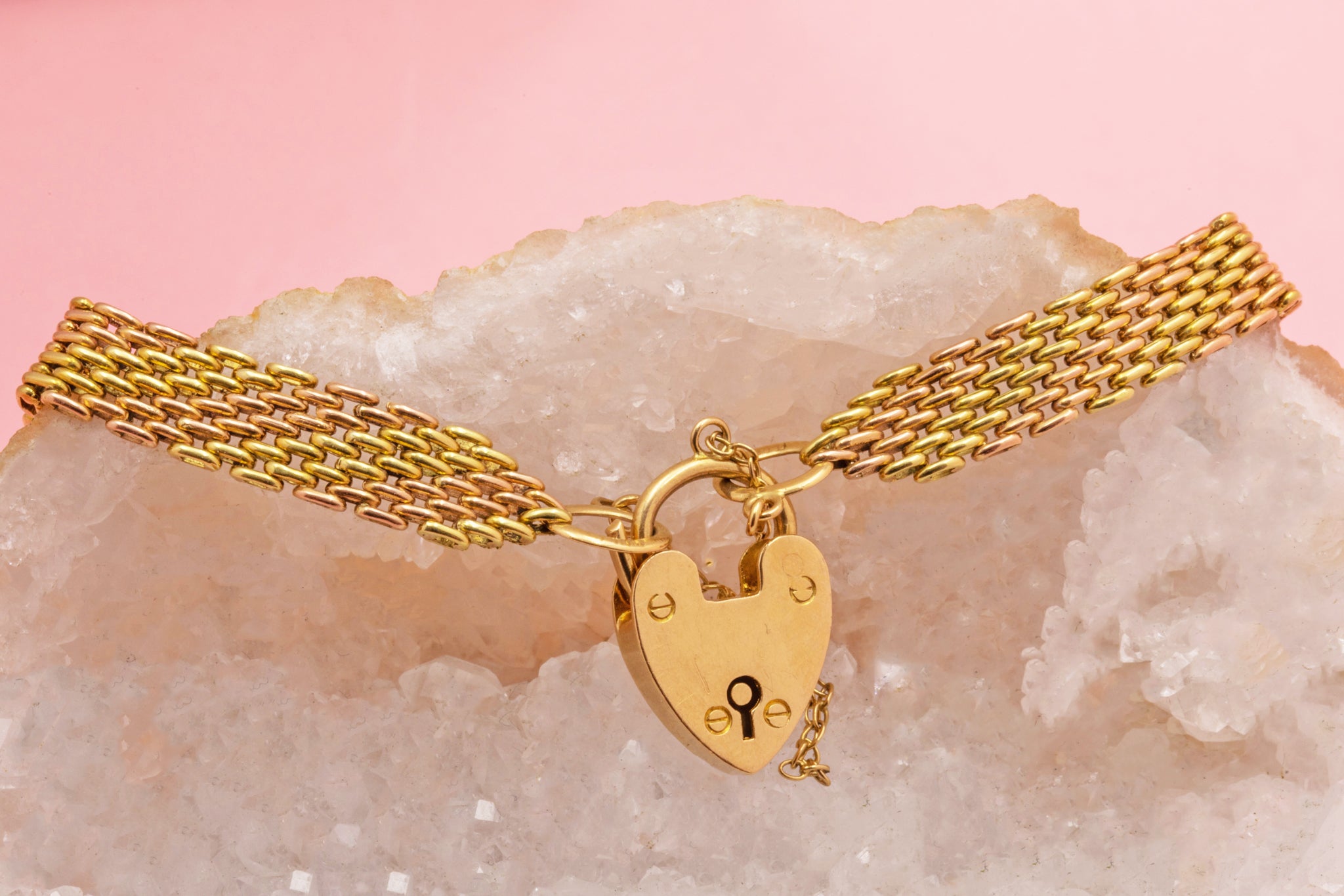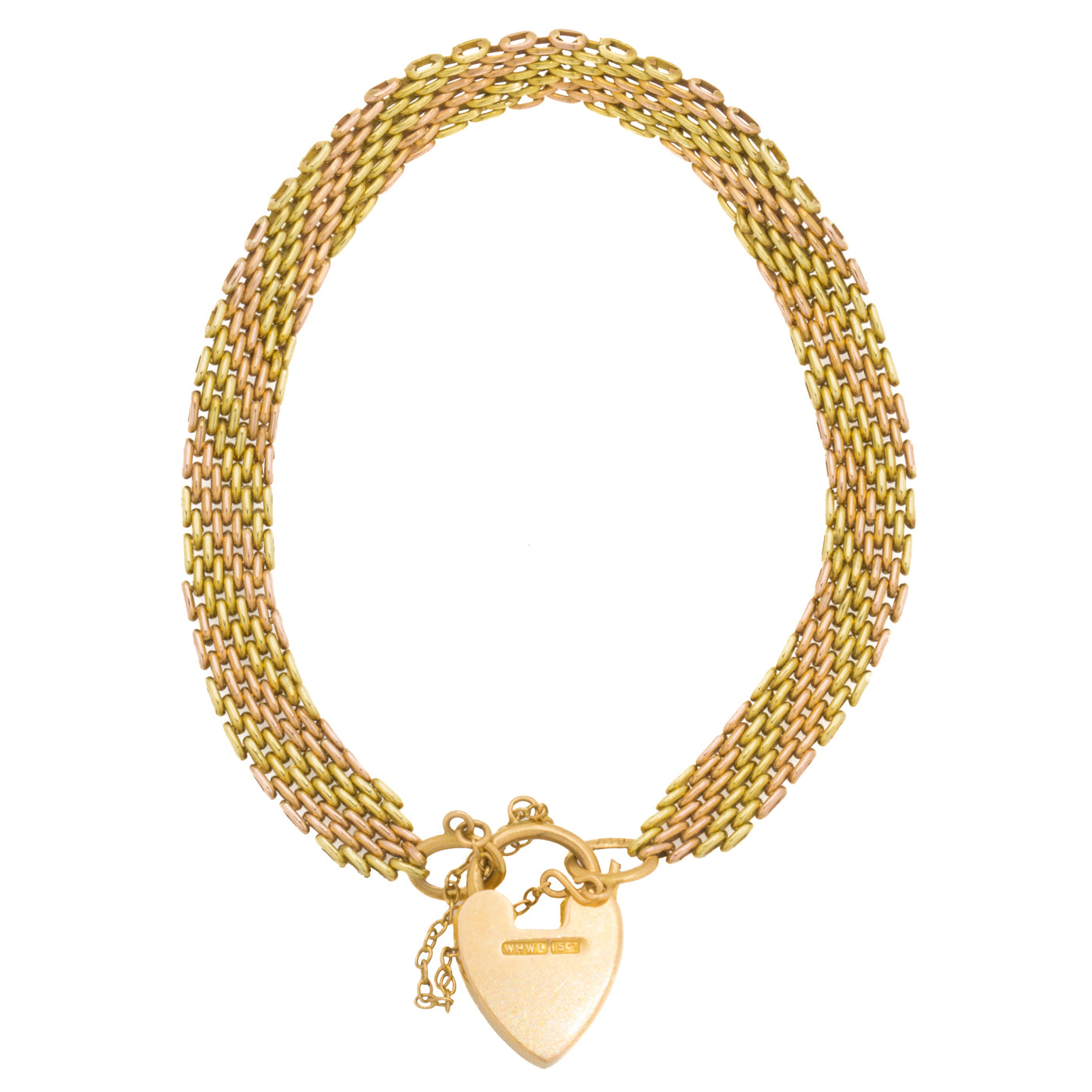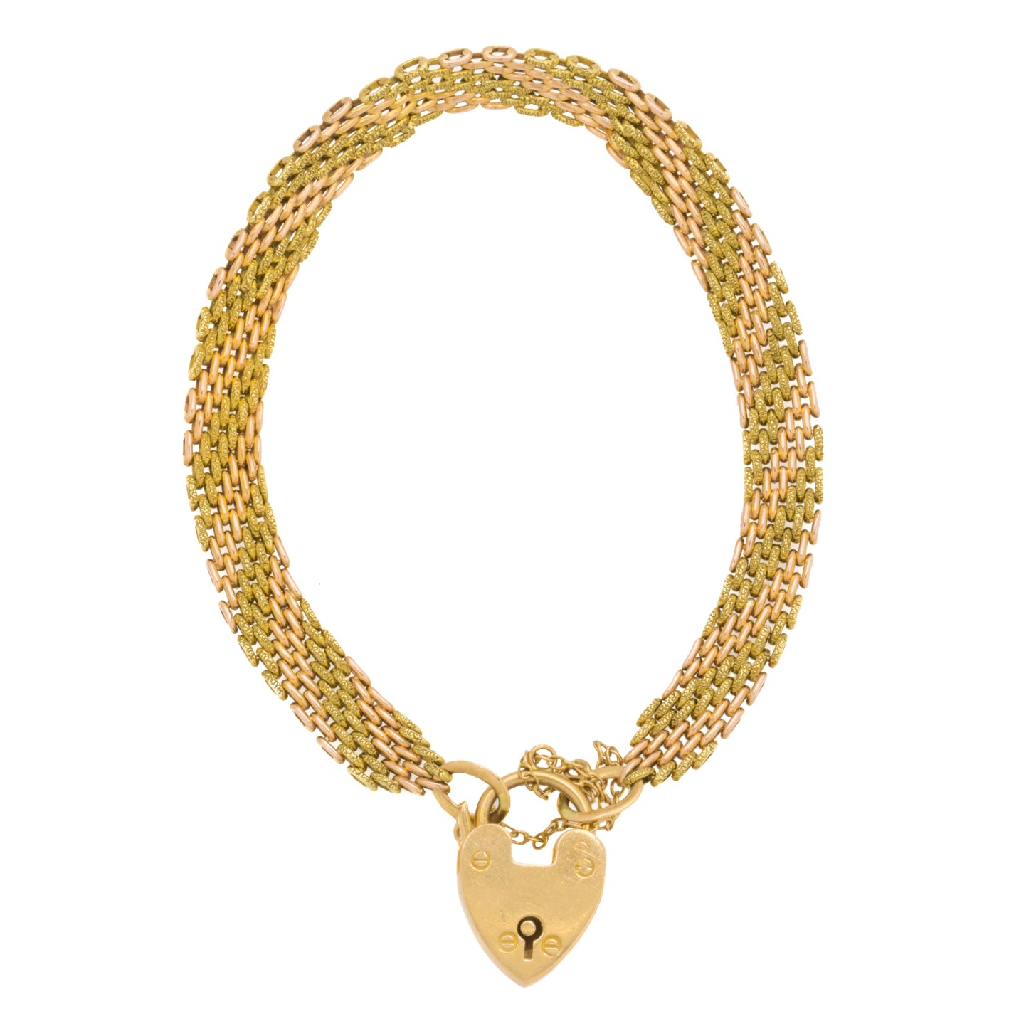 A gorgeous 7" antique 15ct yellow Gold and rose Gold gate bracelet complete with a heart padlock. The textural links crafted from both rose and yellow Gold add a unique touch that we simply adore!