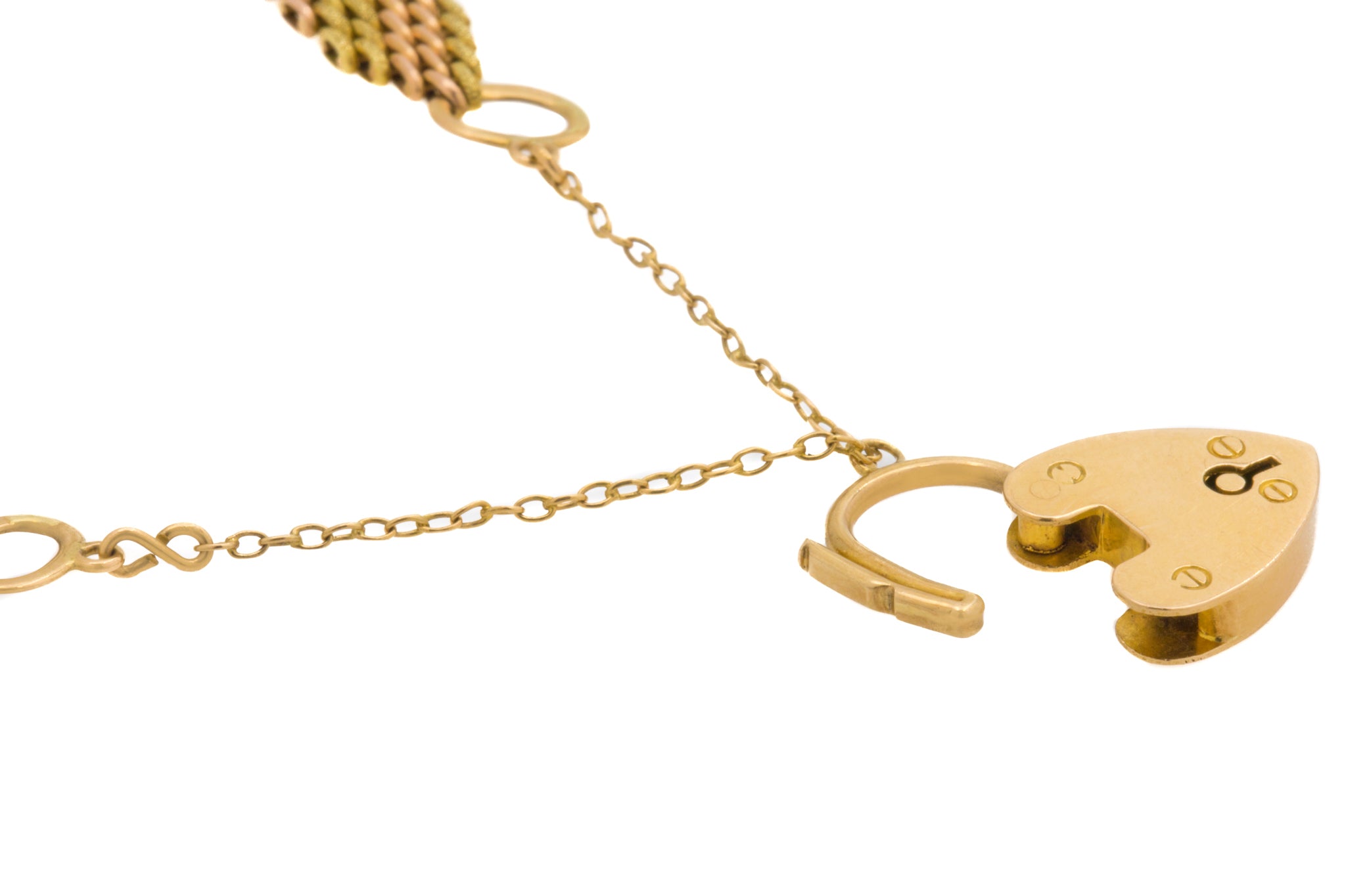 7" Antique 15ct Yellow Gold & Rose Gold Gate Bracelet, Heart Padlock, 16.1g