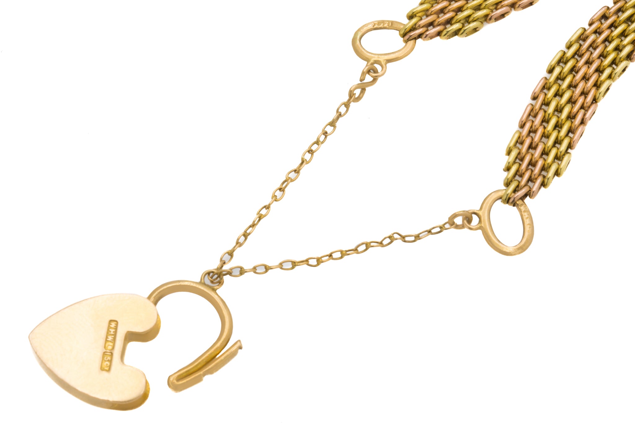 STAMPS: "15", "WHWLD" is stamped both on the back of the heart padlock & on the oval links that connect the bracelet to the padlock.
