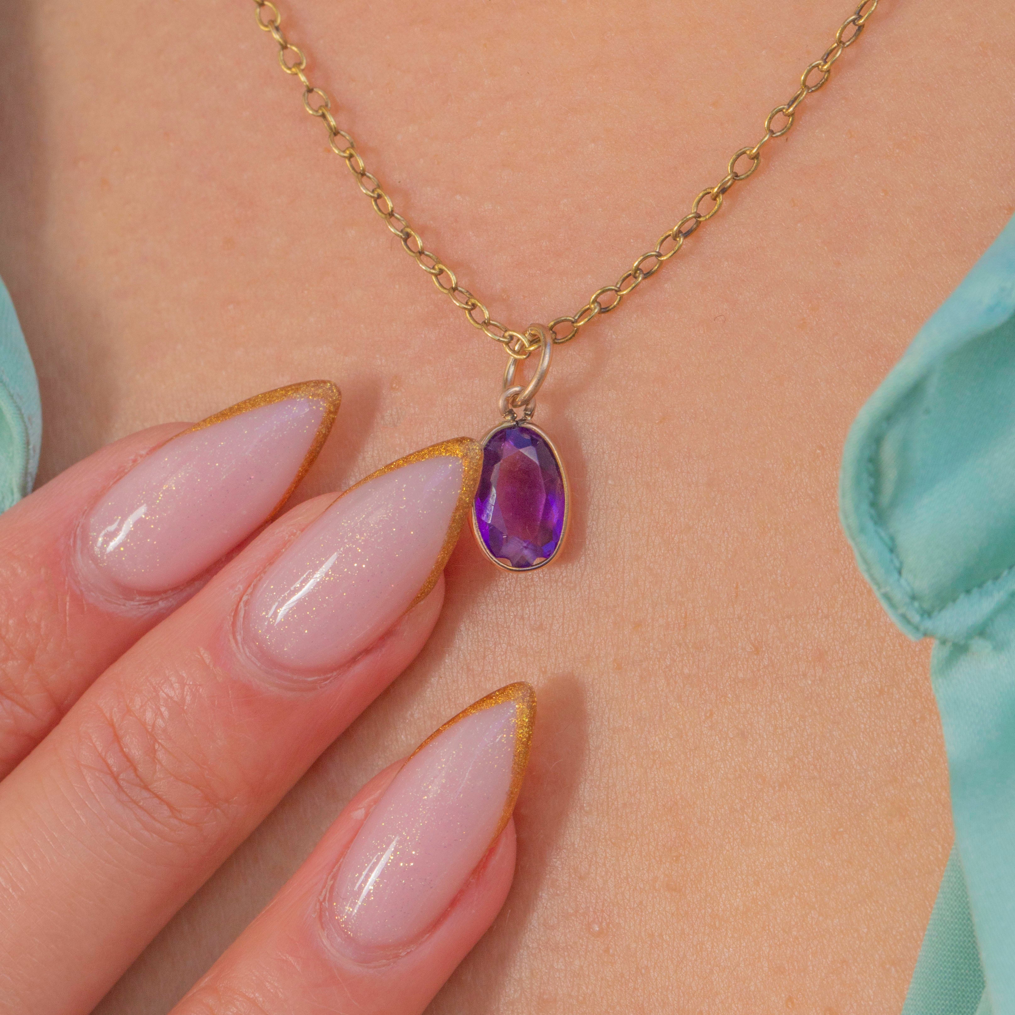This sleek 9ct Gold charm showcases a lush oval Amethyst in a minimalist bezel, letting that vivid purple glow take centre stage. The stone has gorgeous internal flashes and a rich colour that looks beautiful worn alone or layered with your favourite pendants.