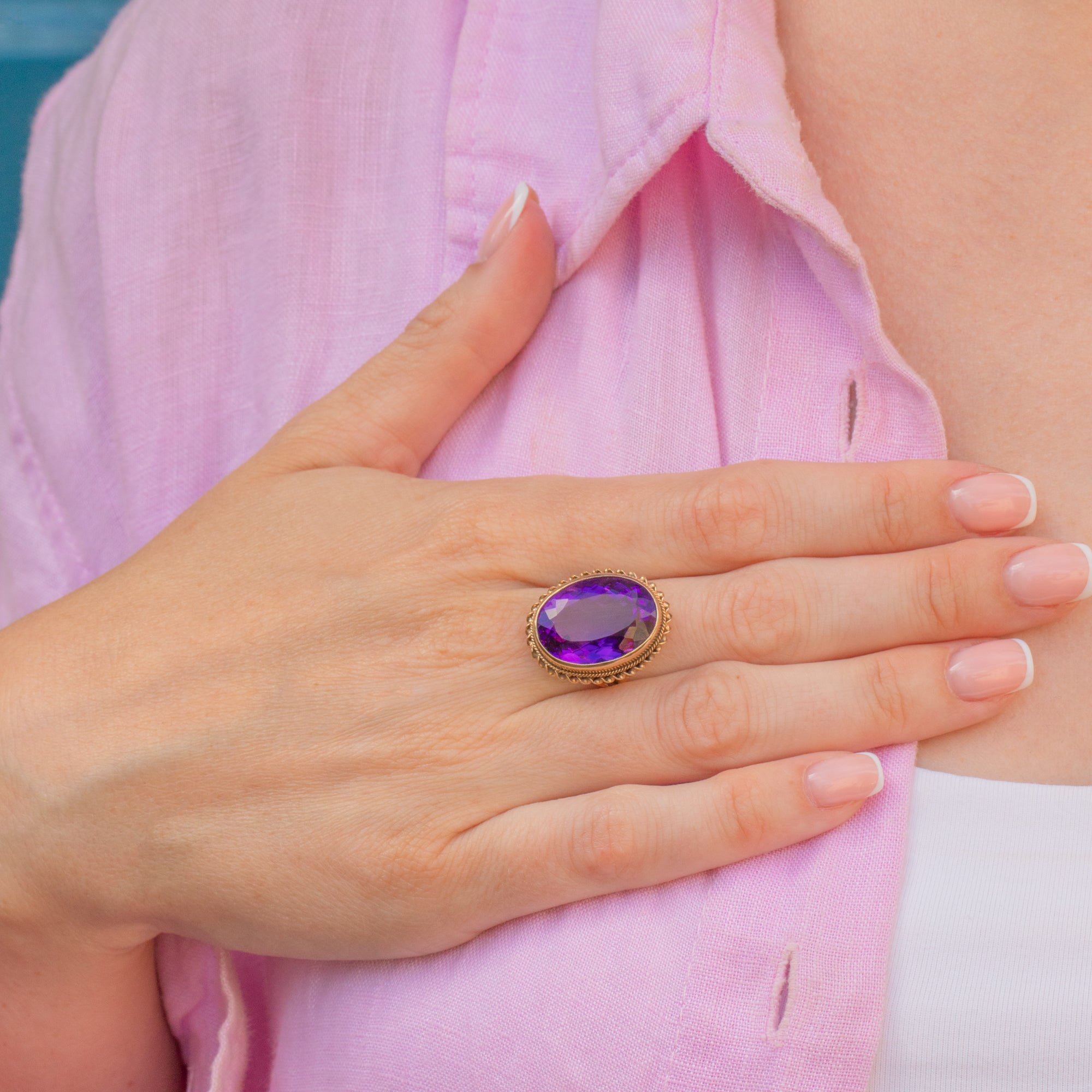 The impressive size of this Vintage Amethyst ring can't go unnoticed too, with her ample finger coverage she requires no additional Gold goodies to style her with. Bound together by buttery 9ct Gold with a rope border, cocktails rings are just as popular today as when first crafted after the prohibition in the 1920's!