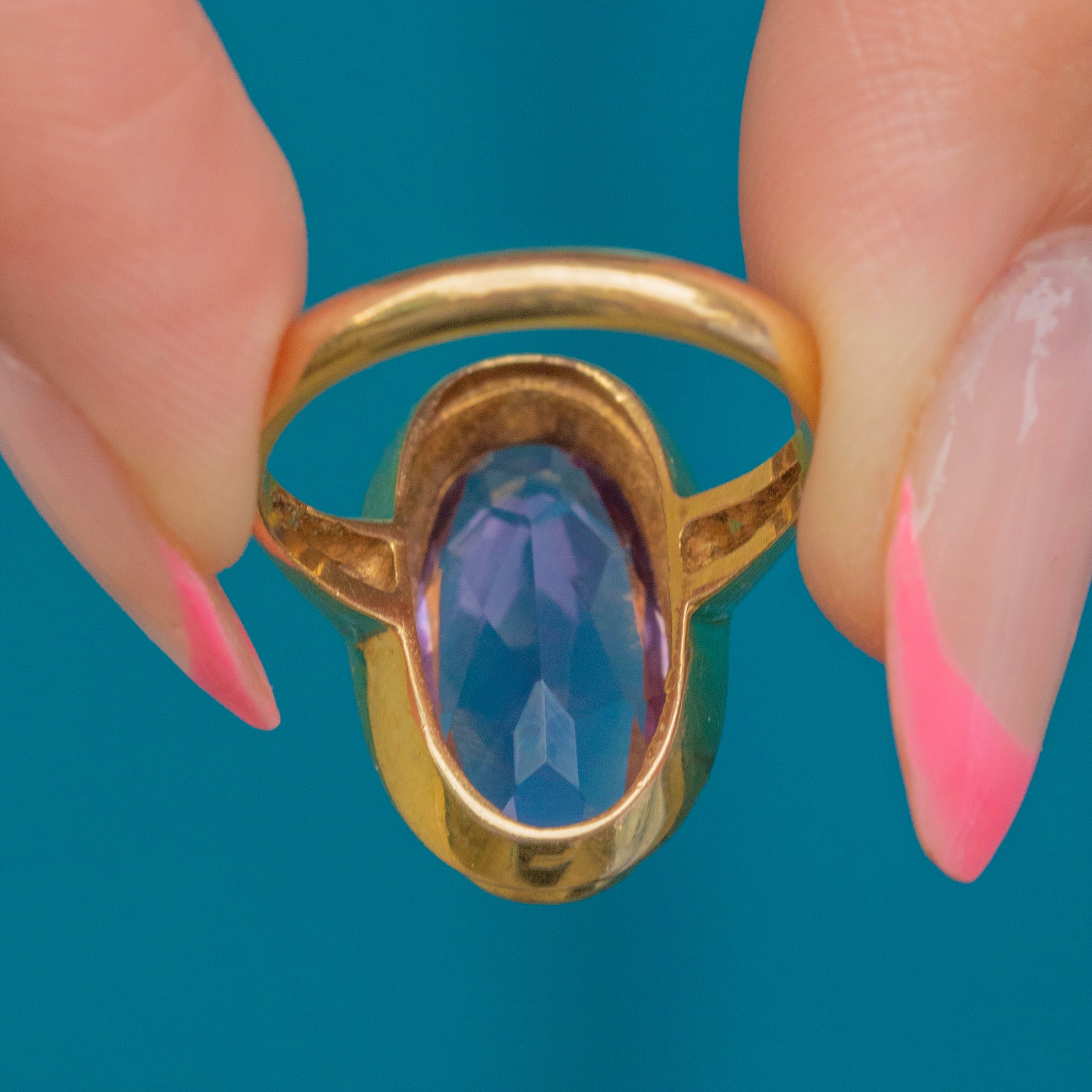 EXCELLENT: This 9ct Gold Amethyst oval solitaire ring is in excellent condition! The Amethyst sits securely within the four-claw setting, with fabulous facets coming to life under the light. The Gold is rich and buttery throughout, with the ring band retaining a well rounded form. This Amethyst solitaire ring is a stunner!