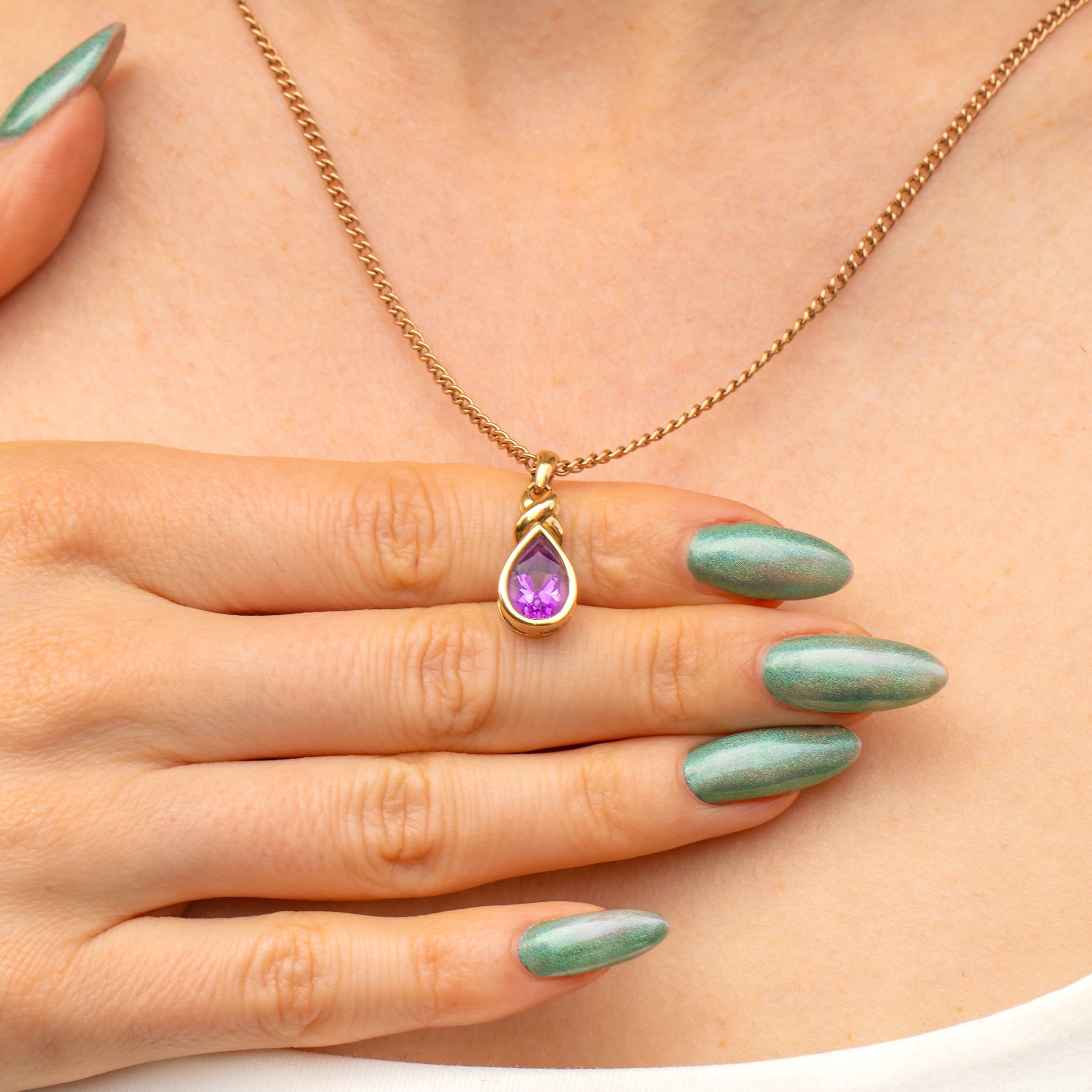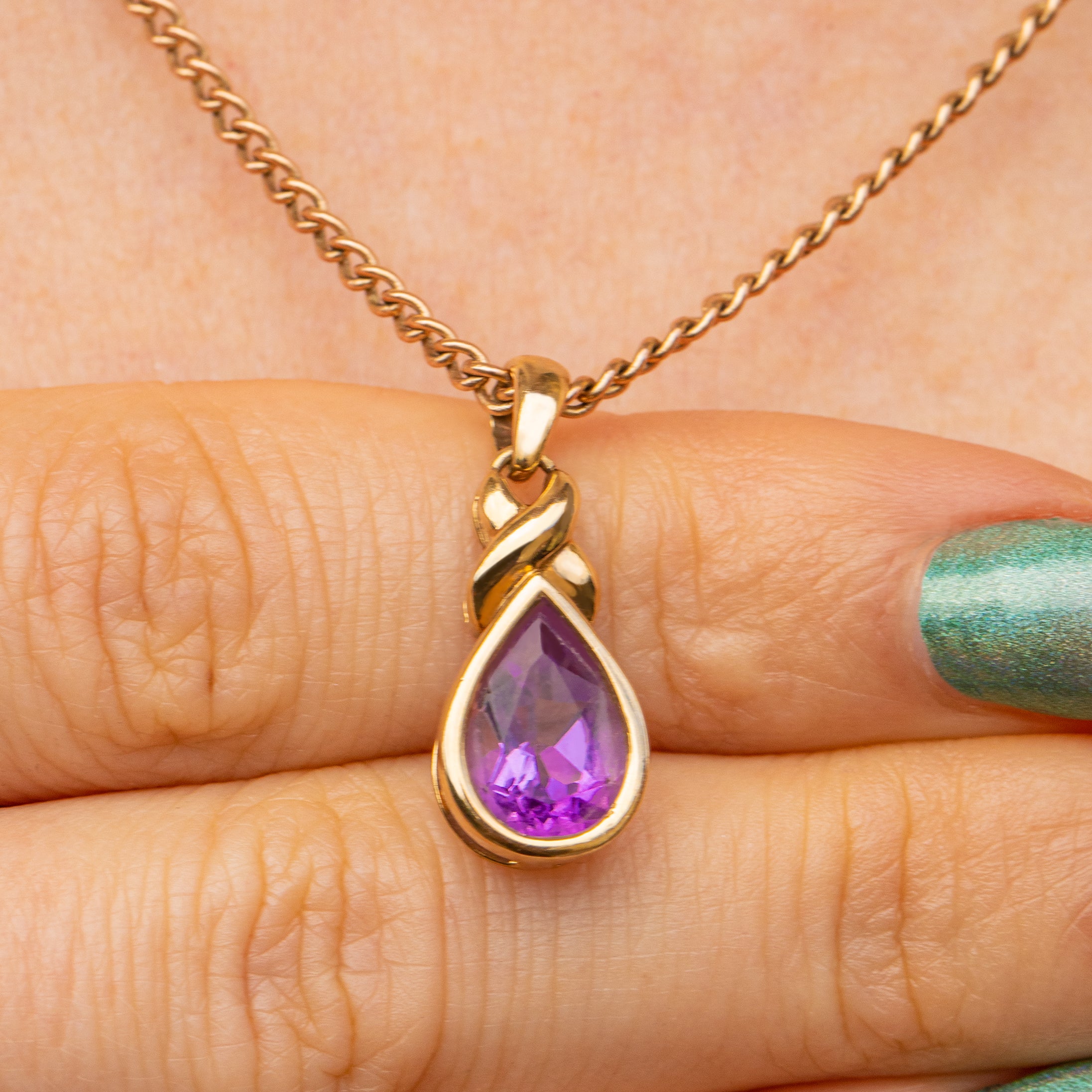 Every curve of this 9ct Gold Amethyst pear charm oozes opulence! Her tightly knotted top detail draws the eye onto the lilac burst of her 1.65ct Amethyst pear, flaunting a myriad of sparkles as it catches the light.