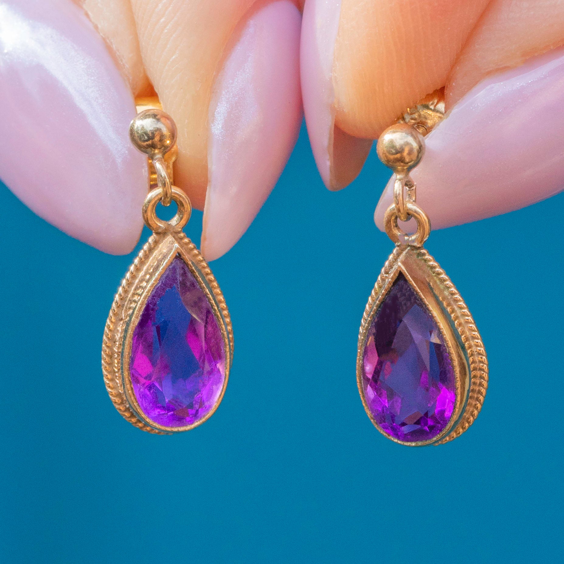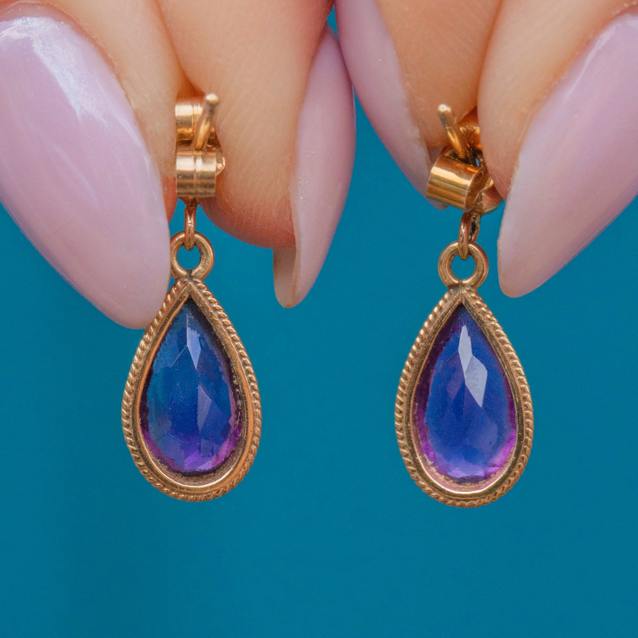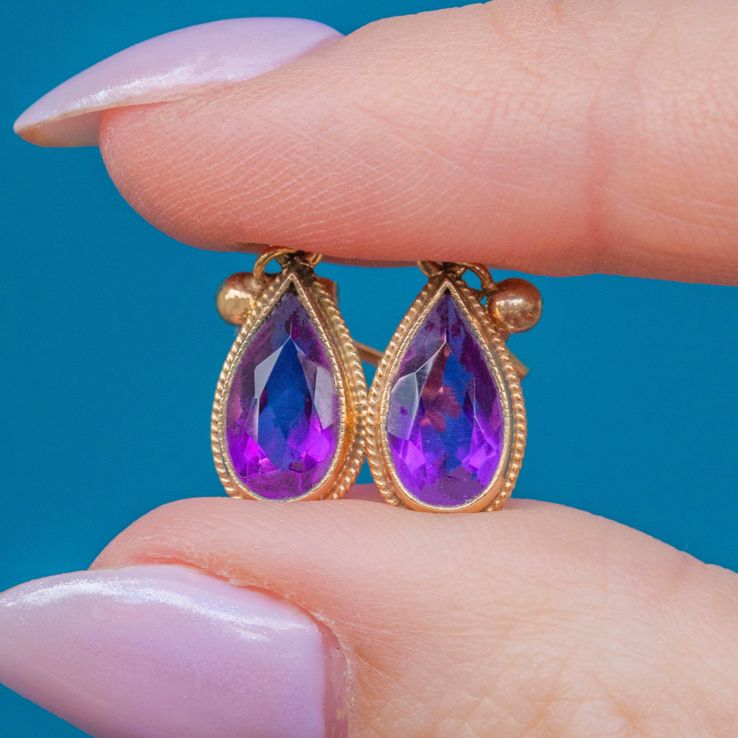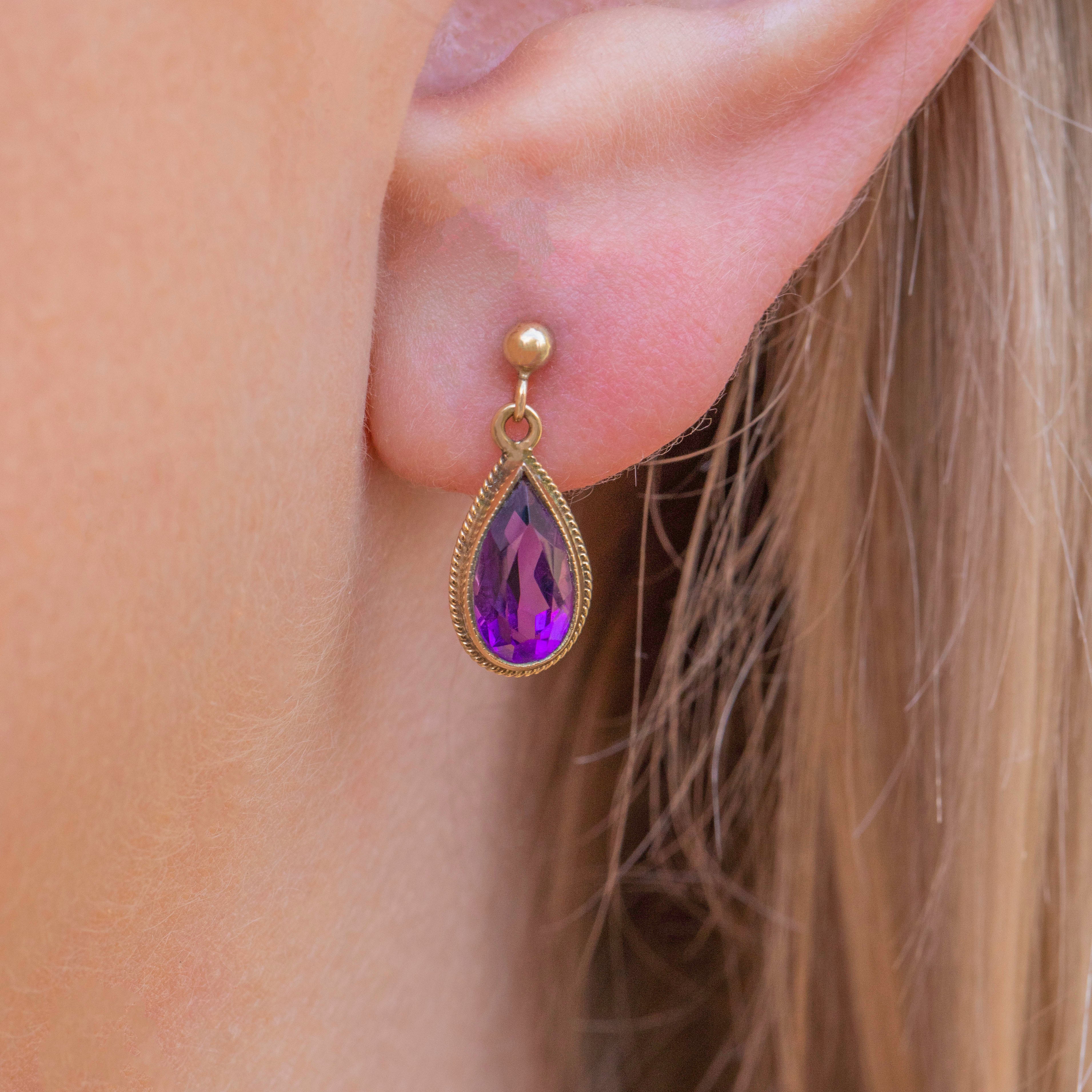 EXCELLENT. We are pleased to present these 9ct Gold Amethyst pear drop earrings in excellent condition! The Amethysts sit securely within their bezels, with no damage to the facets and an exceptionally saturated violet hue. The 9ct Gold is free from any damage and with ear posts and tight fitting butterfly backs to finish, you can wear these Vintage Amethyst earrings with peace of mind.
