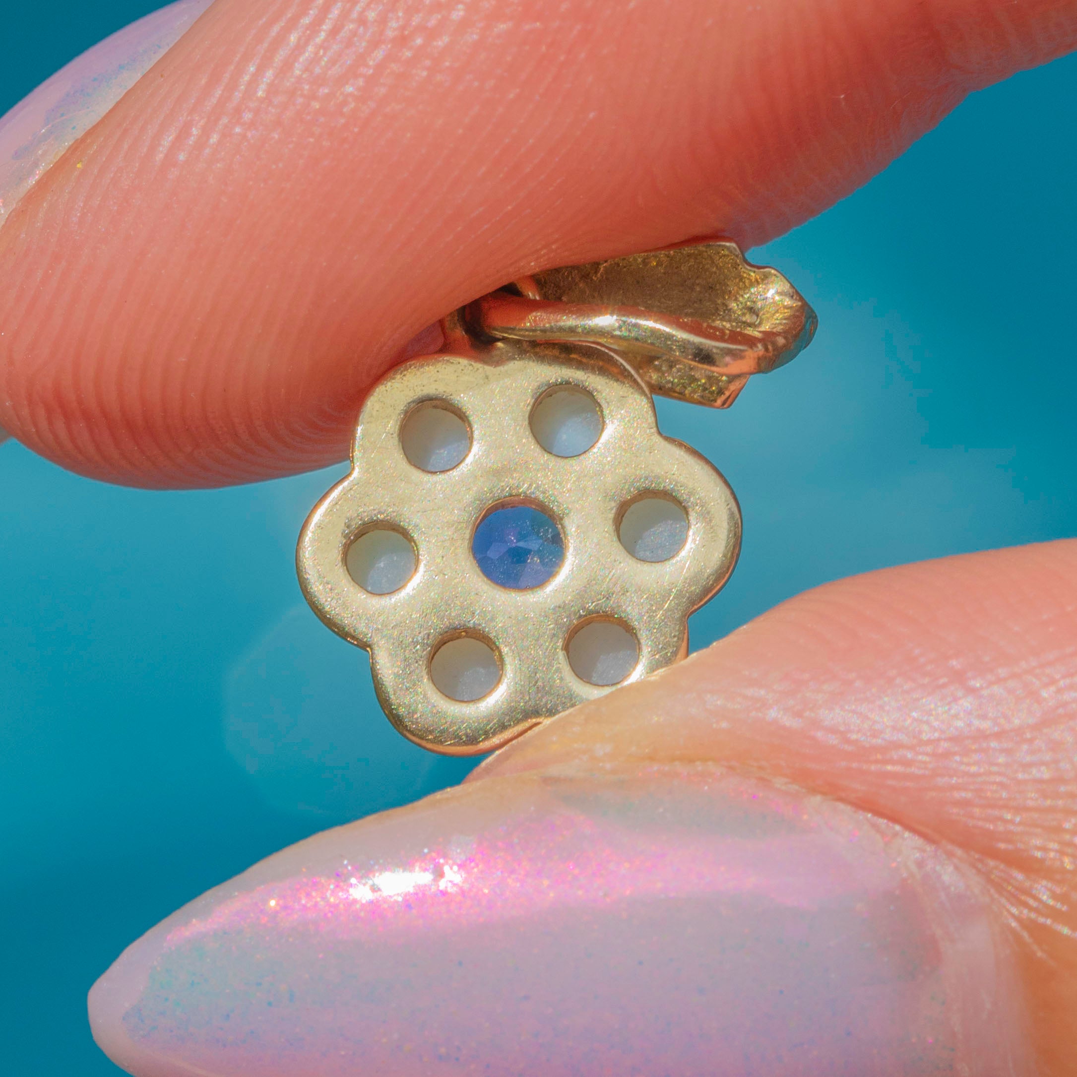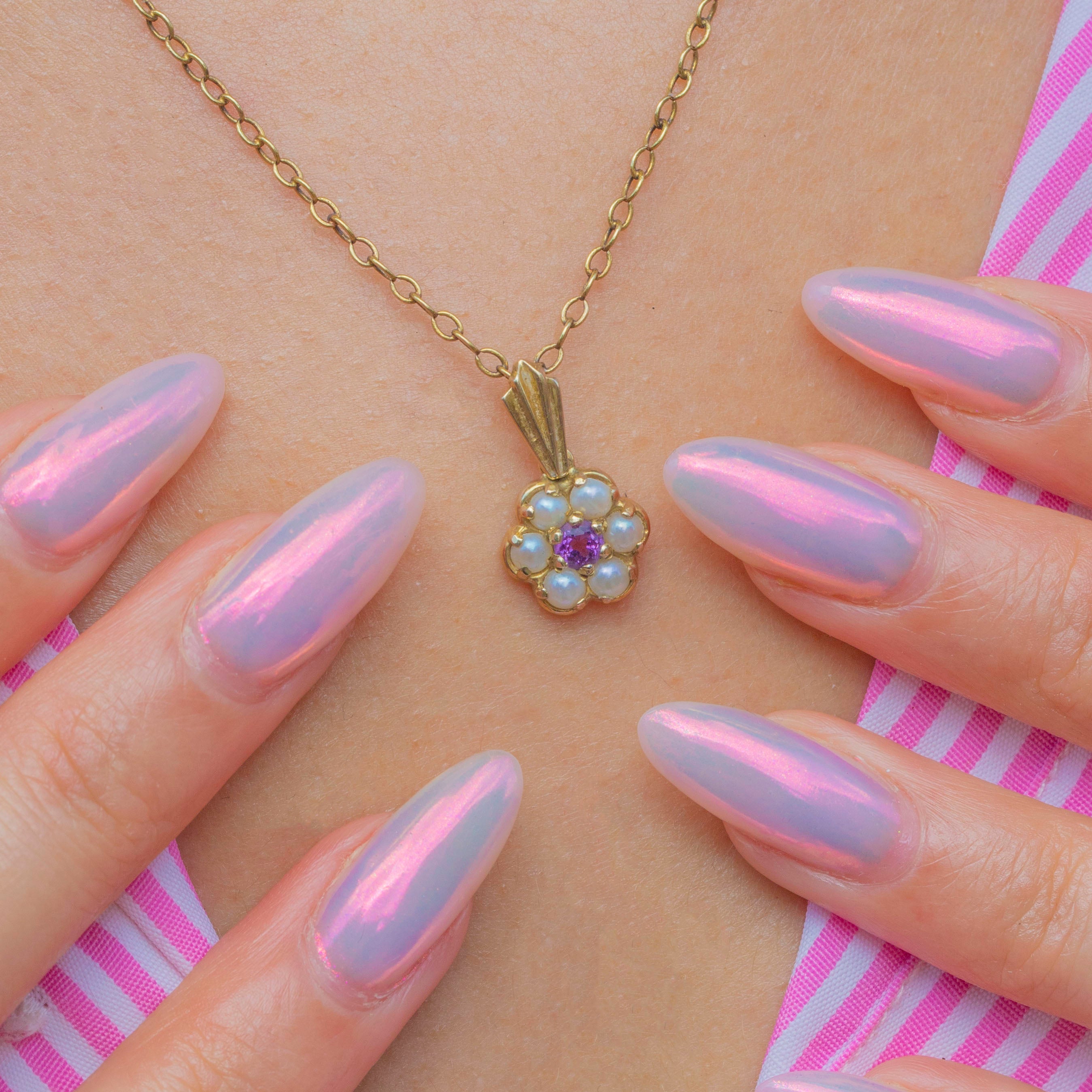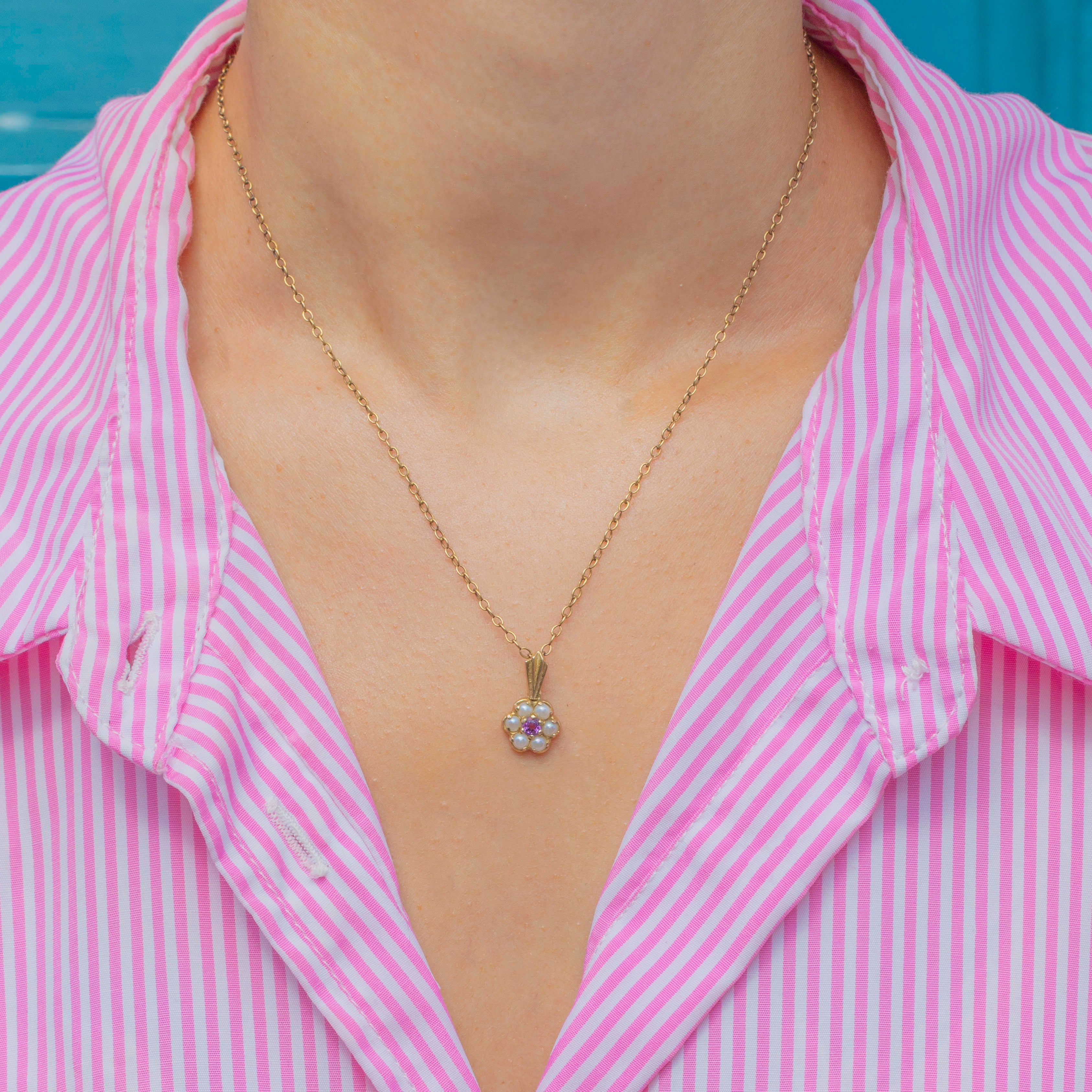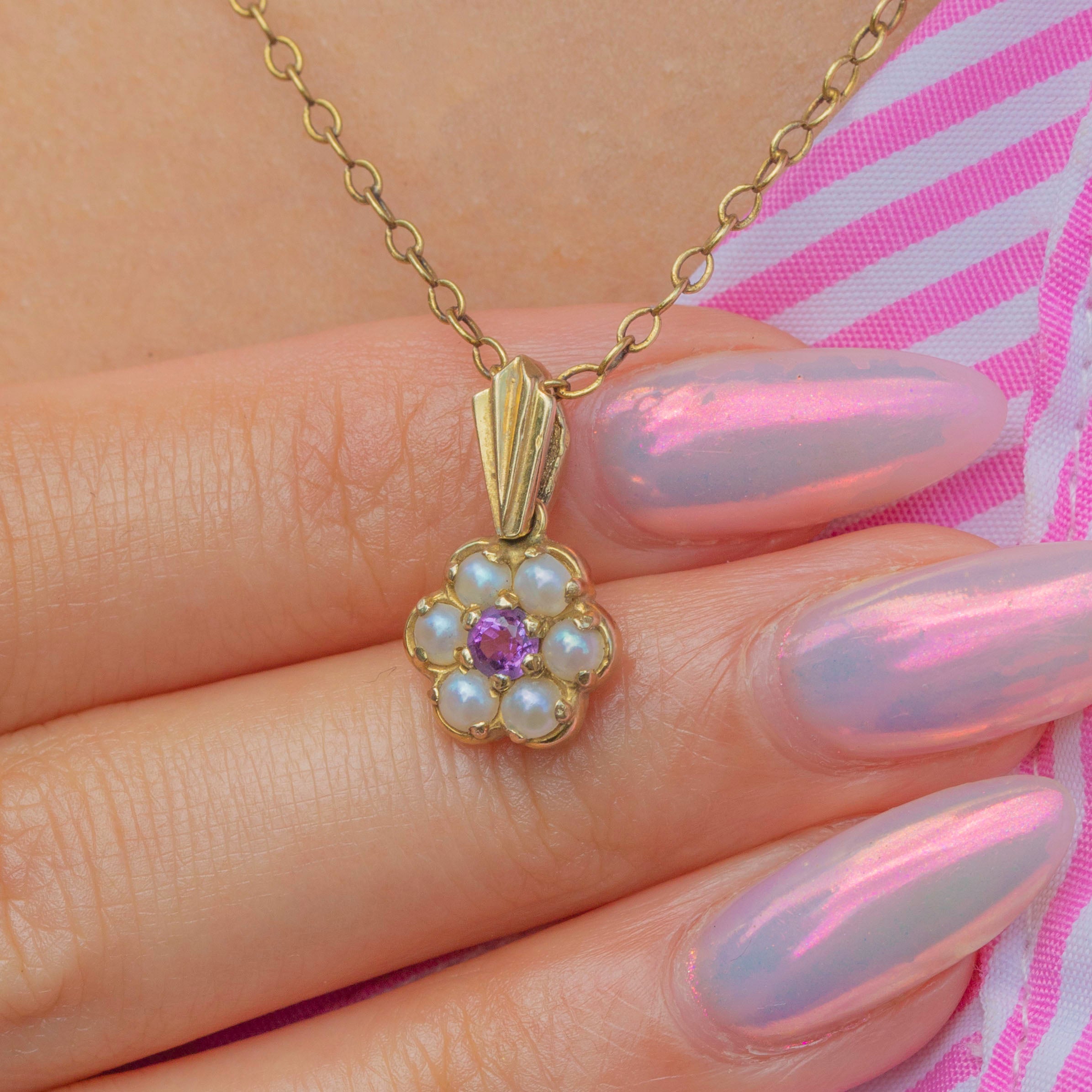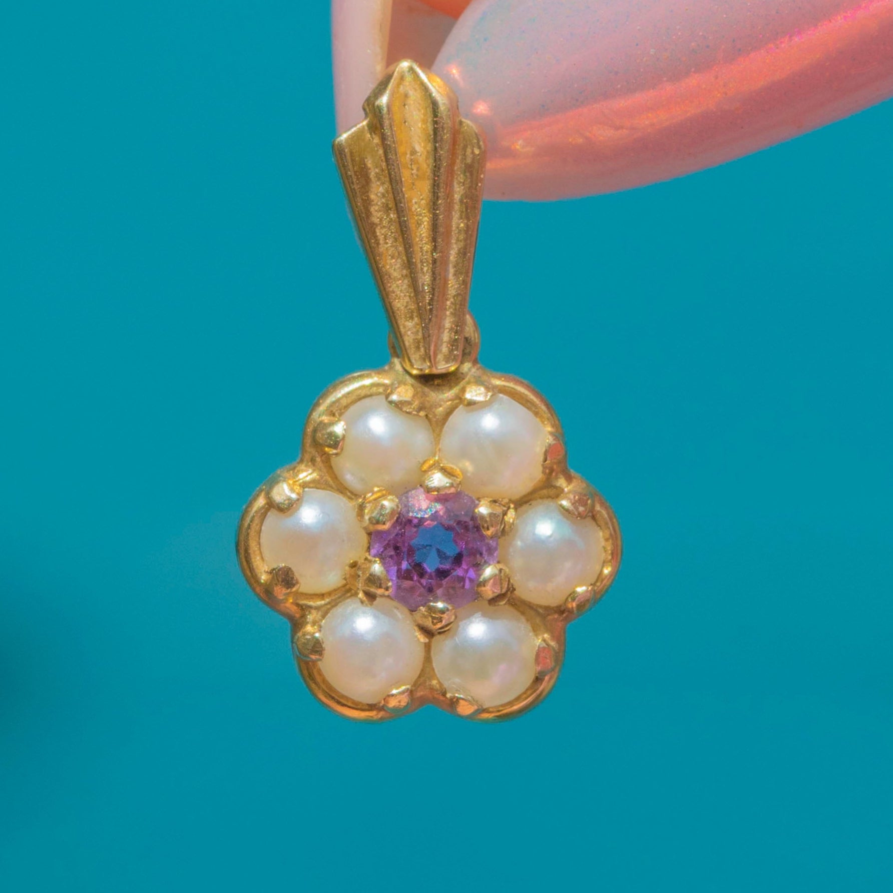 This solid Gold vintage flower pendant displays shimmering Pearl petals wrapping around a pretty pinkish Amethyst at her centre. Fully hallmarked to the year 1993, we love this cute piece!