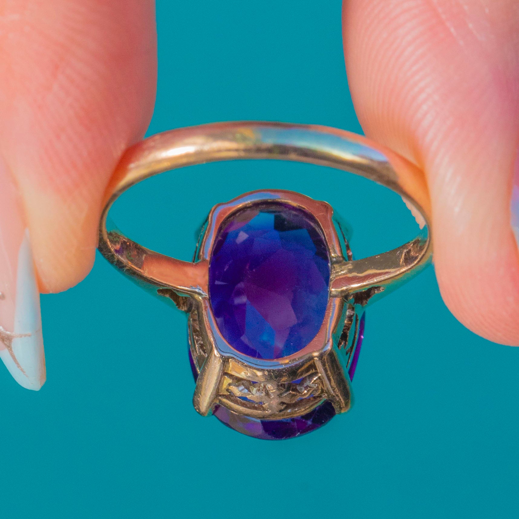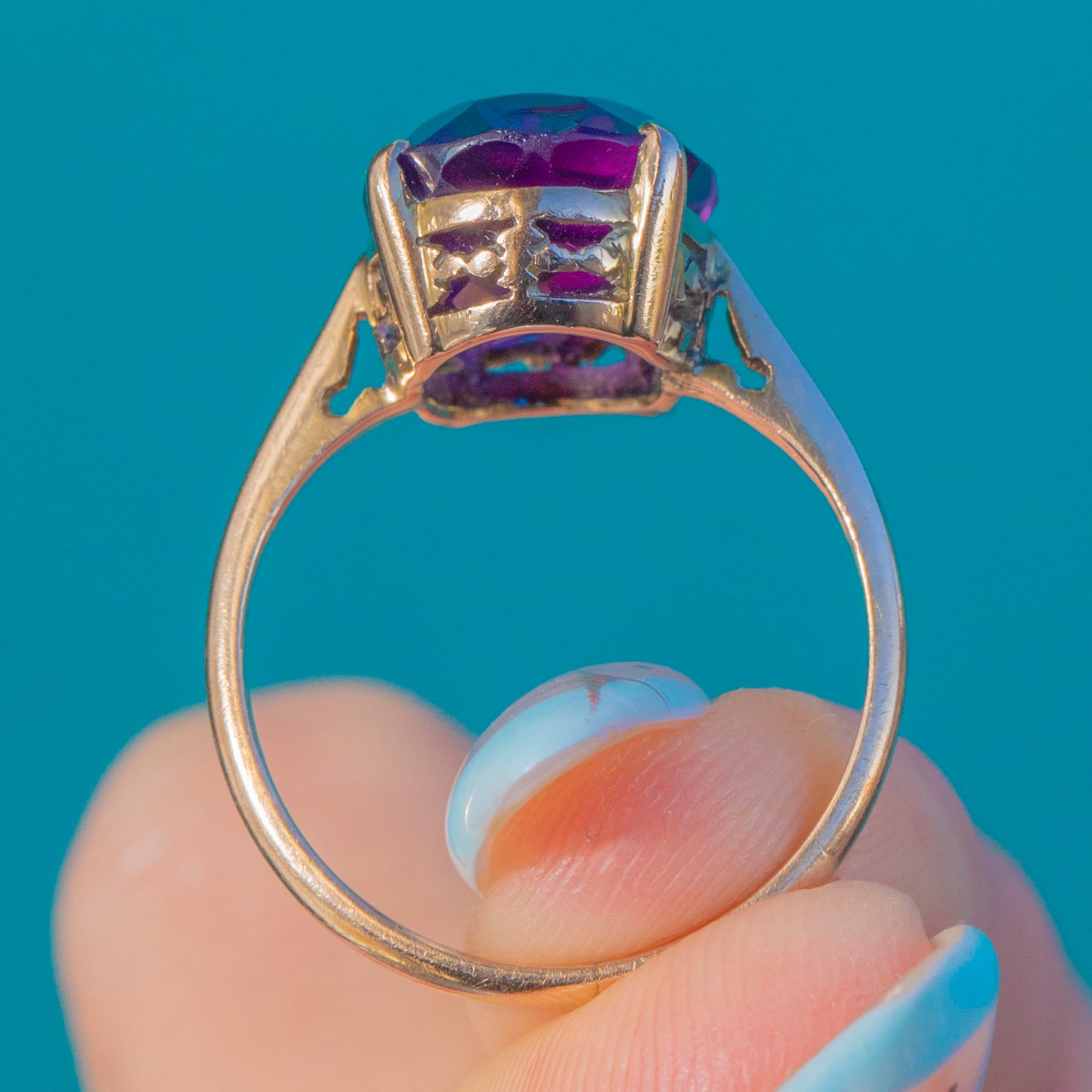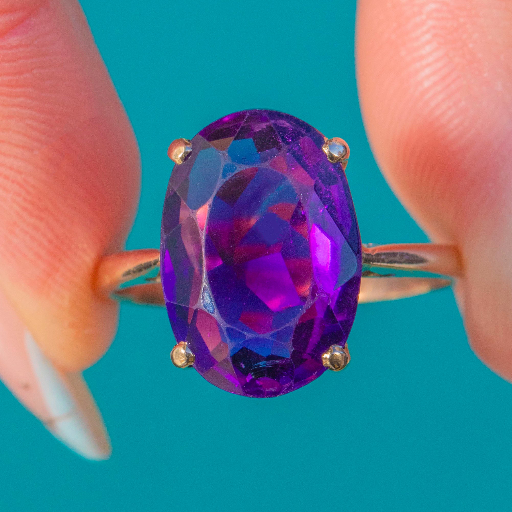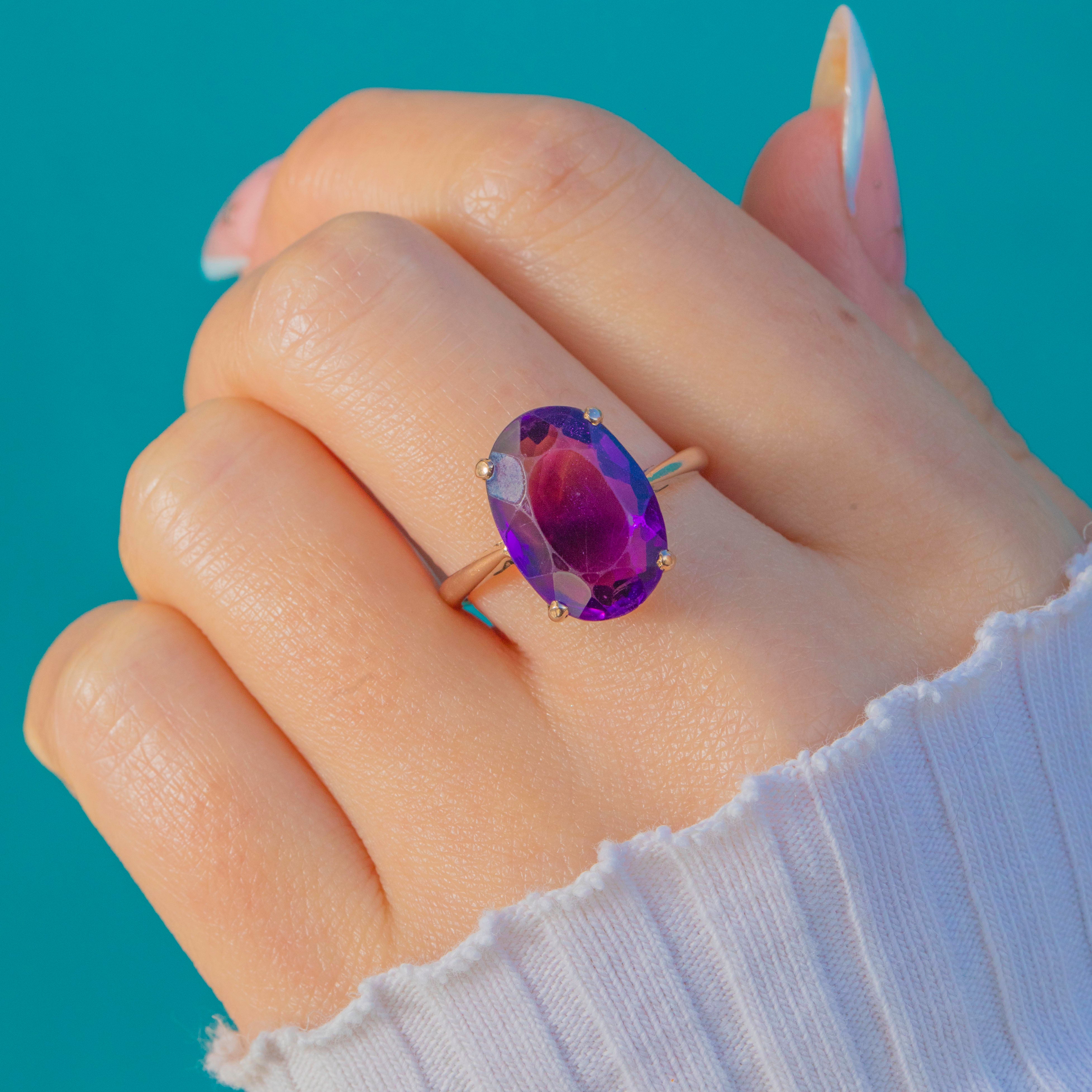 A striking Mid-Century solitaire, this Vintage c.1950s ring centres a luscious elongated oval Amethyst of approximately 3.30ct. Saturated deep plum with lively violet flashes, the stone is the star of the show, catching the light beautifully and delivering that quintessential cocktail allure.