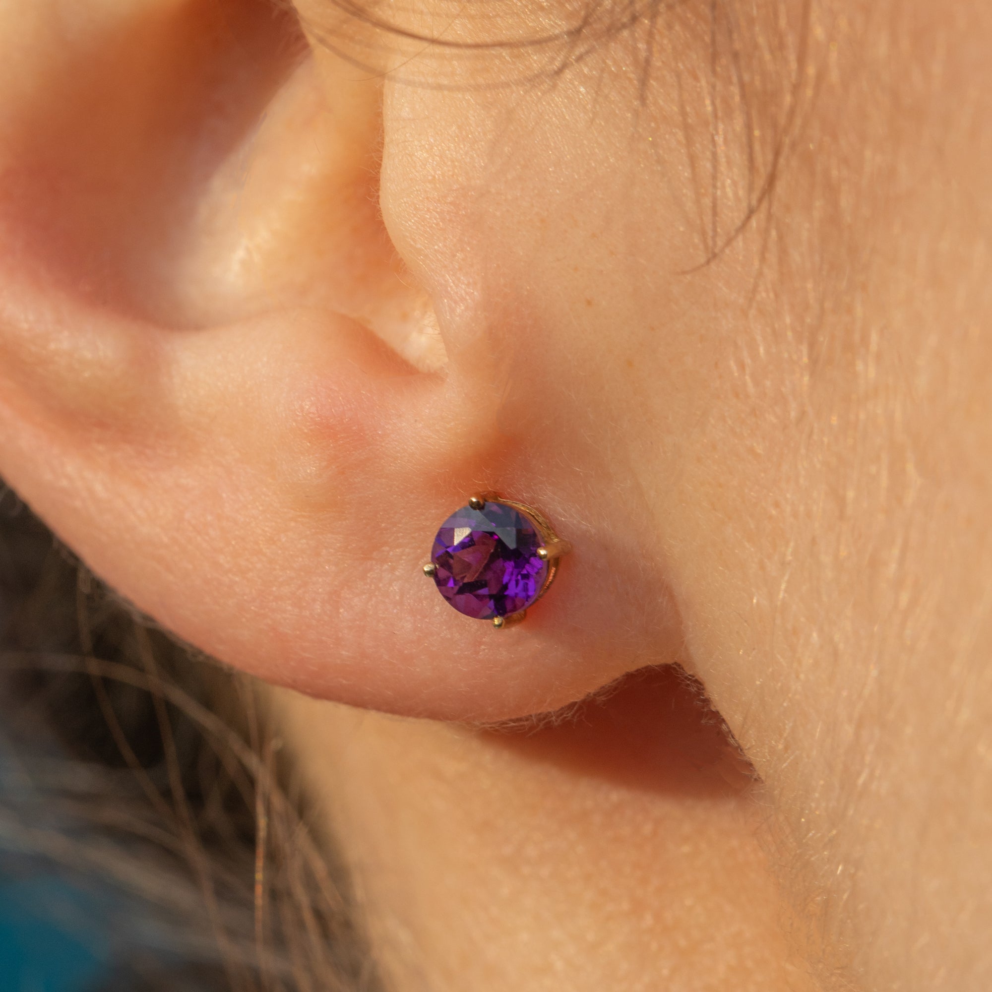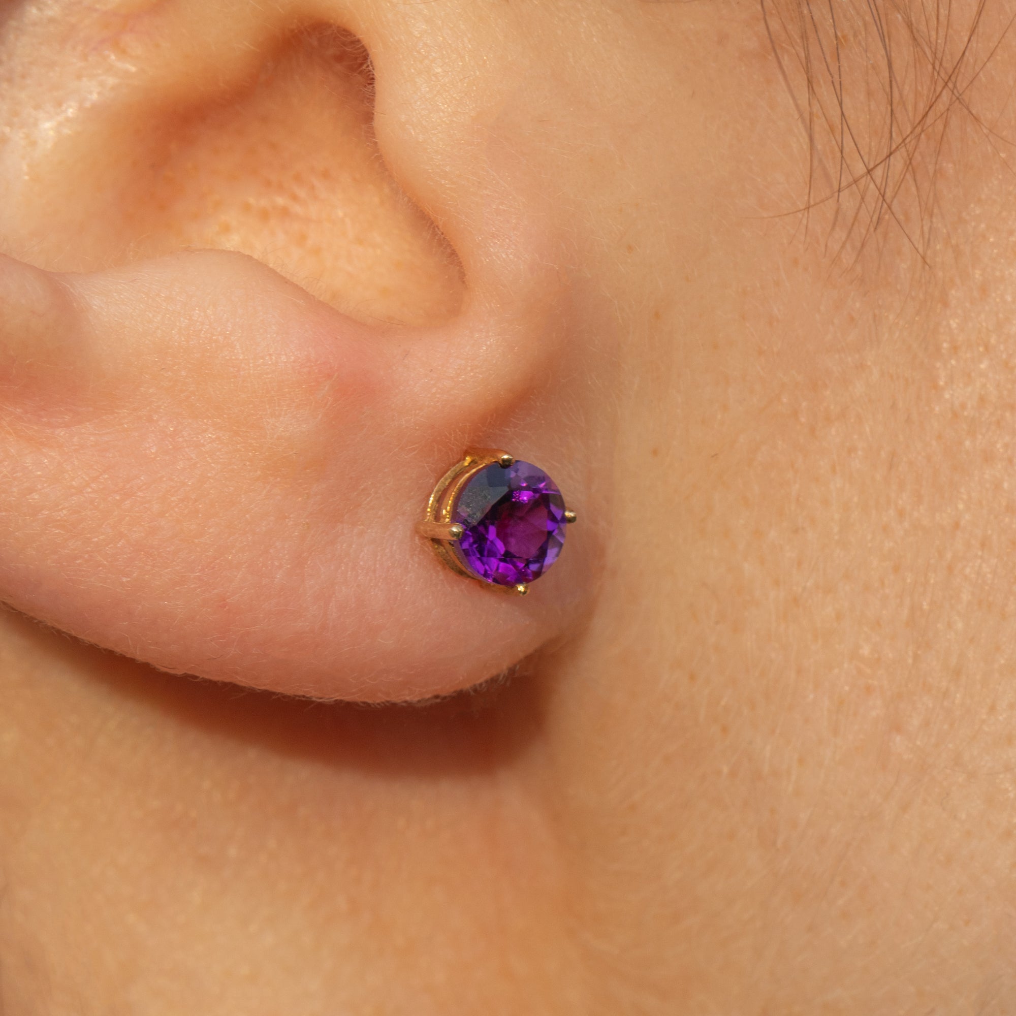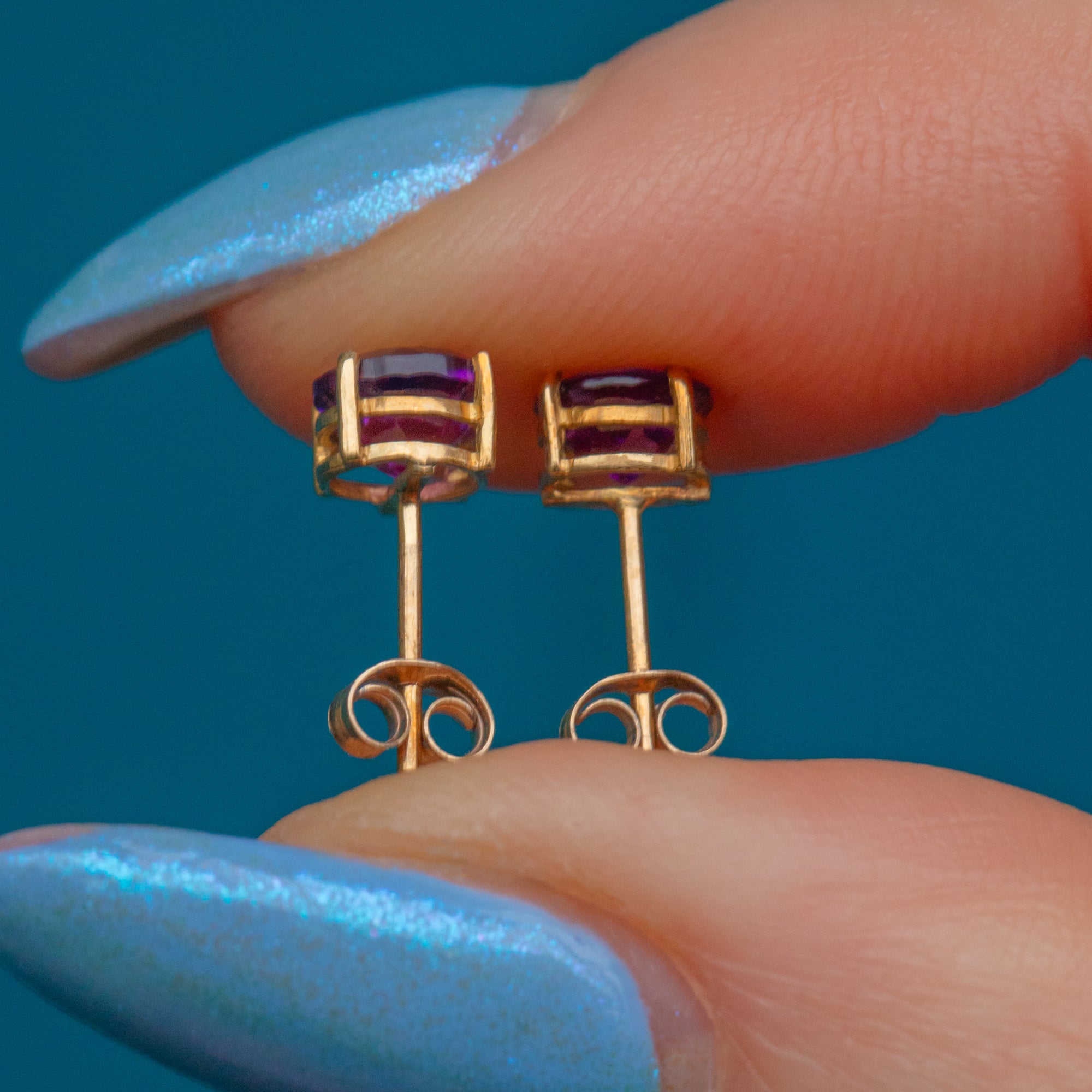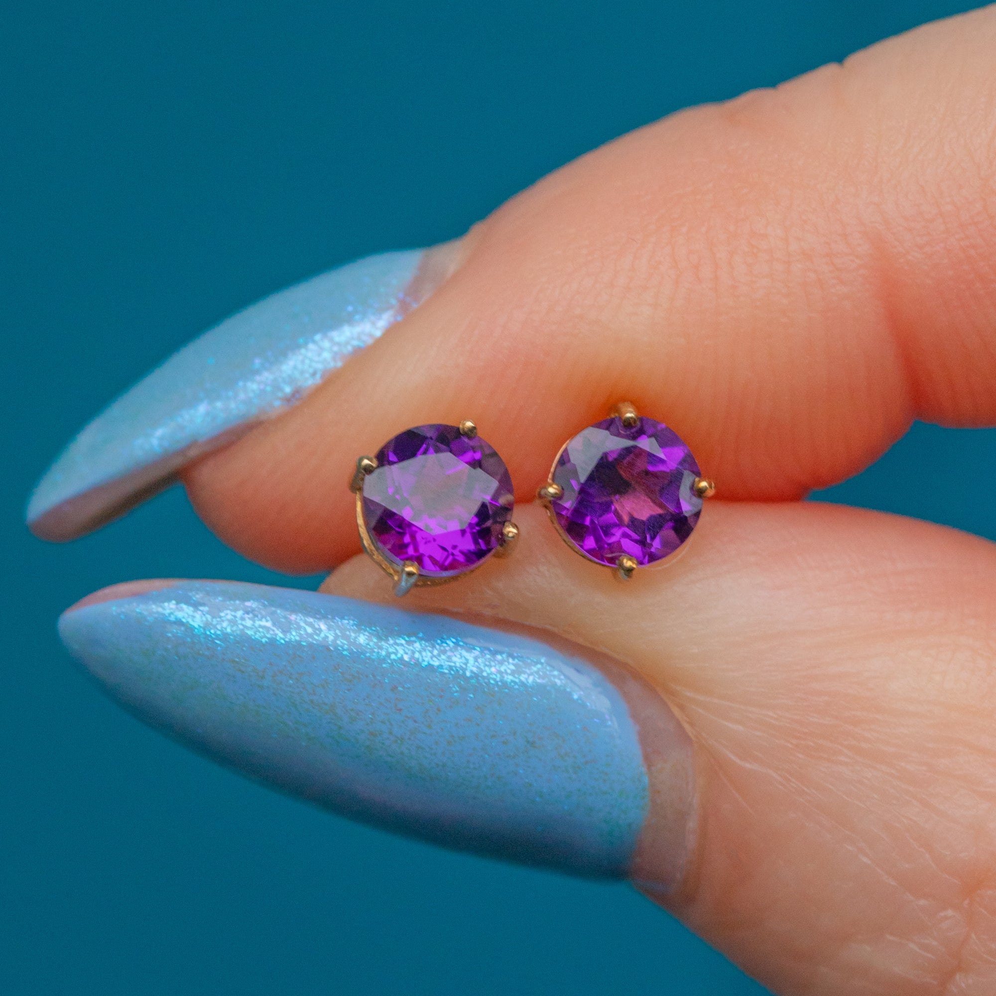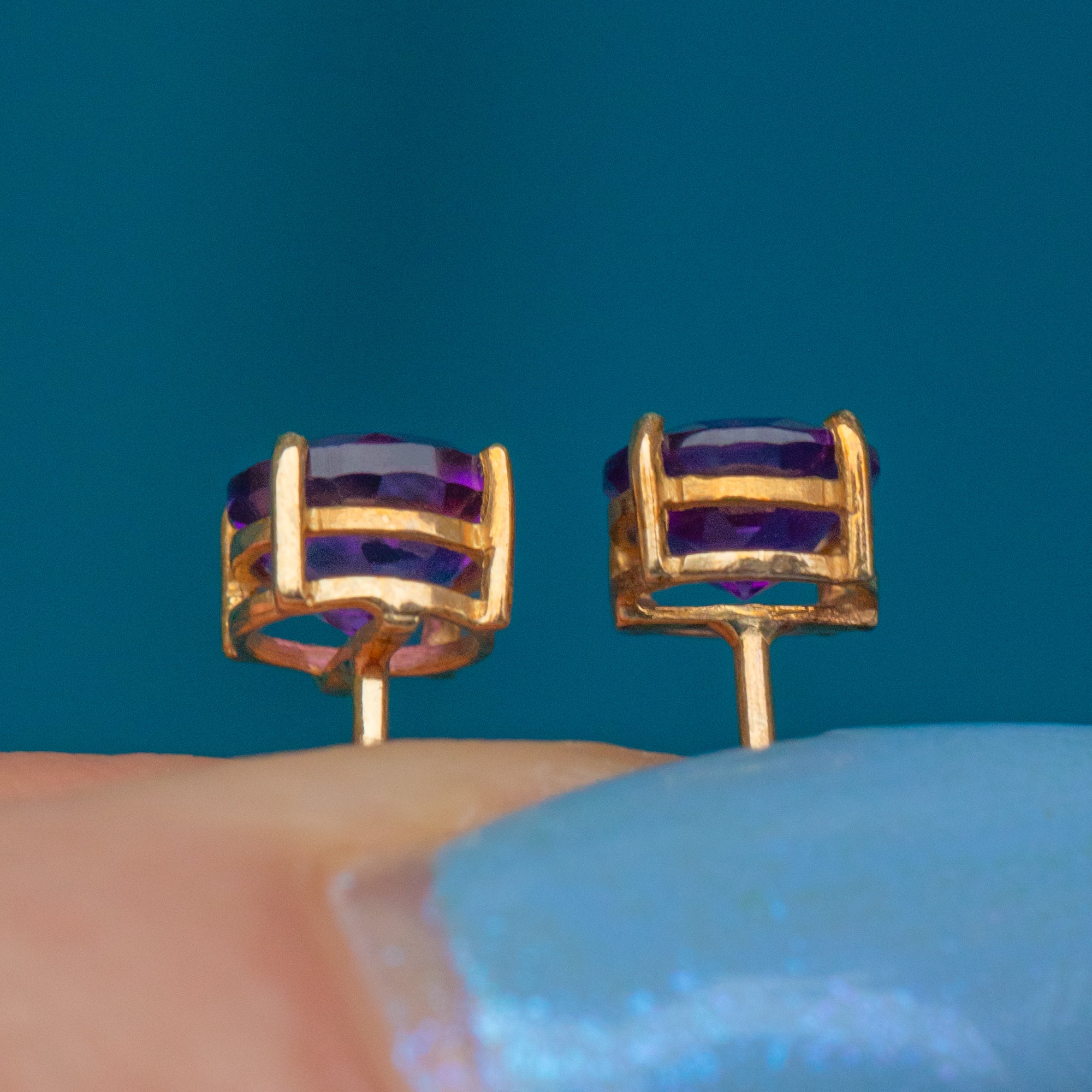 Each Amethyst is faceted wonderfully, radiating vibrant deep lavender hues as they catch the light. They are set securely within bright, buttery 9ct Gold settings and are the perfect petite size for everyday wear.