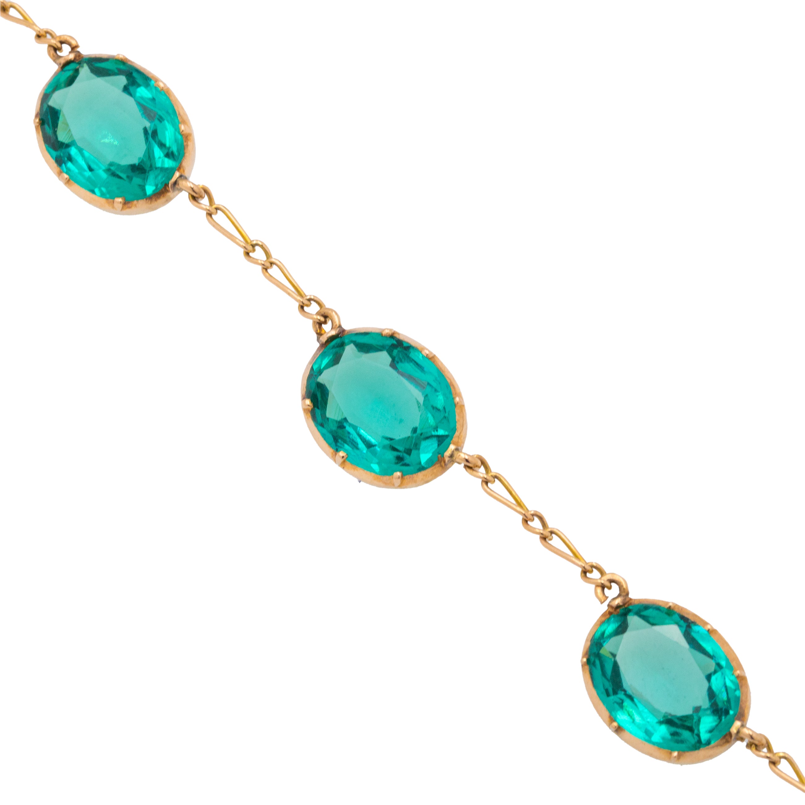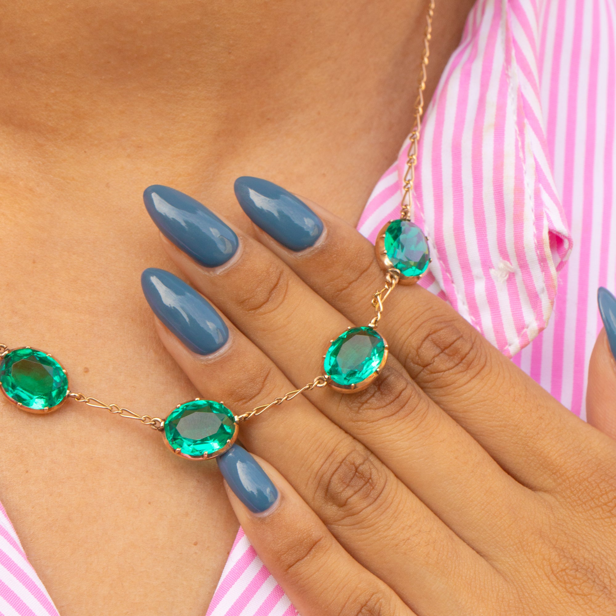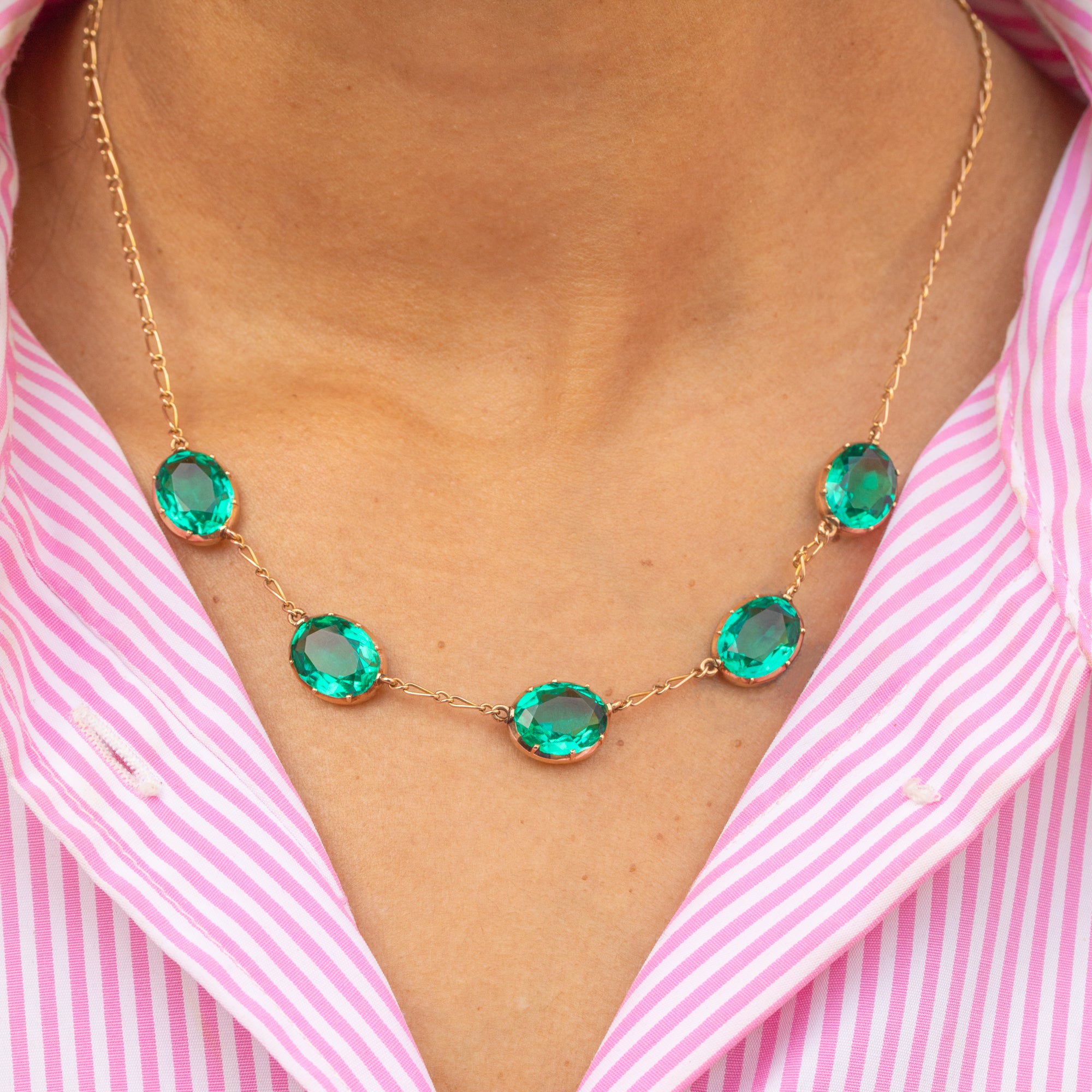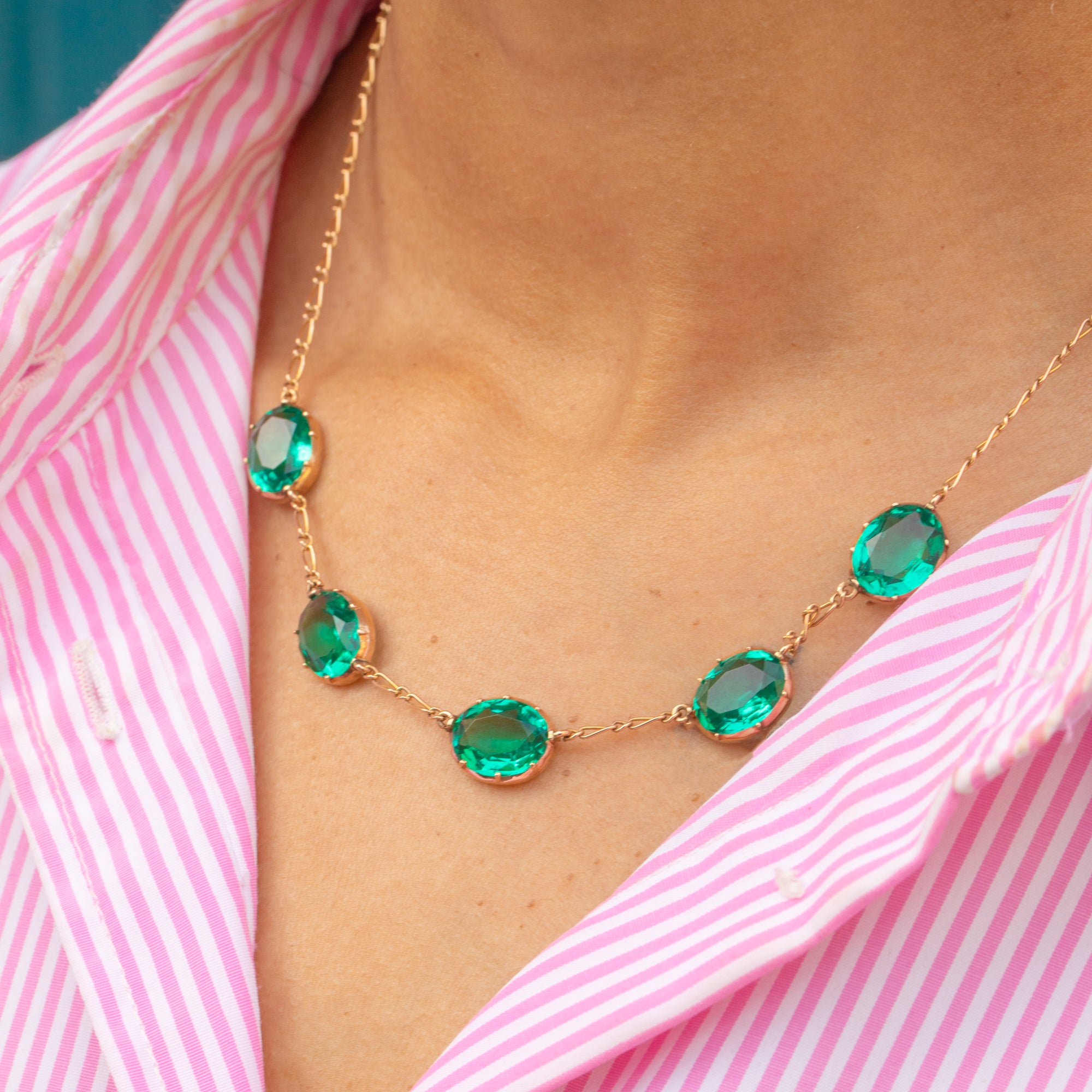 VERY GOOD-EXCELLENT. This antique green Paste integral necklace is in wonderful condition. Each Paste gemstone is present and secure, fabulously faceted, and has no age wear to note. The 15ct Gold settings have a slightly blushed tone and have remained in fab condition. The Figaro chain is likely a later addition and is in tip-top condition, fastening securely with the barrel clasp. You will be the centre of attention with this Victorian Green Paste Gold necklace adorning your neck!