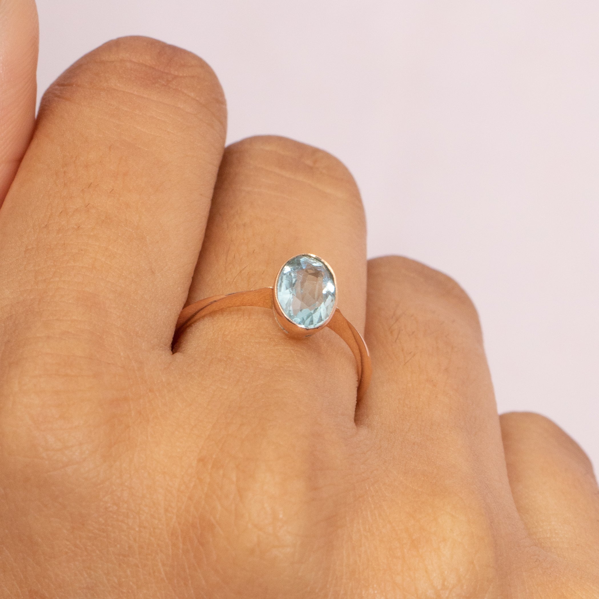 The colour combination of rosy Gold and icy blue makes a pretty pairing, and the bezel setting frames the stone elegantly. It would make a gorgeous gift for any occasion or a unique Victorian solitaire ring to add to your collection.