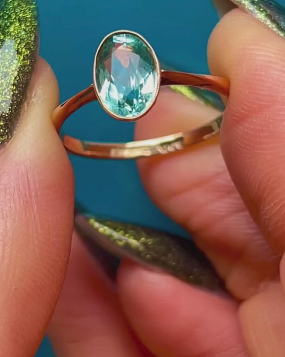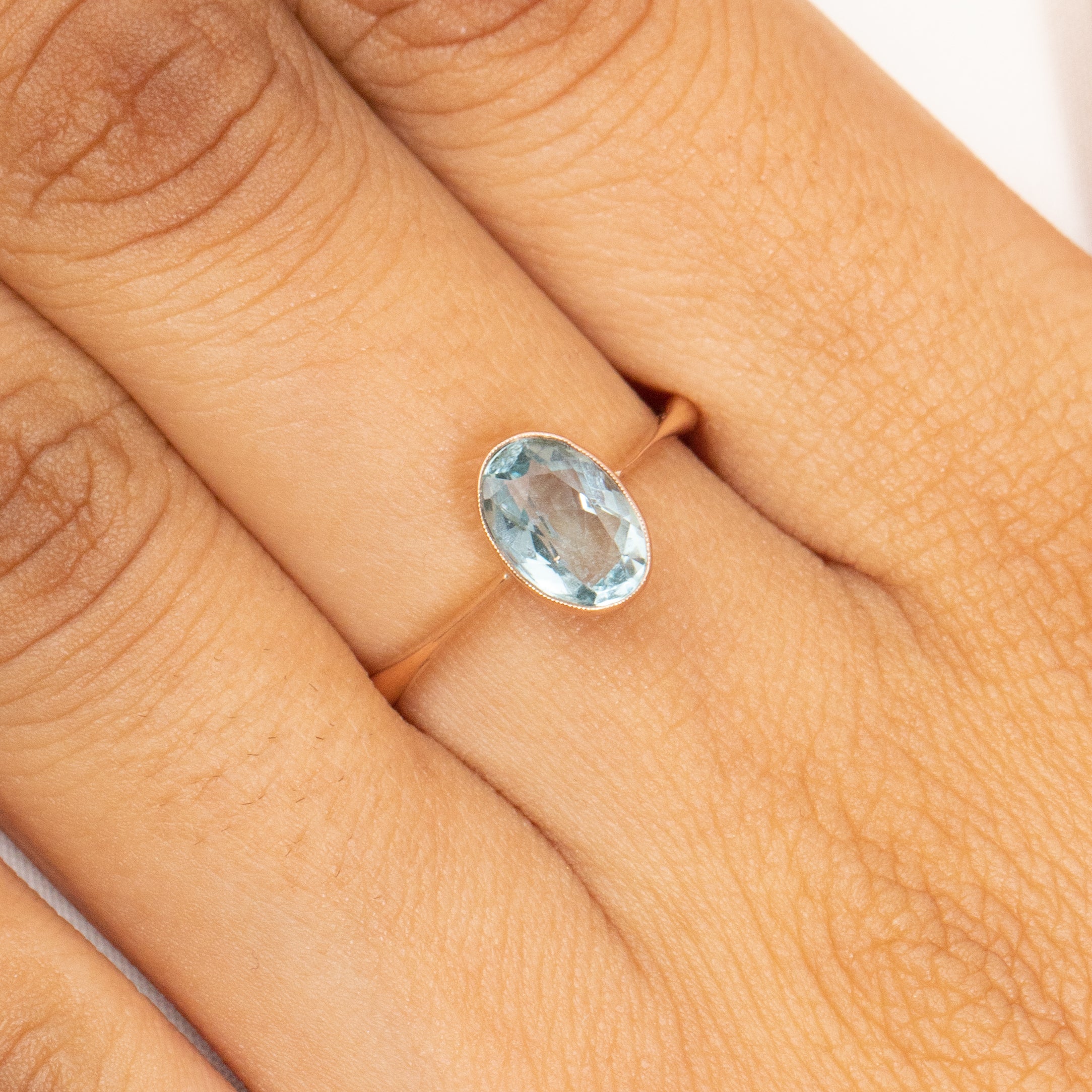 This exquisite 9ct Gold Aquamarine oval bezel-set solitairering exudes elegance and sophistication. The 1.00ct Aquamarine is akin to a pool of icy water, with the facets shimmering and changing with the light, flashing with deep azure and Turquoise undertones.