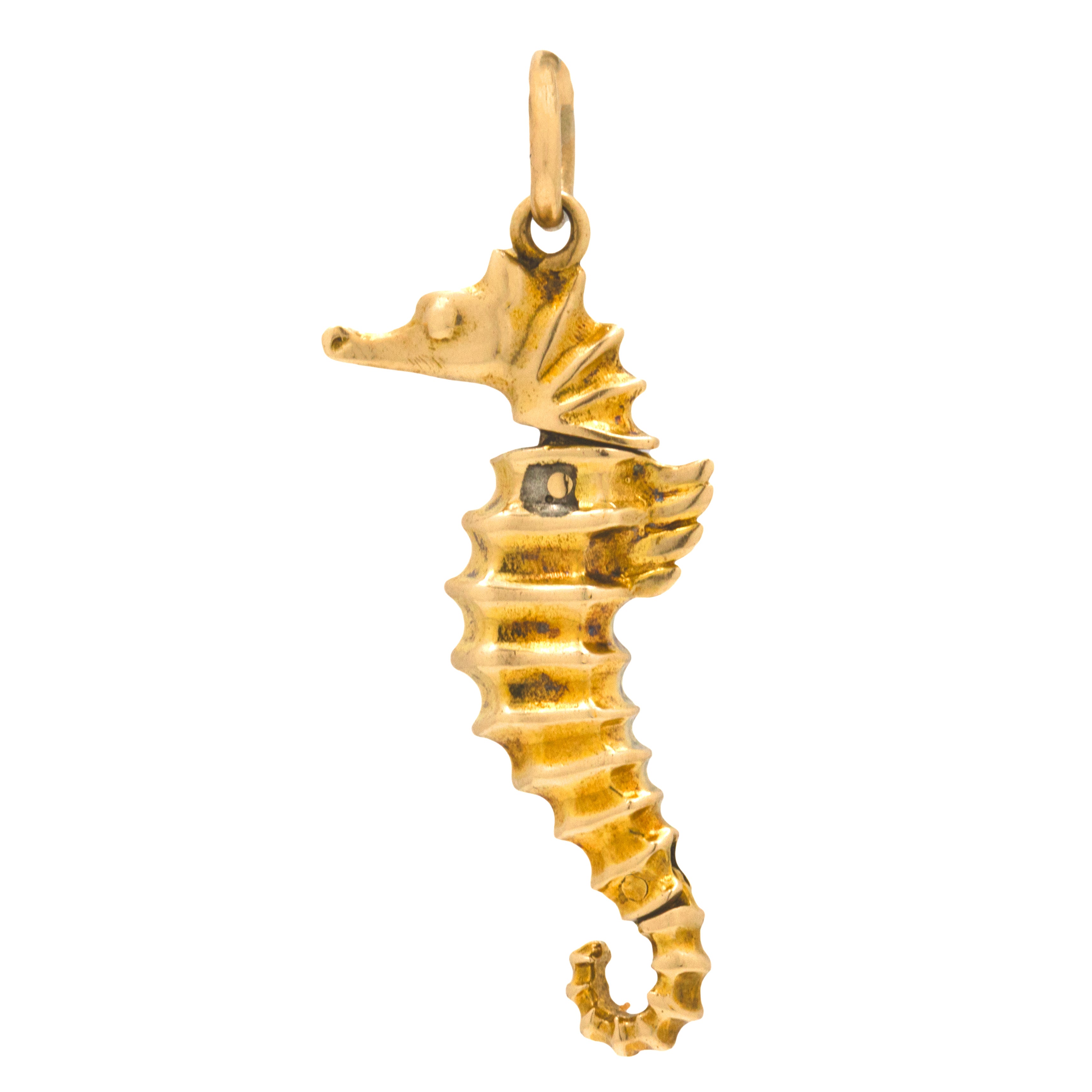 VERY GOOD TO EXCELLENT. This 9ct Gold articulating seahorse charm is in fabulous condition. The charm has a gentle movement and intricate detailing throughout. The 9ct Gold exhibits minor surface marks and some darkening to the grooves, but this only adds to her antique charm. The Gold is buttery with a beautiful matte finish throughout and the soldered jump ring allows for secure wear.