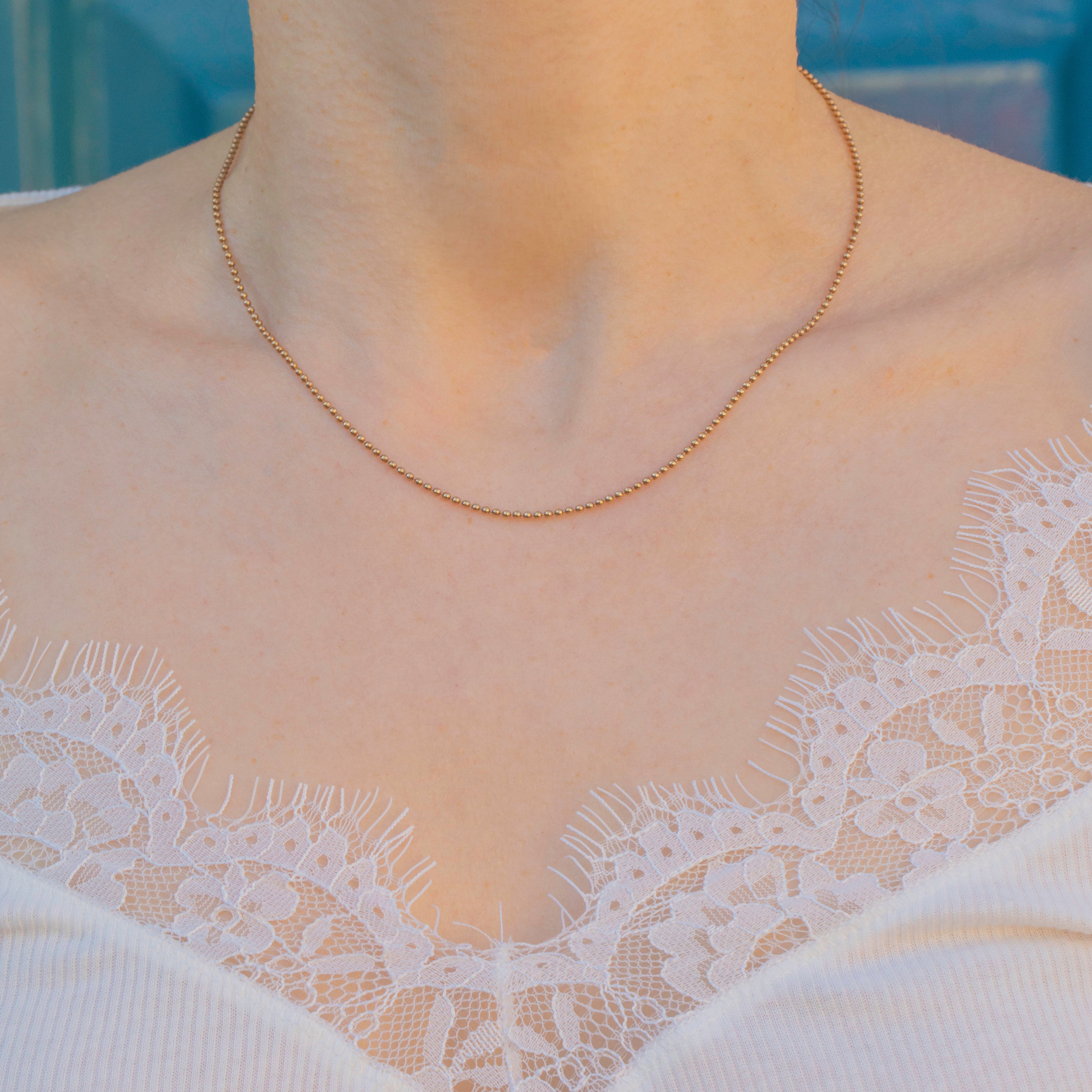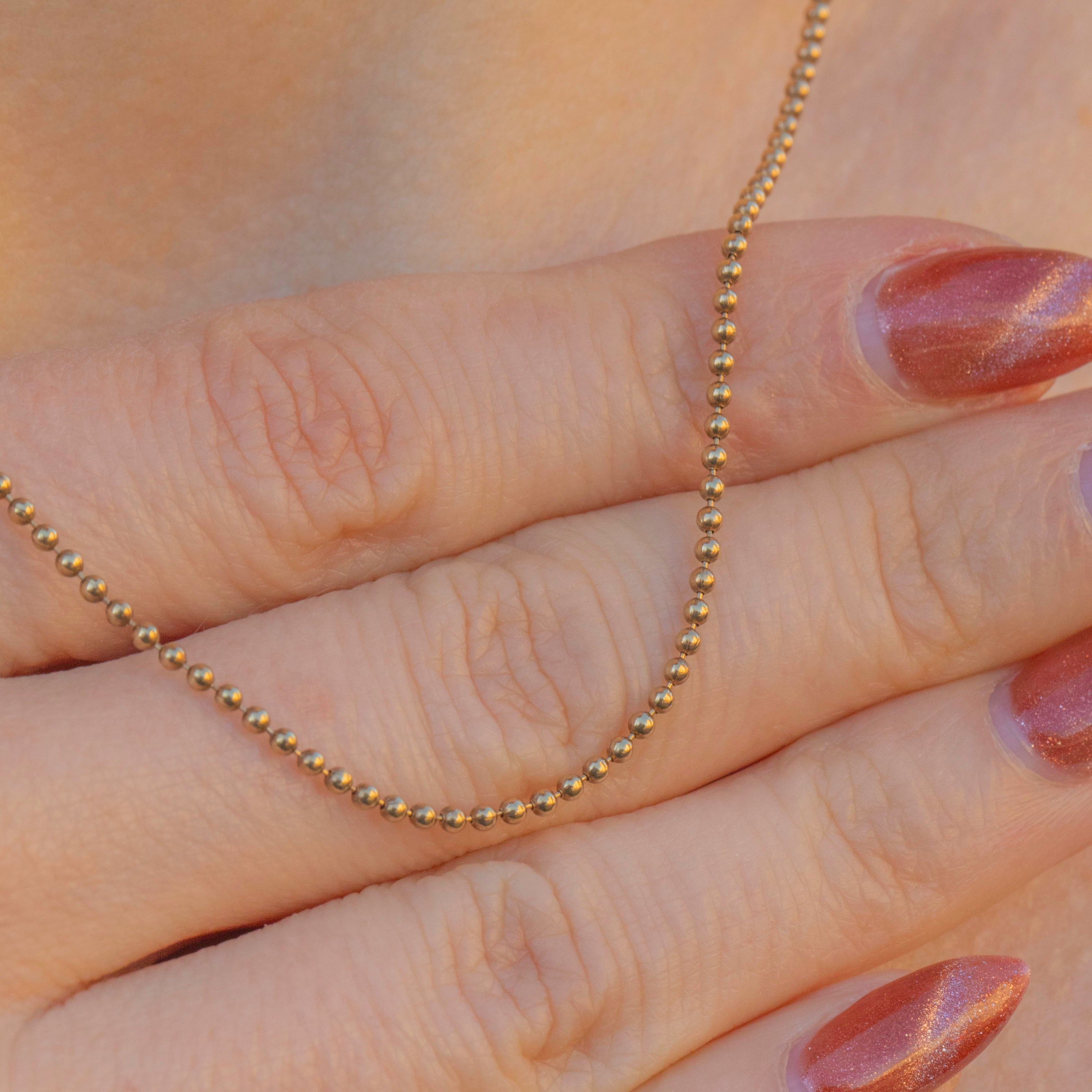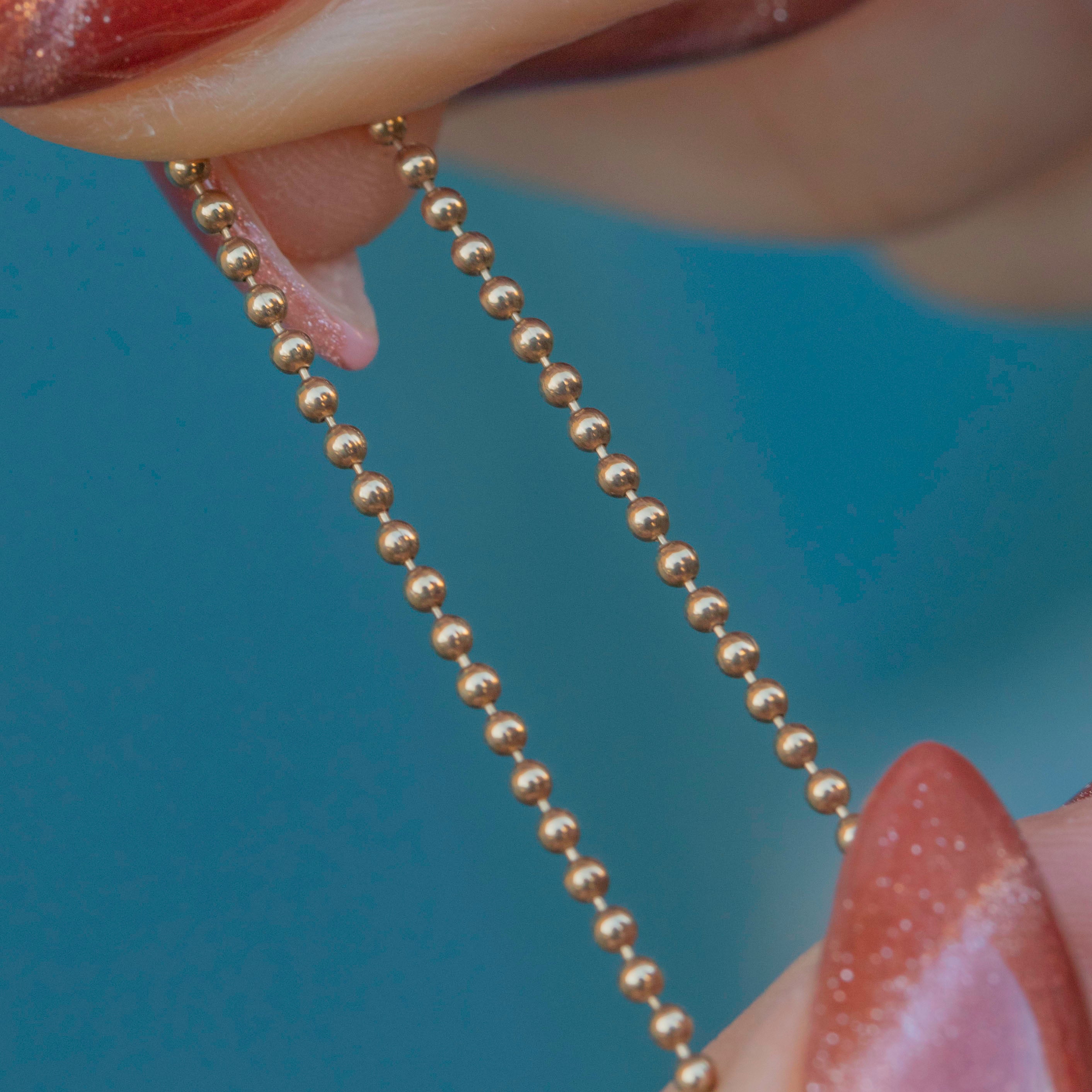 This 9ct Gold ball bead chain will bring a unique edge to your repertoire! The 16" length is crafted entirely from bright 9ct Gold and is made up of dainty ball details that will add texture to your neck stack.