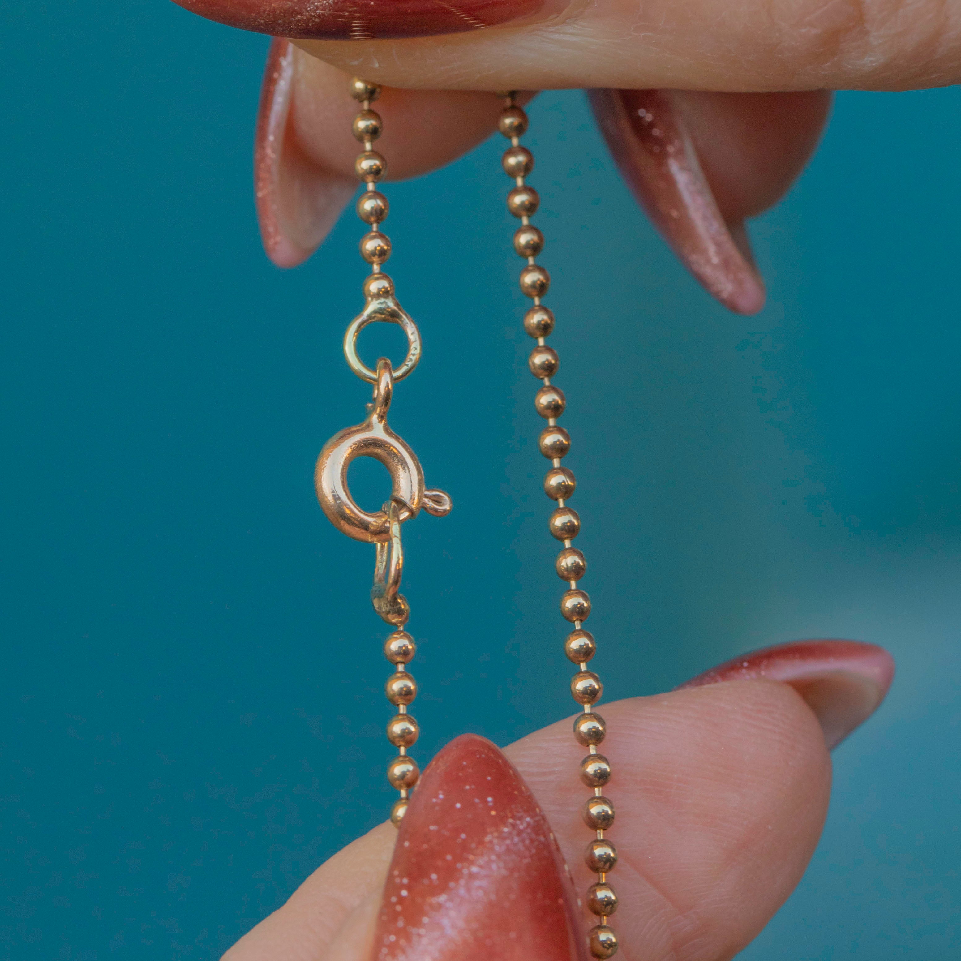 EXCELLENT. This 9ct Gold ball bead chain is in excellent condition. The Gold is bright and buttery, and the beads have retained their form well. With a fully functioning bolt ring, you can wear this superb vintage chain with absolute confidence!