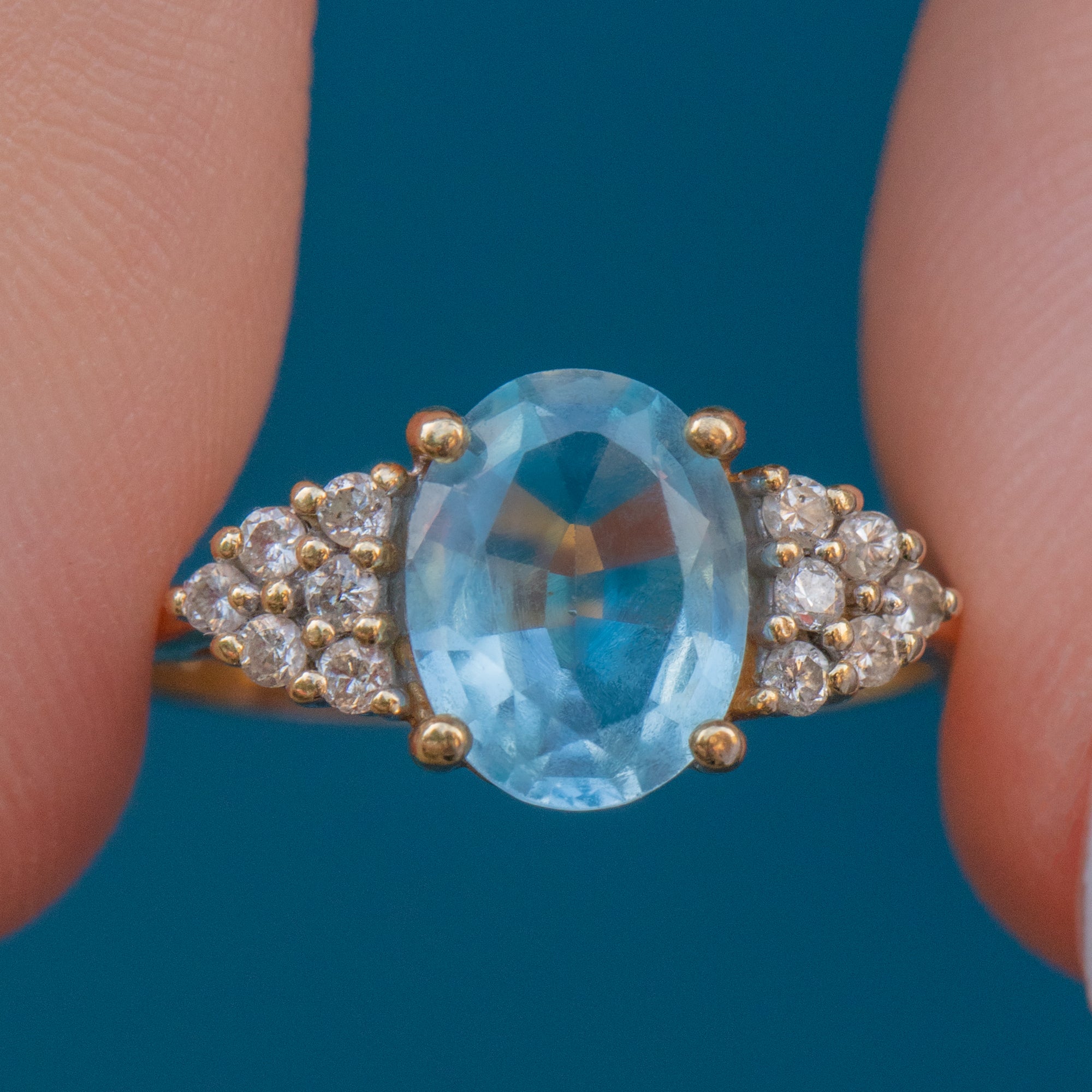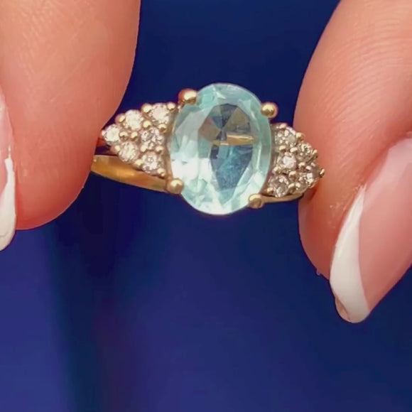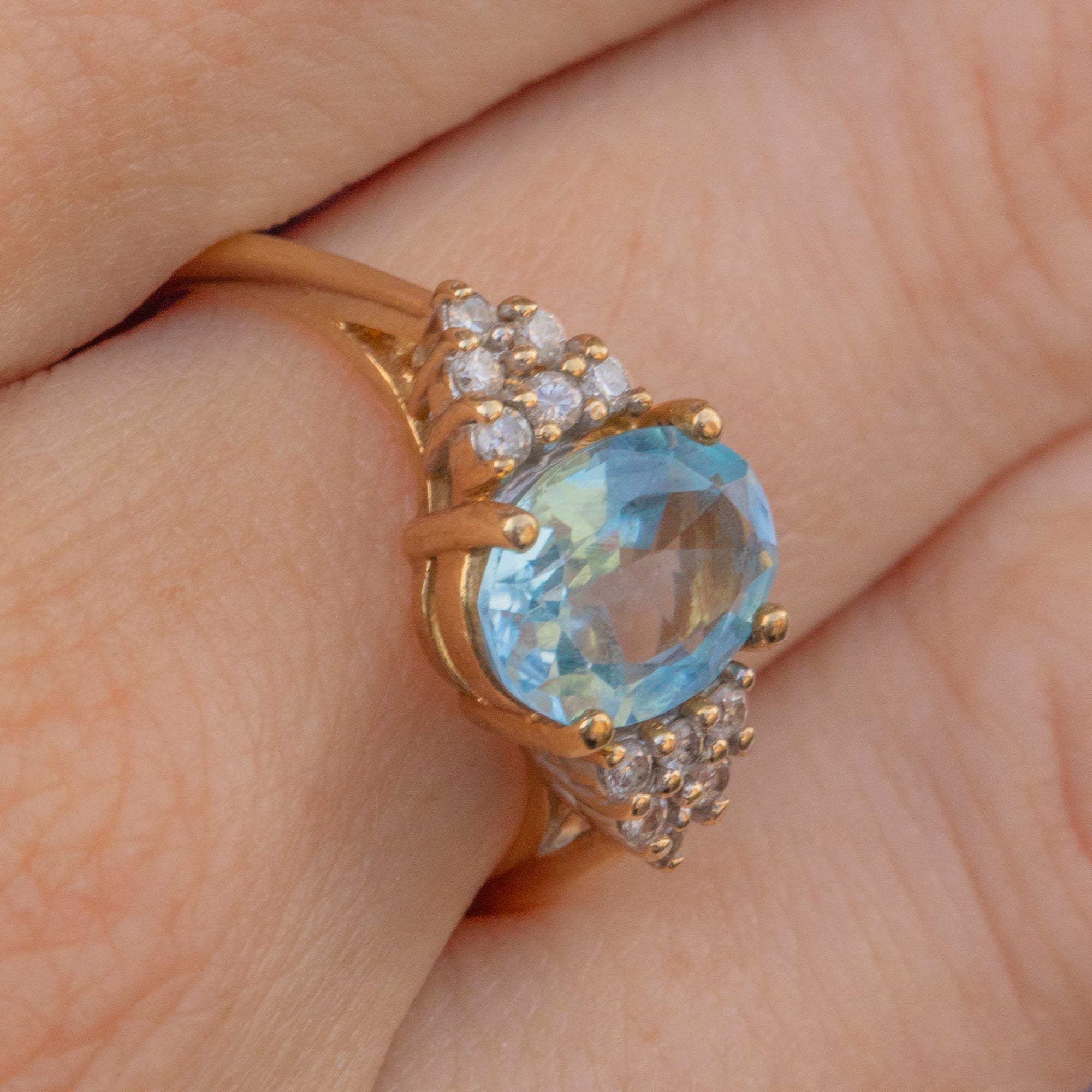 VERY GOOD-EXCELLENT This 9ct Gold Blue Topaz & Diamond Cluster Ring is in lovely condition. Her Blue Topaz is dazzling,with some very very light wear to the edge of the facets but still possessing an incredible hue! She and her scintillating Diamonds are securely set within their settings. The glossy 9ct Gold settings and band are all intact and free from any damage to note. Overall, this is a divine statement ring if you're looking to set your collection apart from the rest!