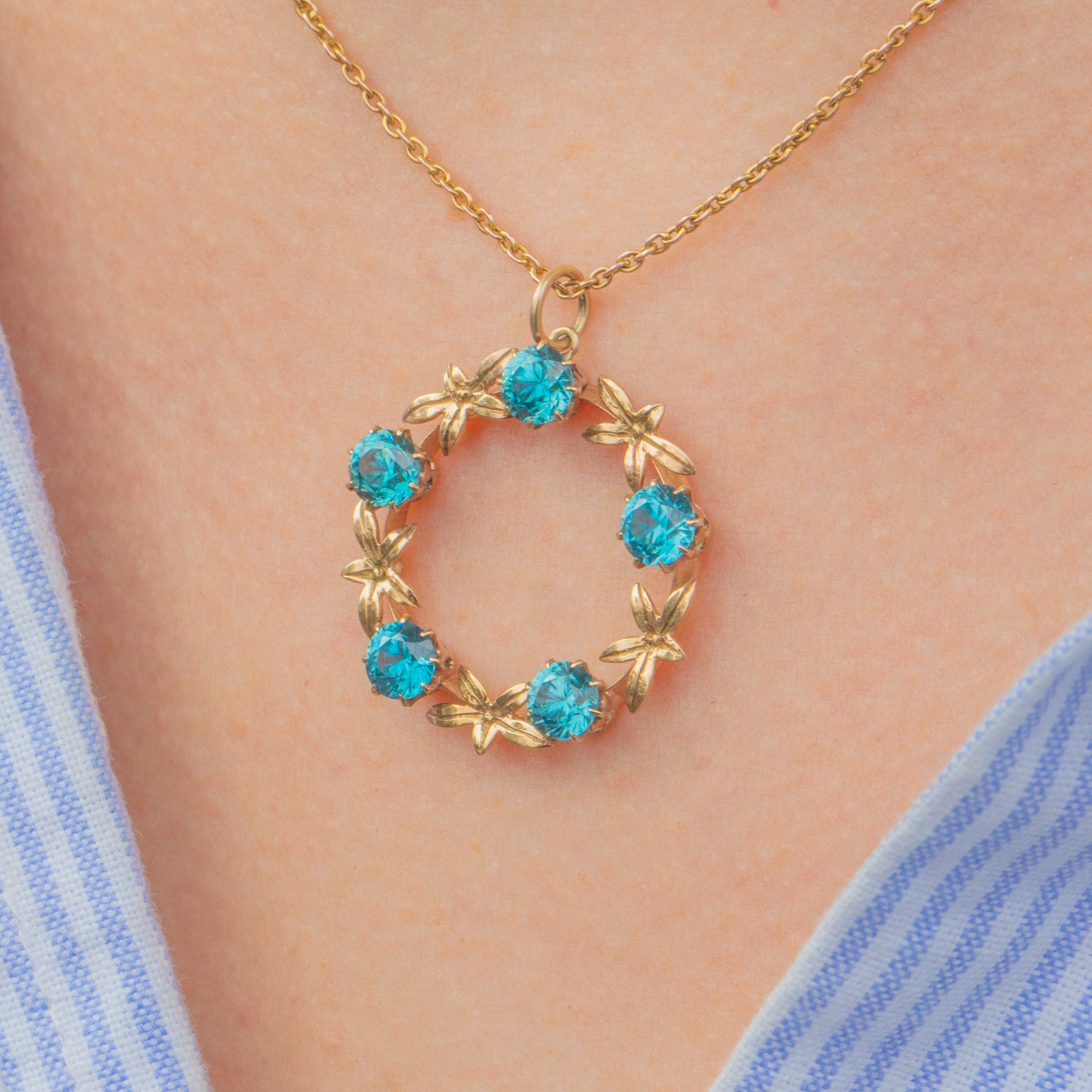 VERY GOOD-EXCELLENT. This 9ct Gold blue Zircon roundel pendant is in wonderful condition. The Zircons are pristine, with no chips or abrasions, and are secure within their claw settings. There is subtle evidence of a previous brooch conversion on the back, but this has been carried out well and the back is smooth and comfortable against the skin. The Gold has a lovely saturation and the floral details have remained defined and are securely affixed.