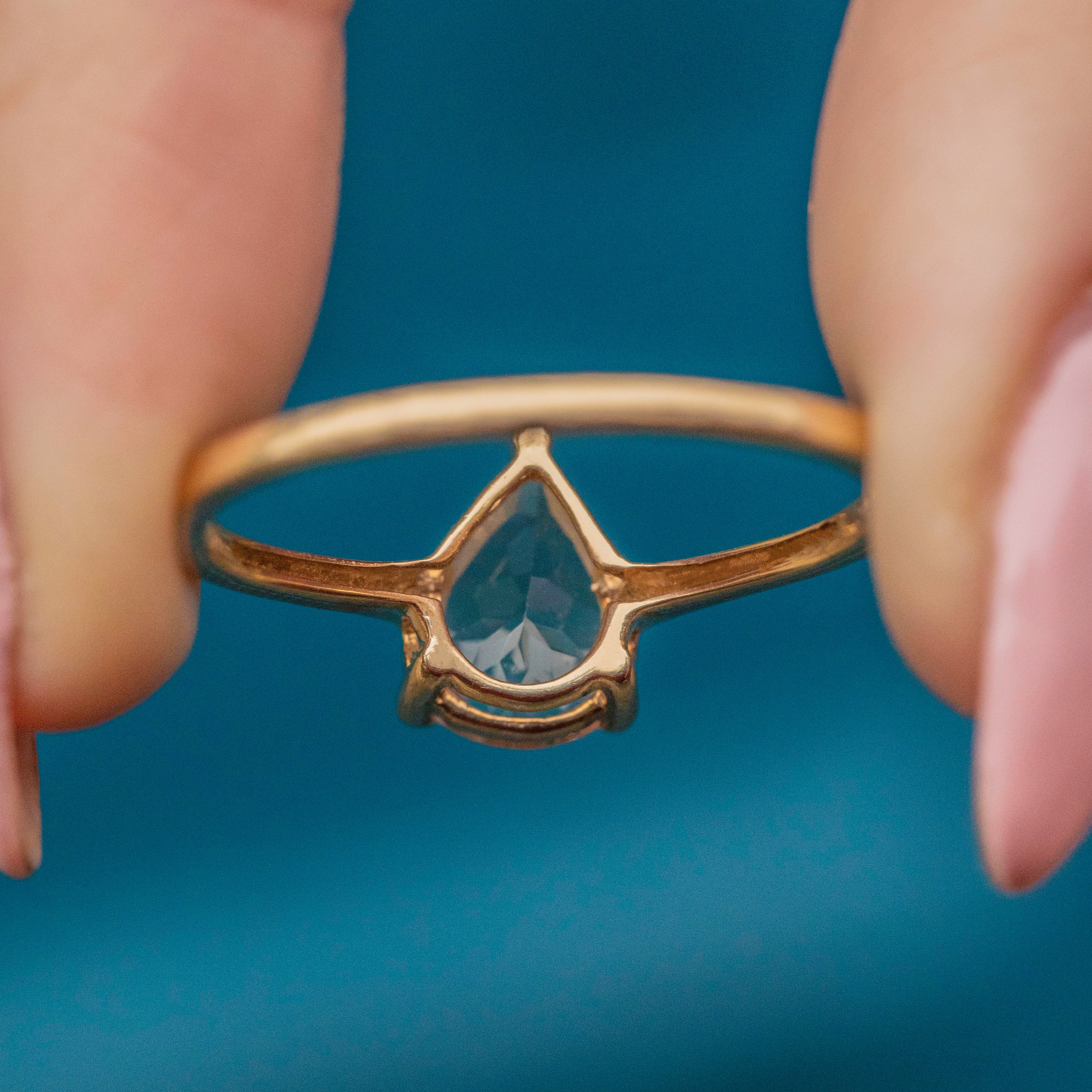 EXCELLENT. This 9ct Gold blush Tourmaline pear-cut ring is in excellent condition! The blush Tourmaline is secure, fabulously faceted, and emanates crisp pastel glistens. The Gold band is well formed, allowing for comfortable wear and displays a full set of English hallmarks inside. This solitaire ring provides endless styling opportunities.