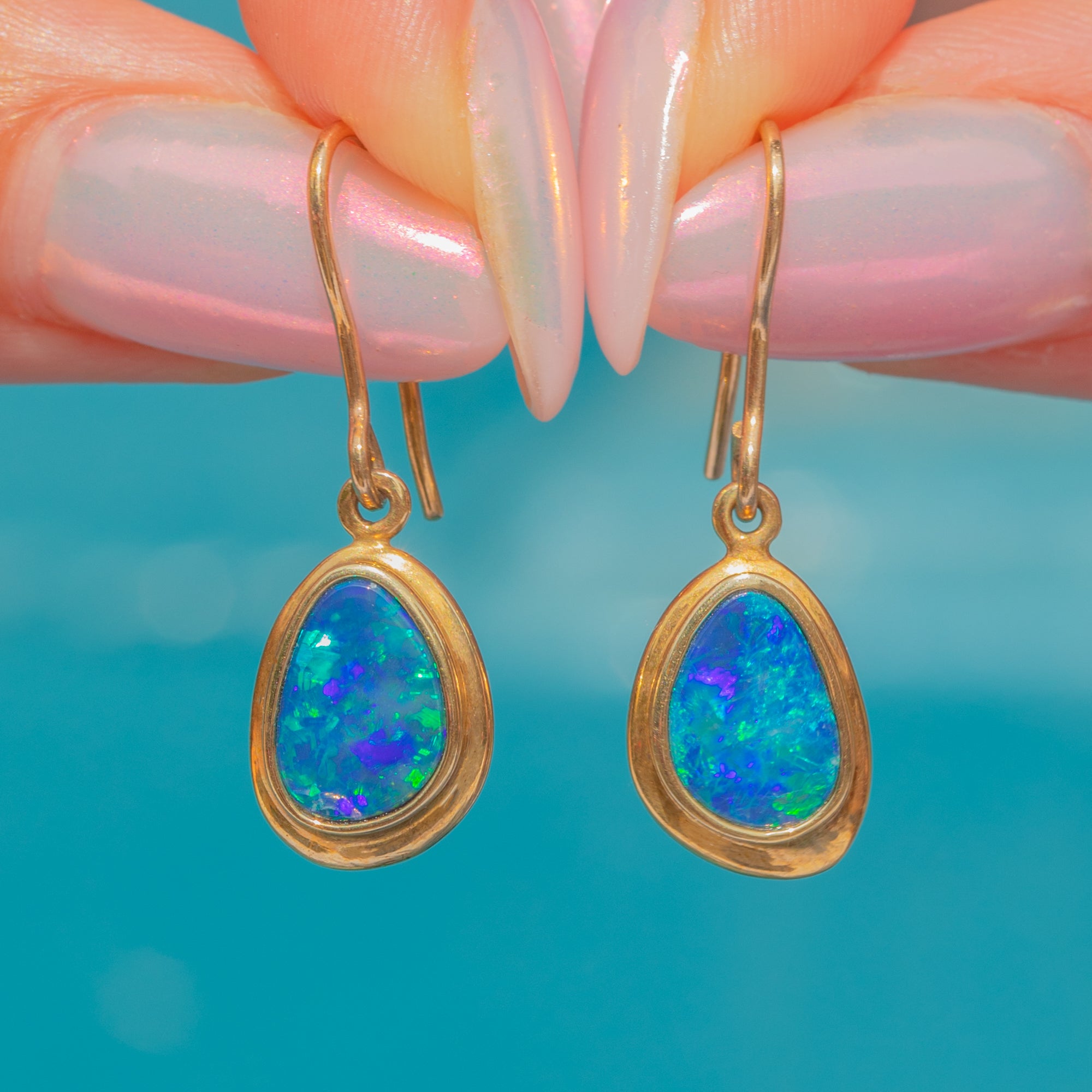 These elegant 9ct Gold drop earrings are inlaid with vibrant Boulder Opals, each one bursting with tantalising shimmers of sea green and purple across their dark blue cores.