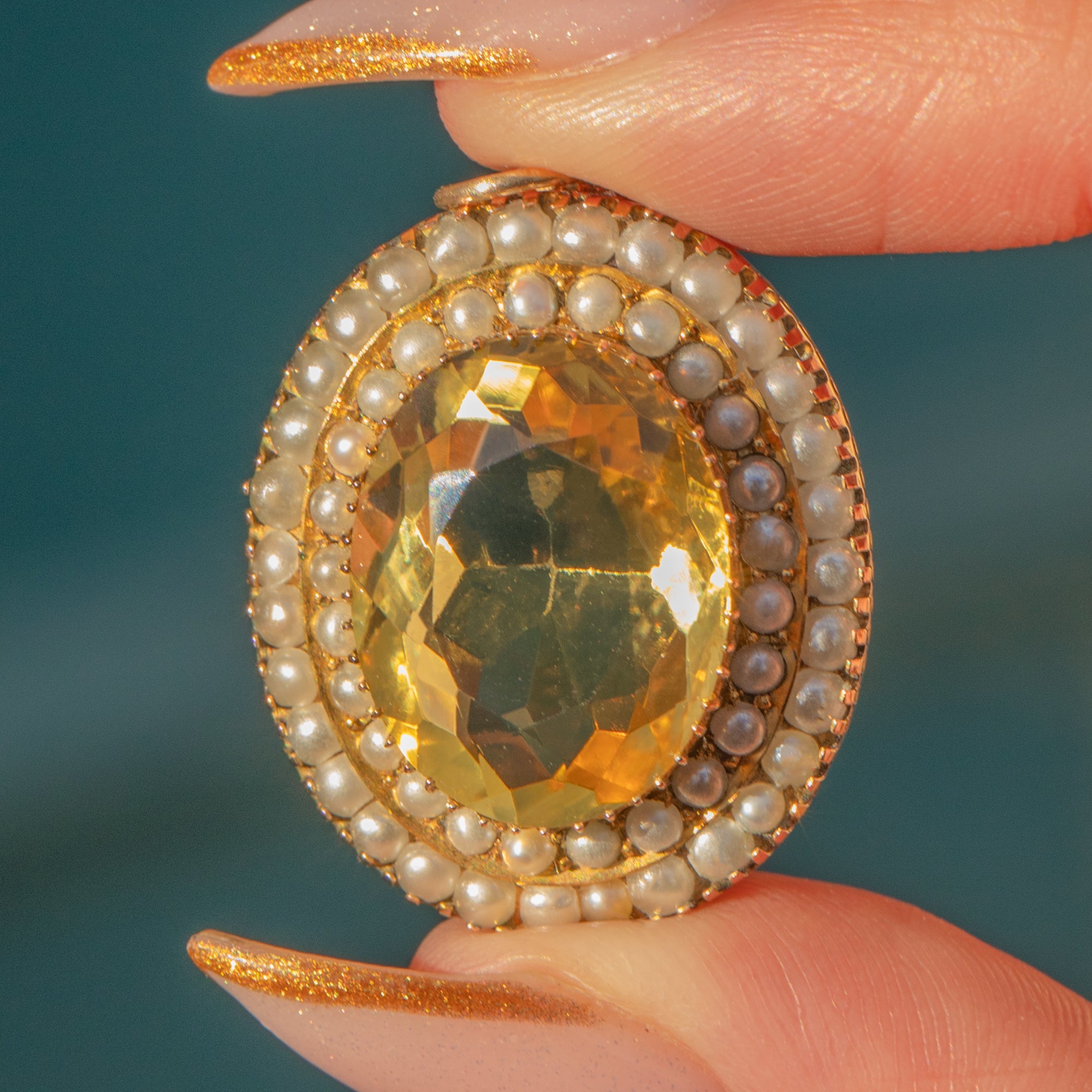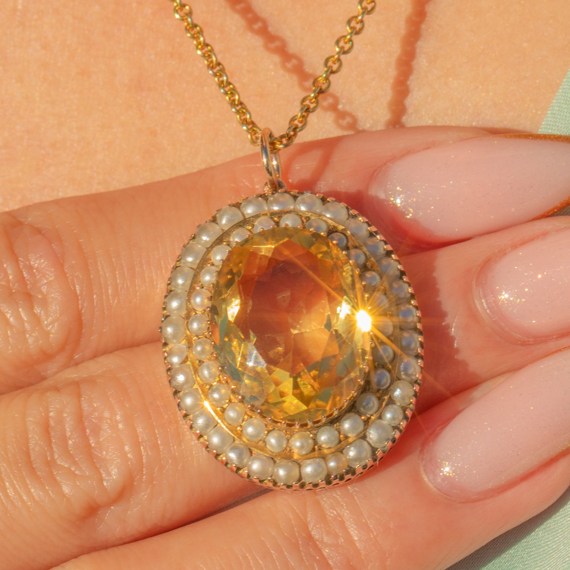 This beautiful Victorian pendant centres on a glowing golden 6.95ct Citrine framed by a halo of creamy Pearls. The rich honey-yellow of the Citrine and the soft lustre of the Pearls are the perfect pairing, all set in warm antique 9ct Gold for a wonderfully romantic look.