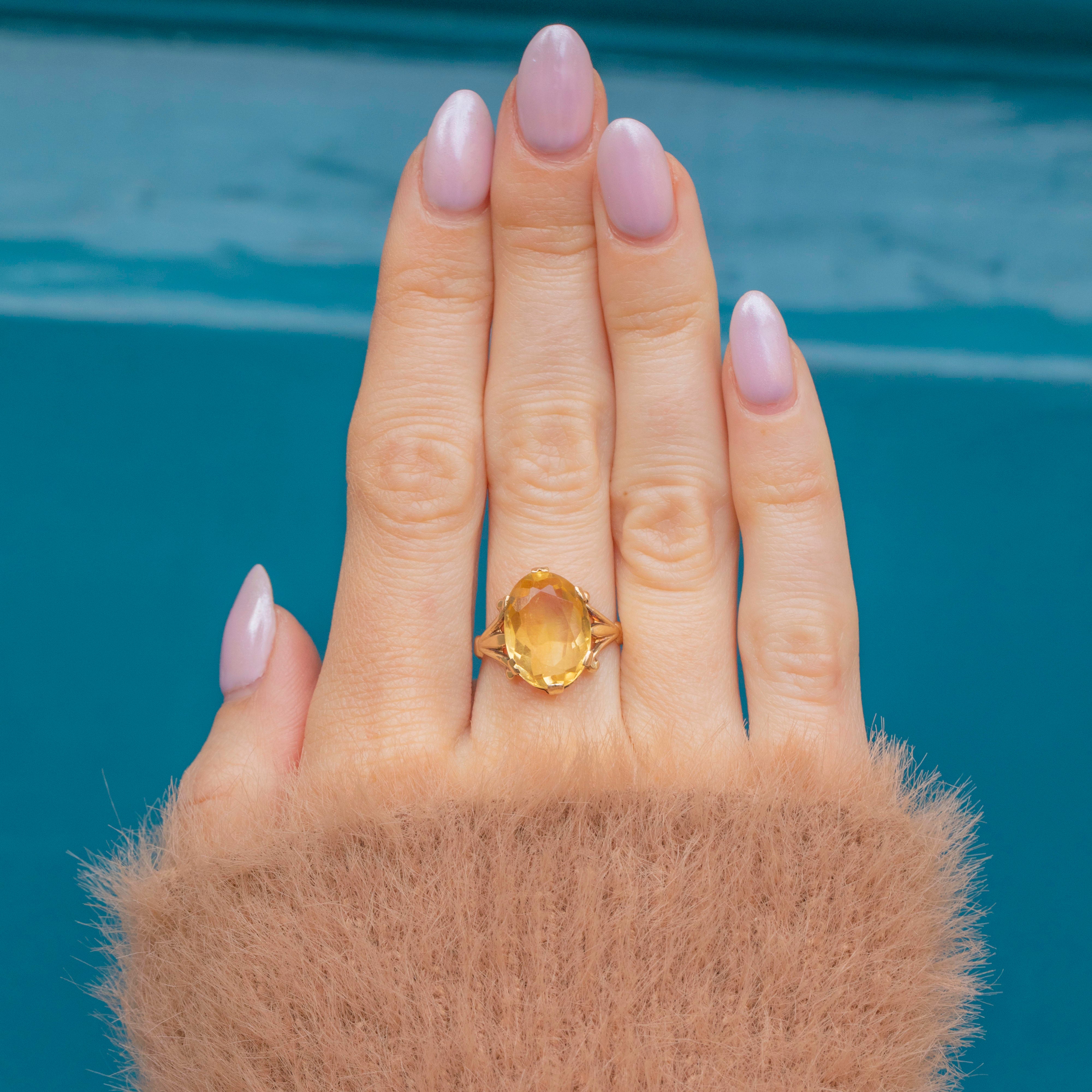 EXCELLENT. This 9ct Gold Citrine dress ring is in excellent condition. The Citrine is secure within its settings and free from chips or abrasions. The ring has lovely split shoulders that lead out onto a gorgeously smooth band, stamped and dated to 1961. You will love wearing this ring!