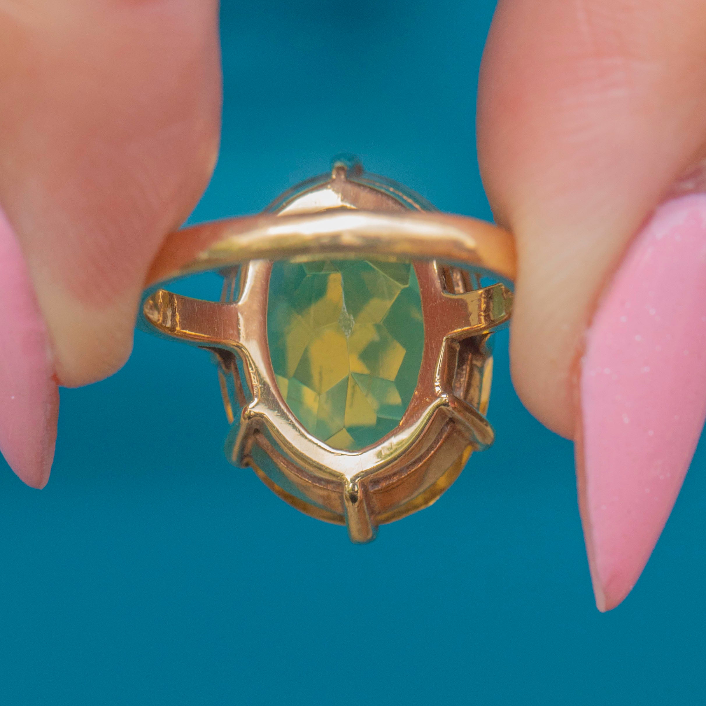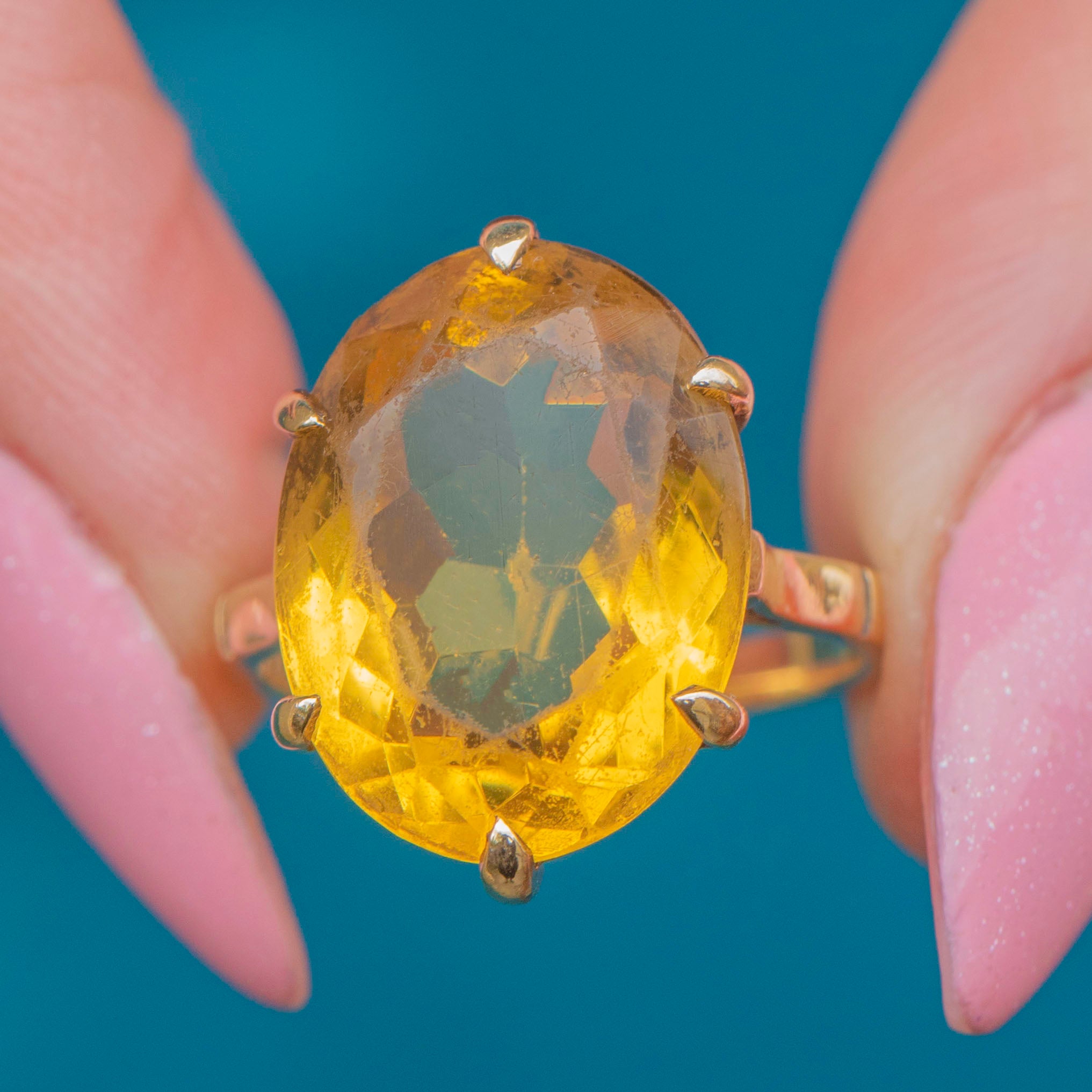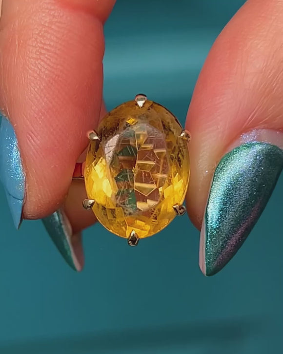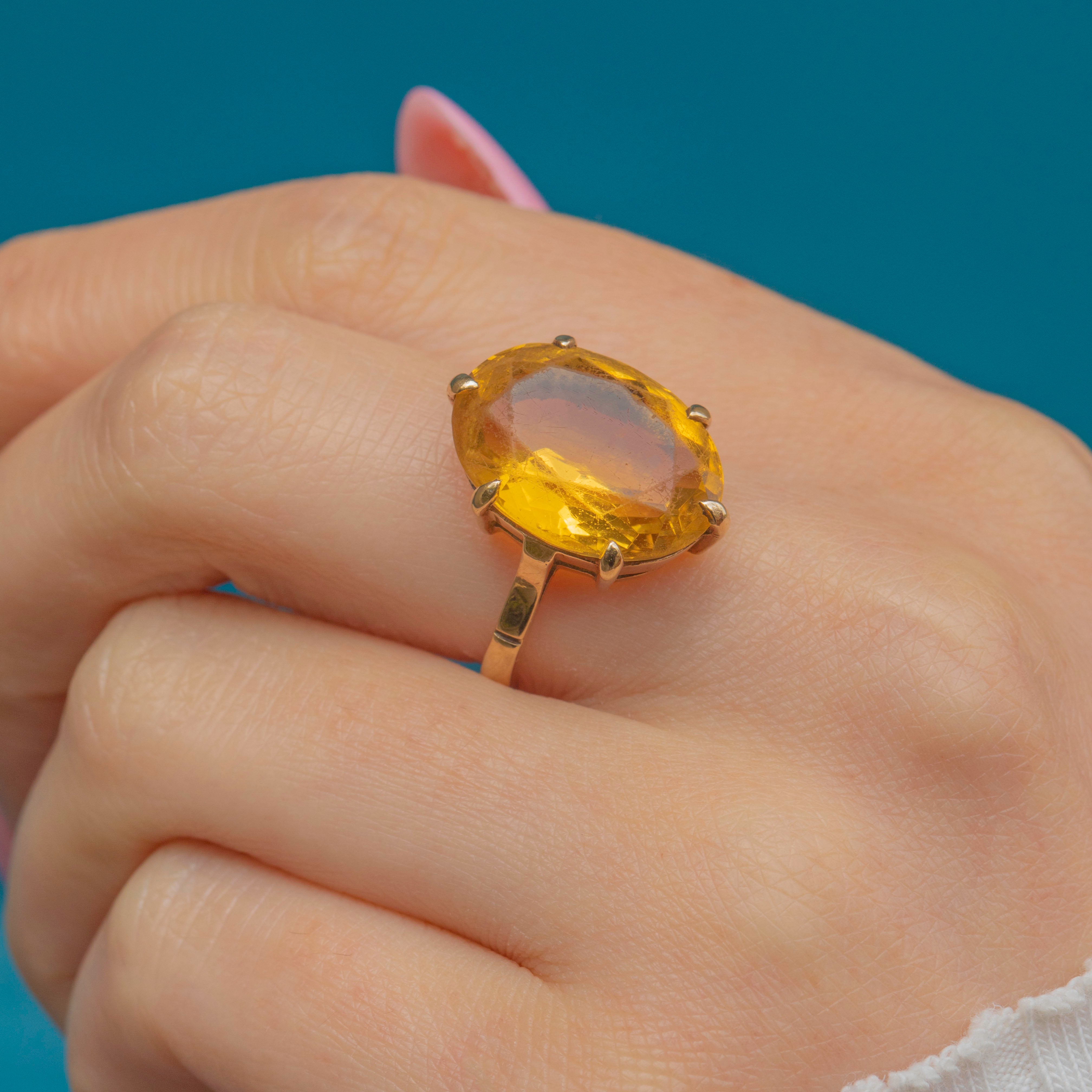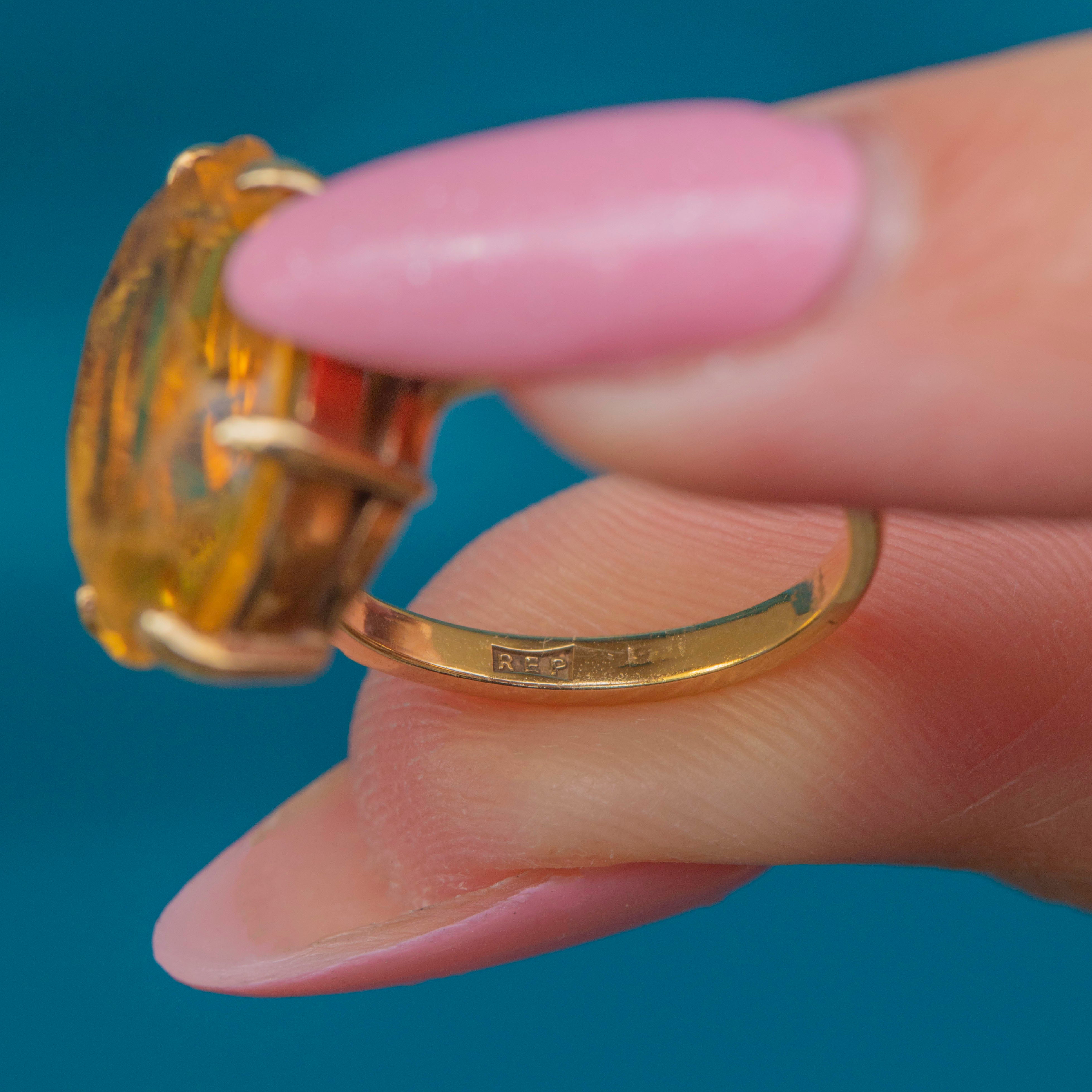 VERY GOOD-EXCELLENT: This vintage 9ct Gold 6.00ct Citrine dress ring is in great condition! Her Citrine is radiant, with some minor surface scratches which are difficult to see without a loupe. Set securely in her claw settings, this Citrine ring can be worn with utmost confidence!