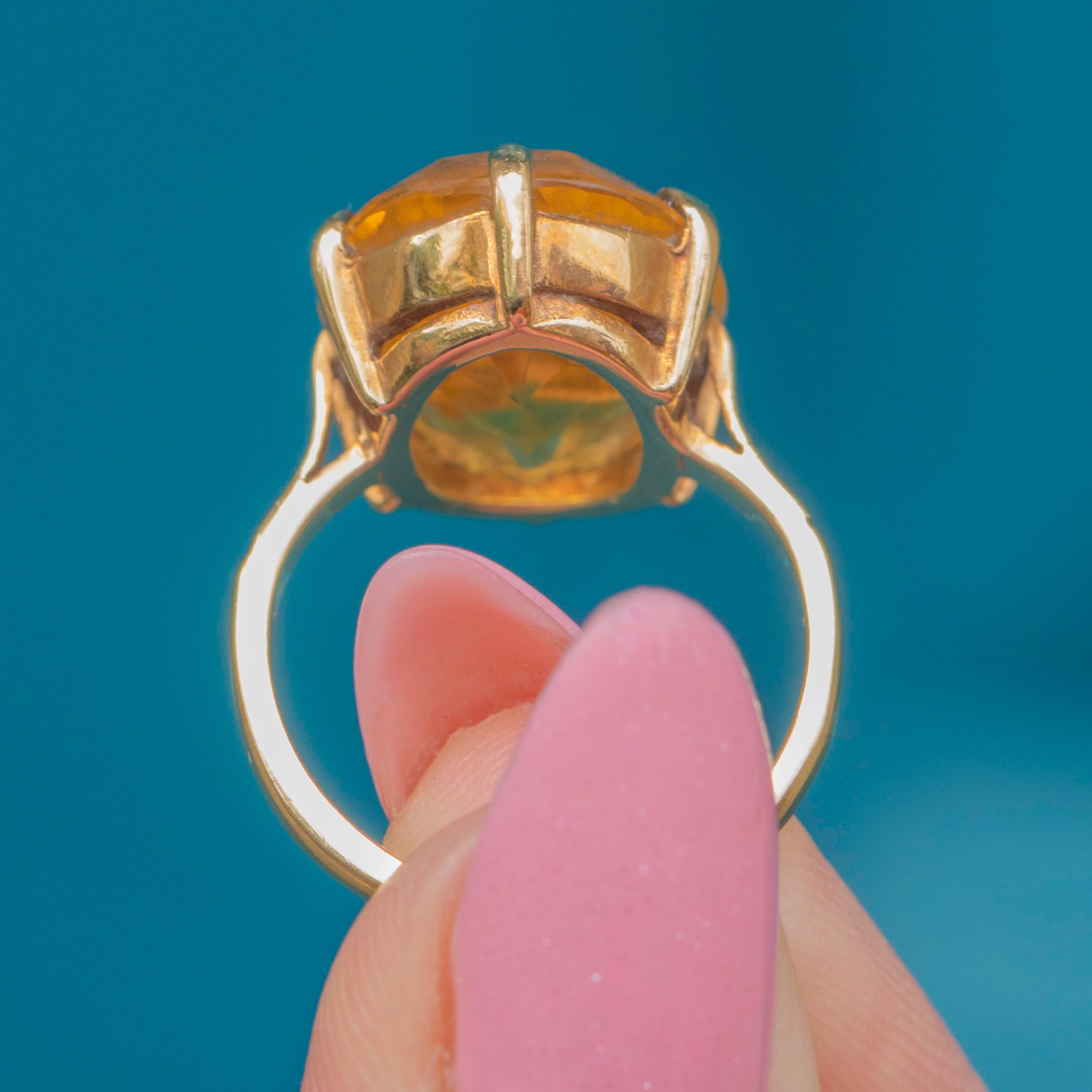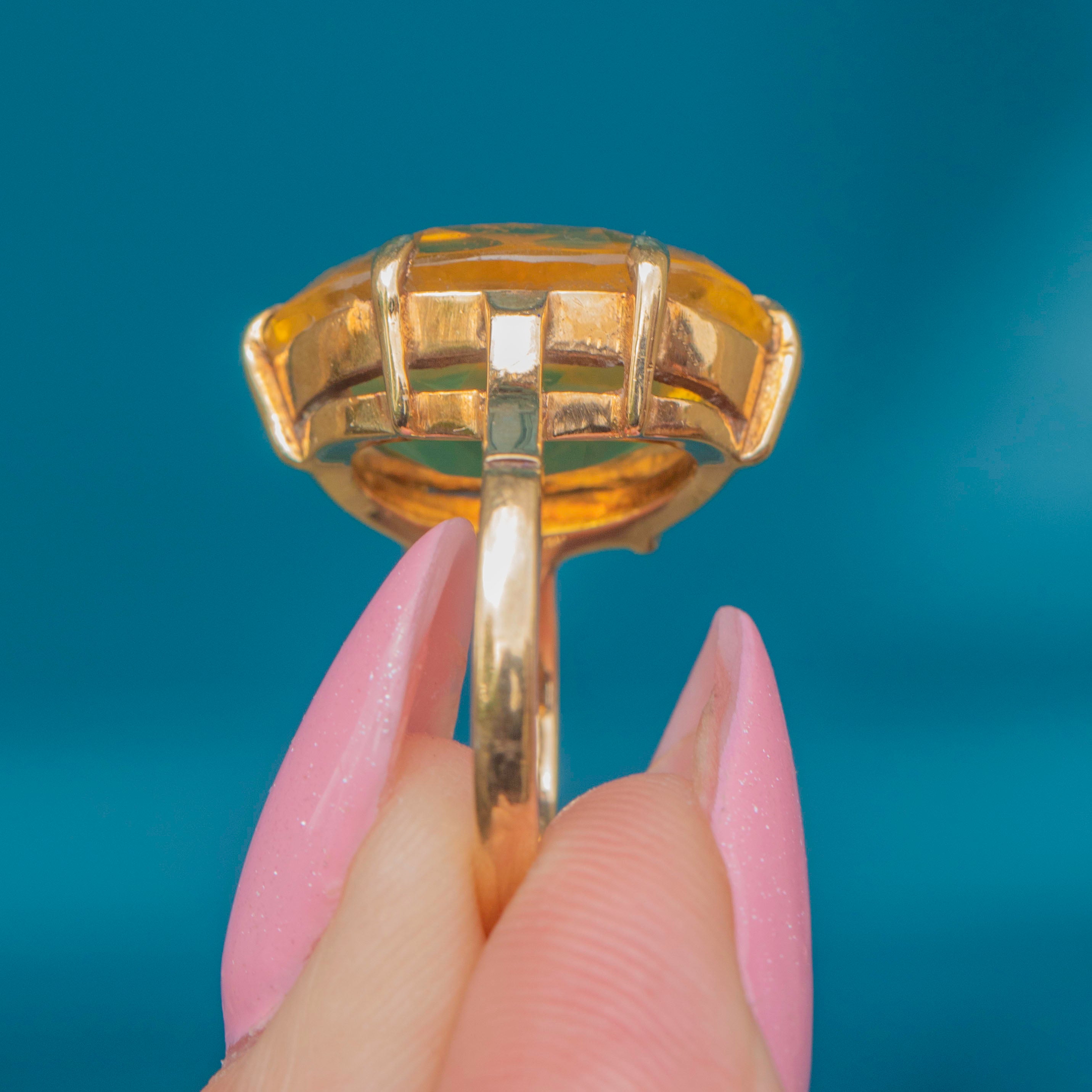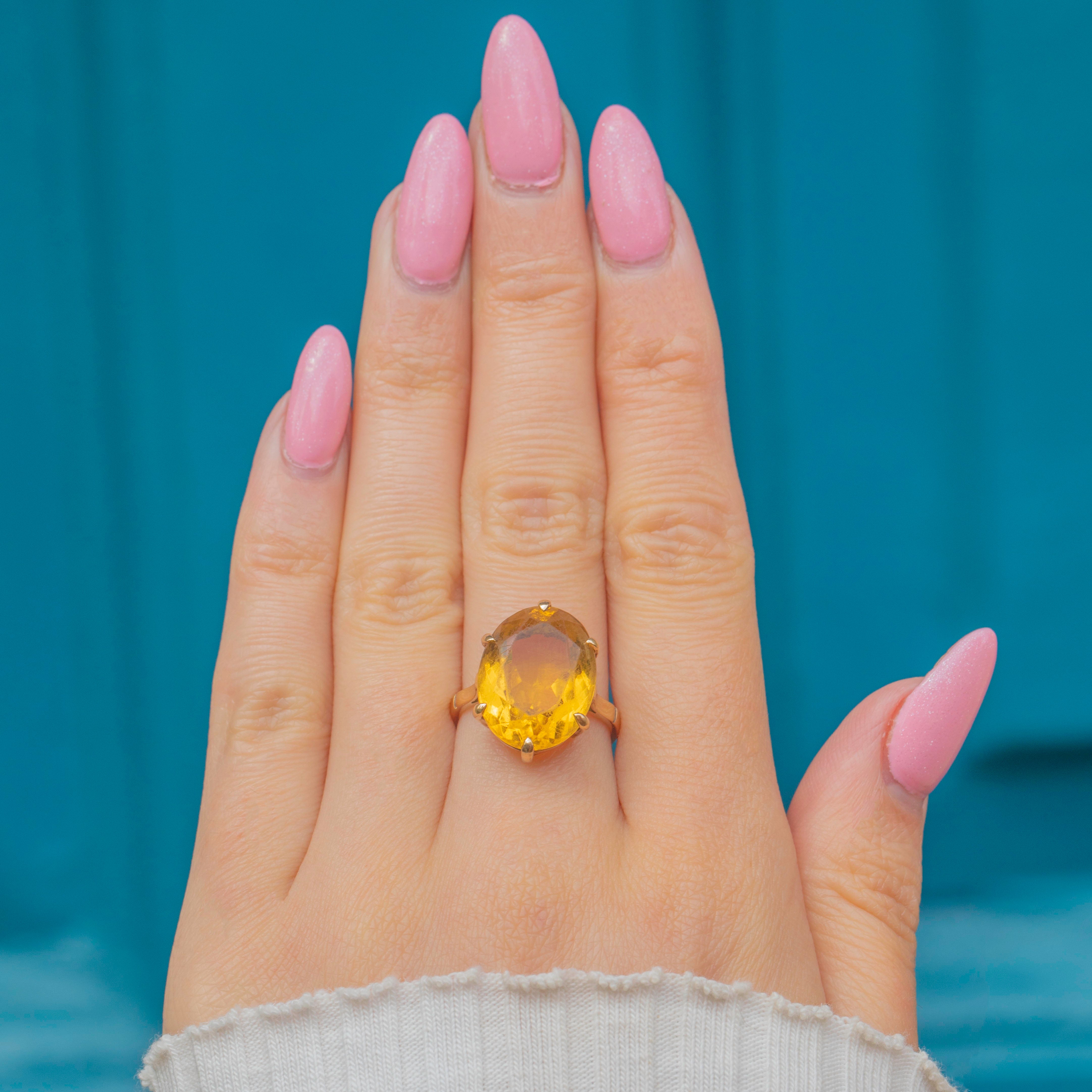 Light dances across the crisply faceted Citrine, glimmering with sweet marmalade hues. Akin to a burst of sunshine, Citrine is a gemstone believed to bring joy and prosperity; this vintage ring is sure to brighten up your collection as we head into summer!