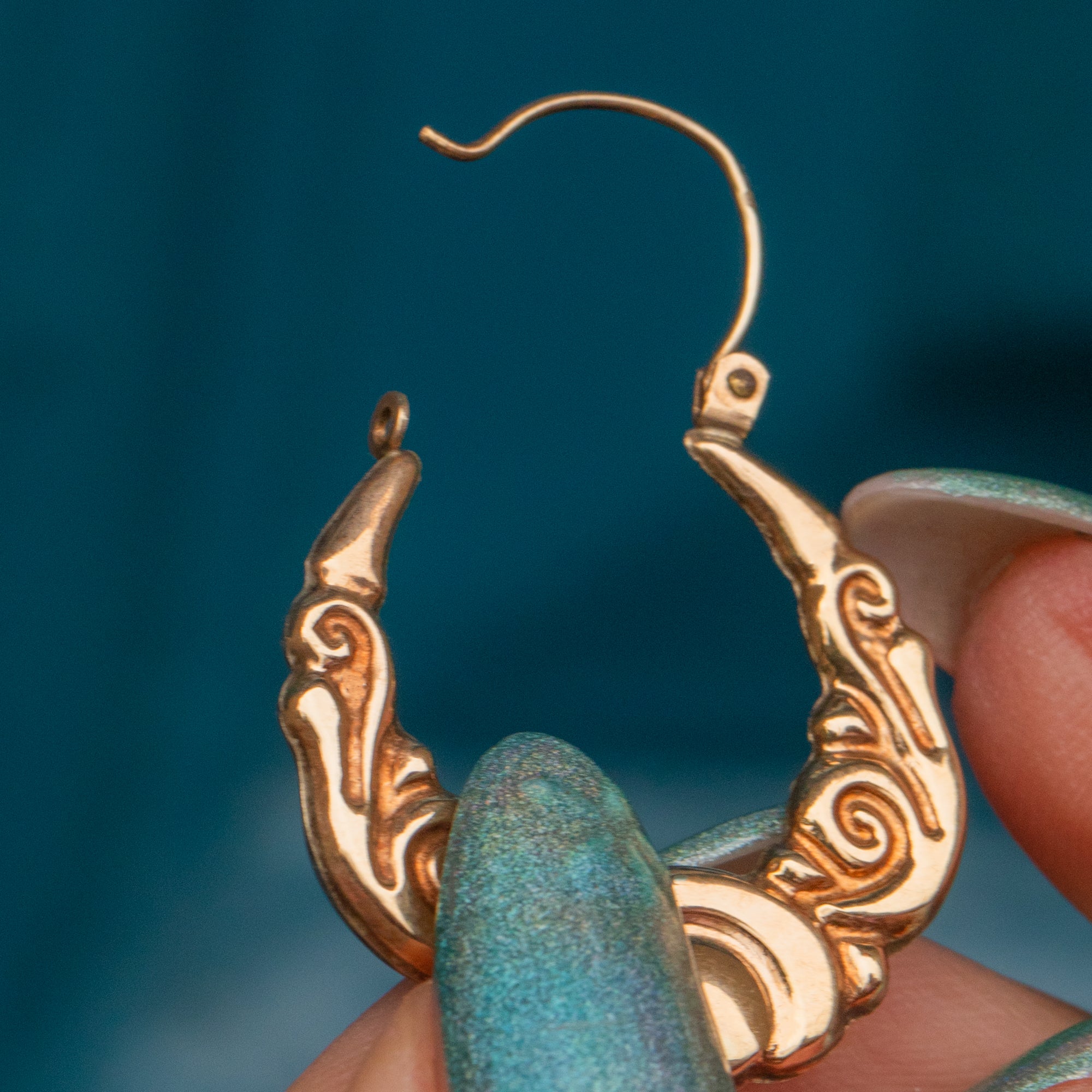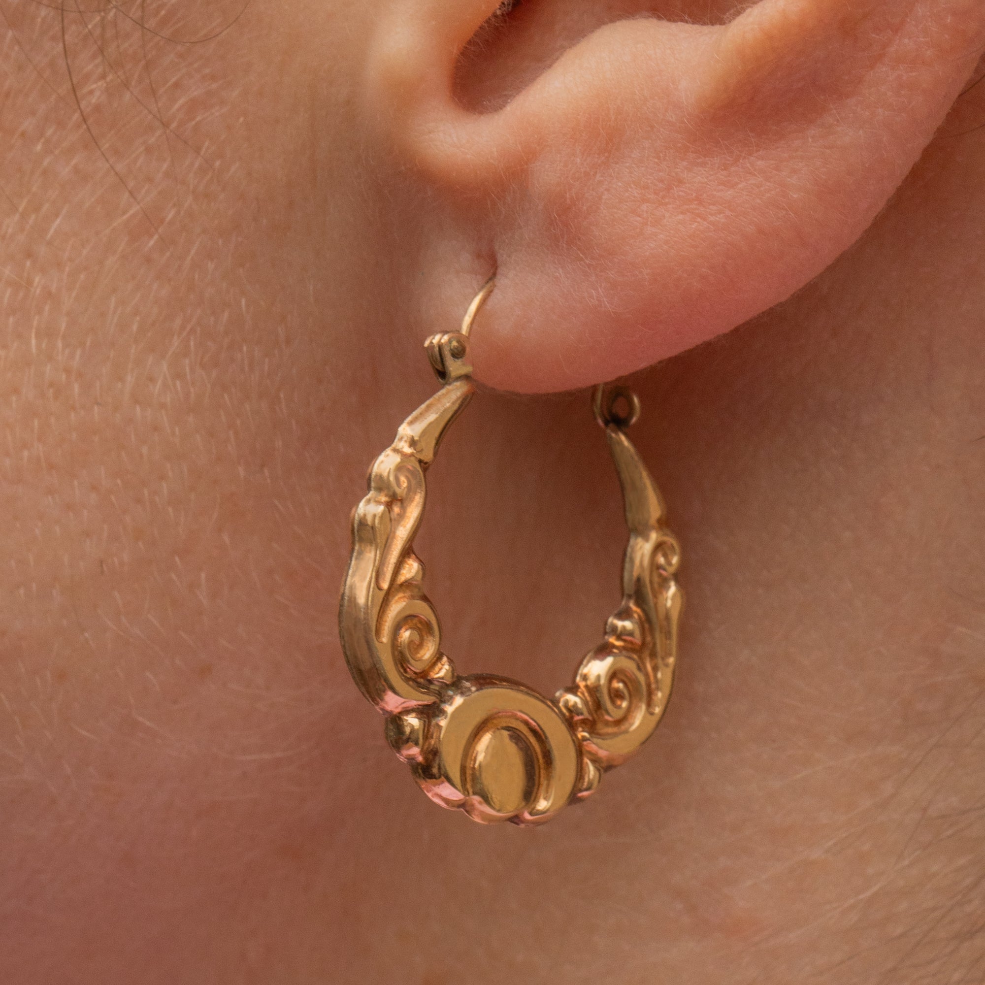 VERY GOOD-EXCELLENT. These 9ct Gold Creole hoop earrings are in wonderful condition! The details are crisp throughout and they have retained a great form. There is some darkening to the Gold that runs along the edge, but rest assured this isn't noticeable when worn. With ear levers that securely hold the earring in place, you can wear these vintage Creole hoops with the utmost confidence!