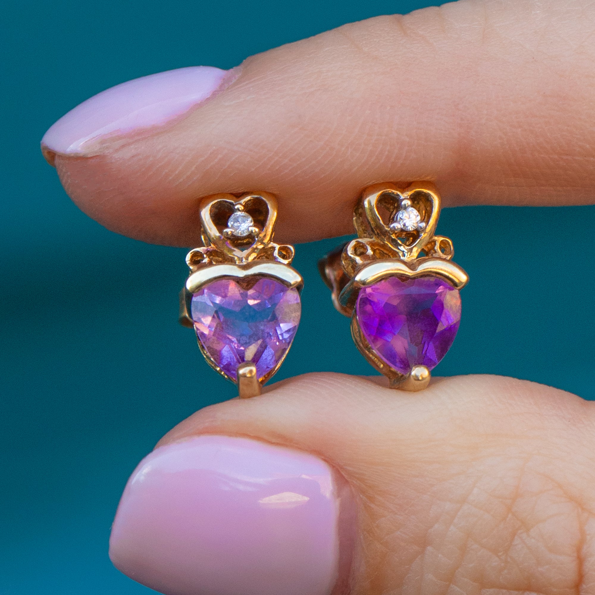 Aren't these 9ct Gold crowned Amethyst heart stud earrings the prettiest pair?! Cut to perfection, their Amethyst hearts burst with vivid lavender hues, crowned by a dazzling Diamond within a Gold heart.