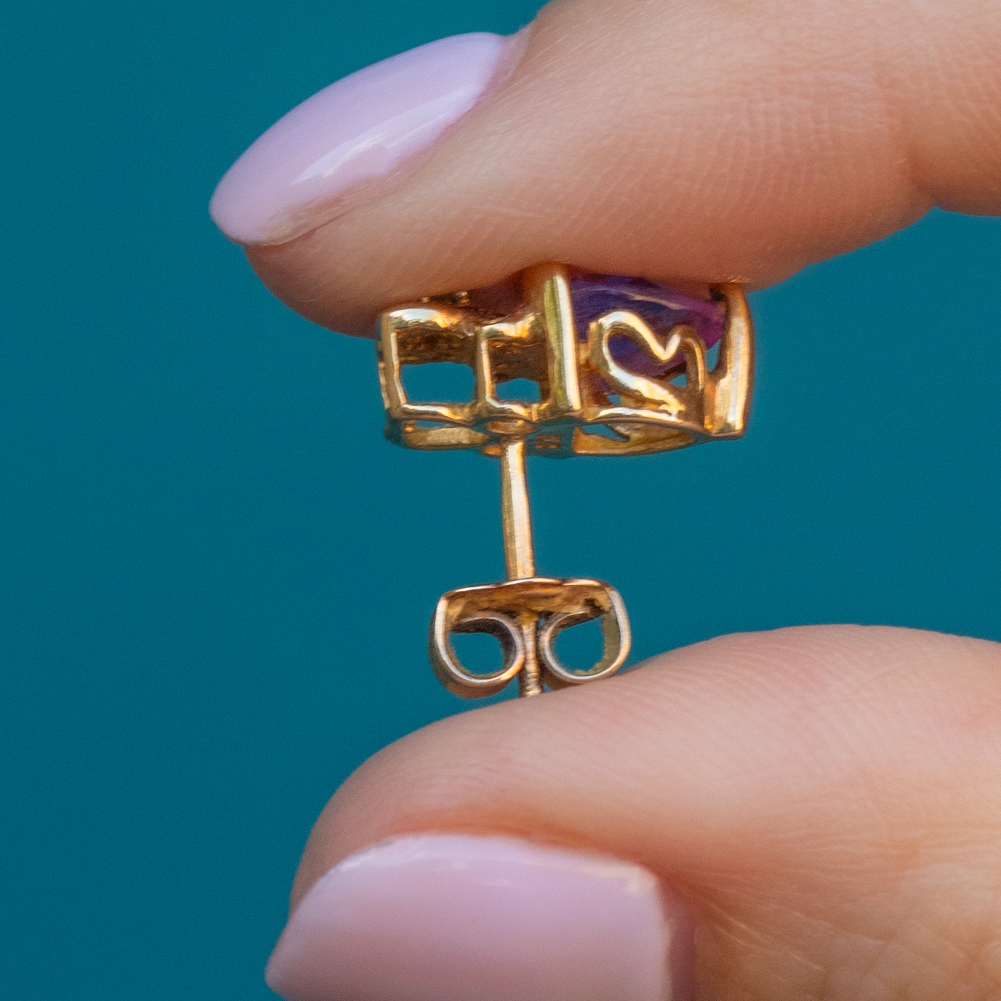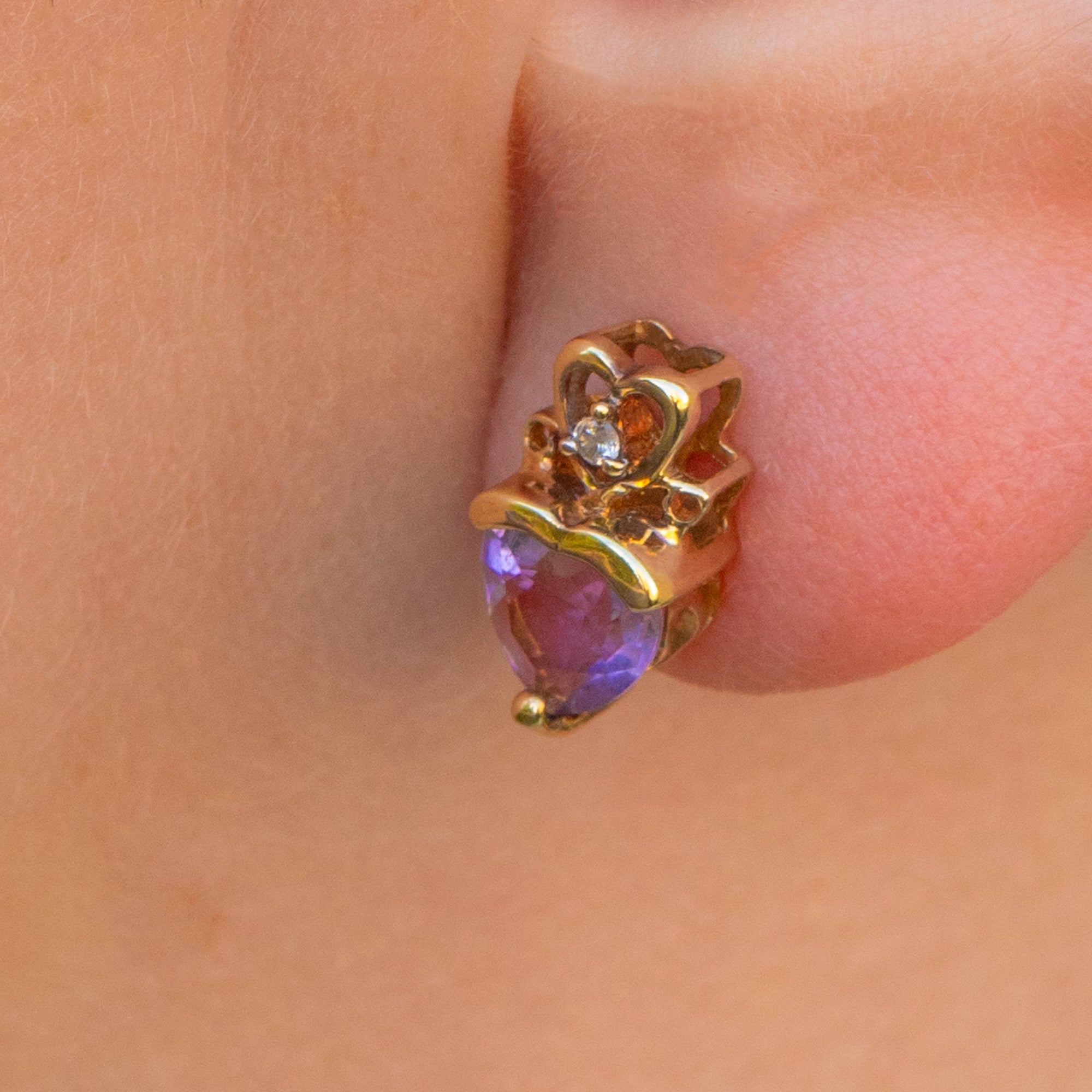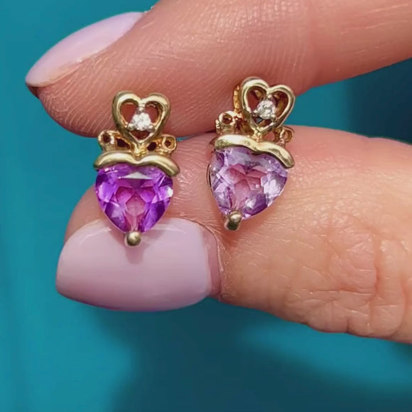 EXCELLENT. With the gemstones in pristine condition, structurally sound Gold, and secure fitting butterfly backs, these 9ct Gold crowned Amethyst heart stud earrings are in excellent condition!