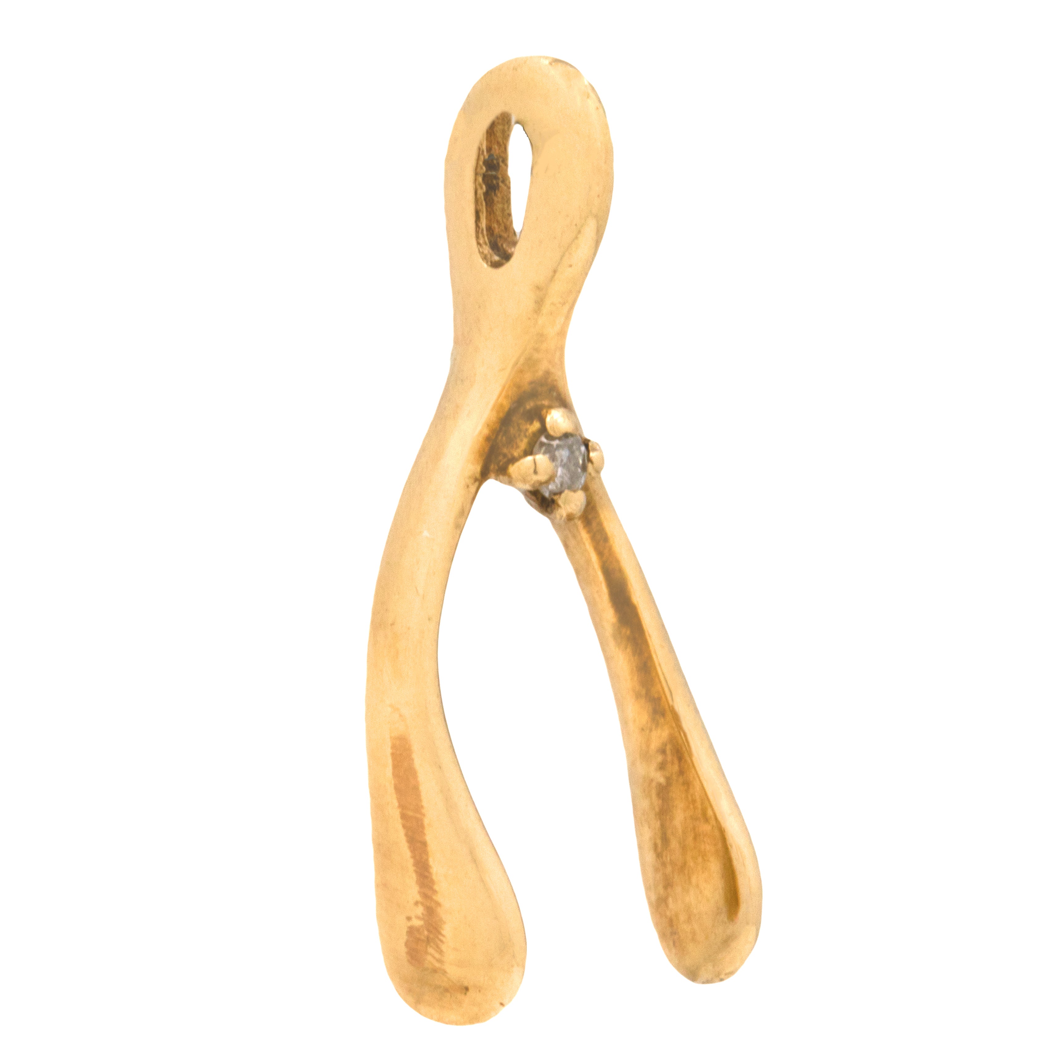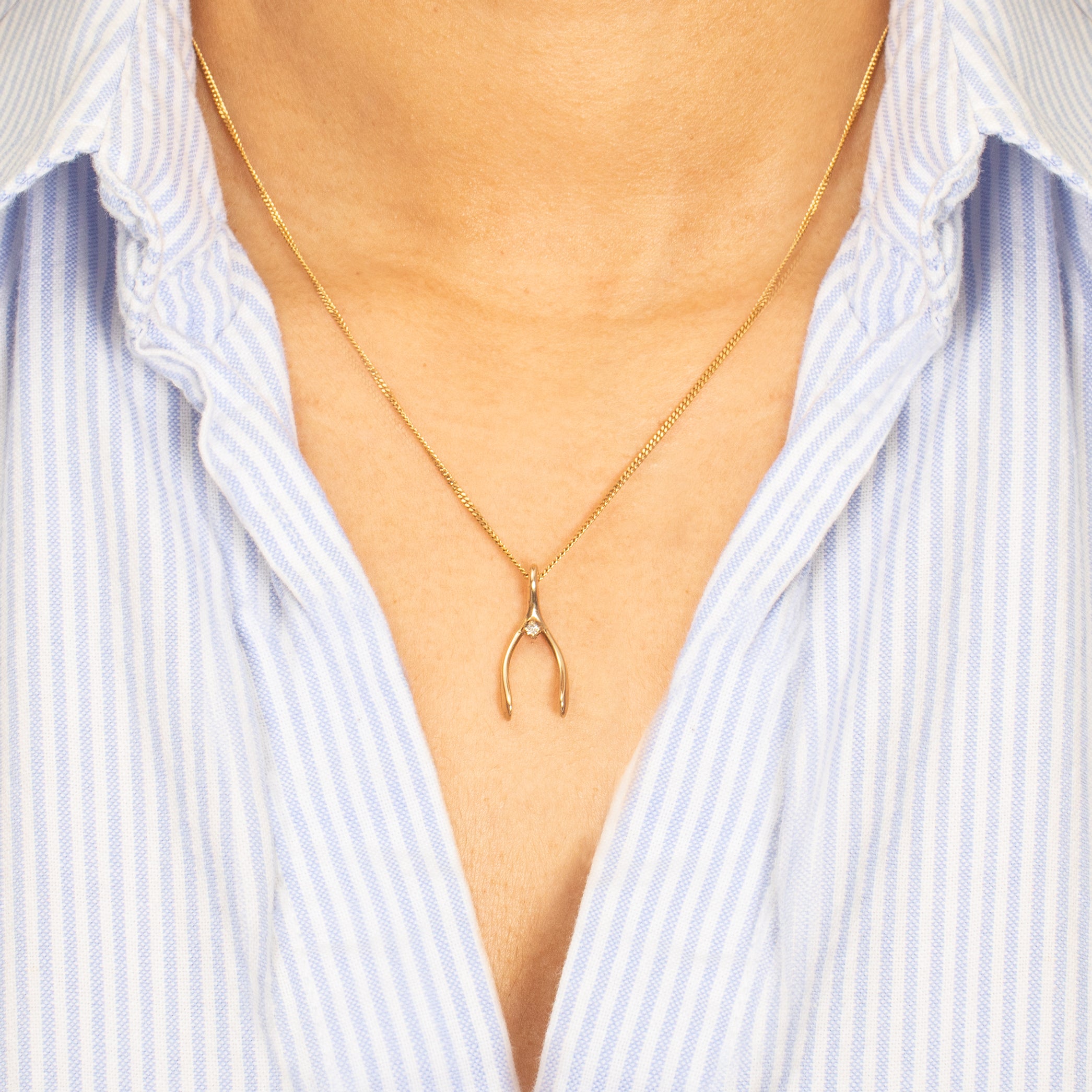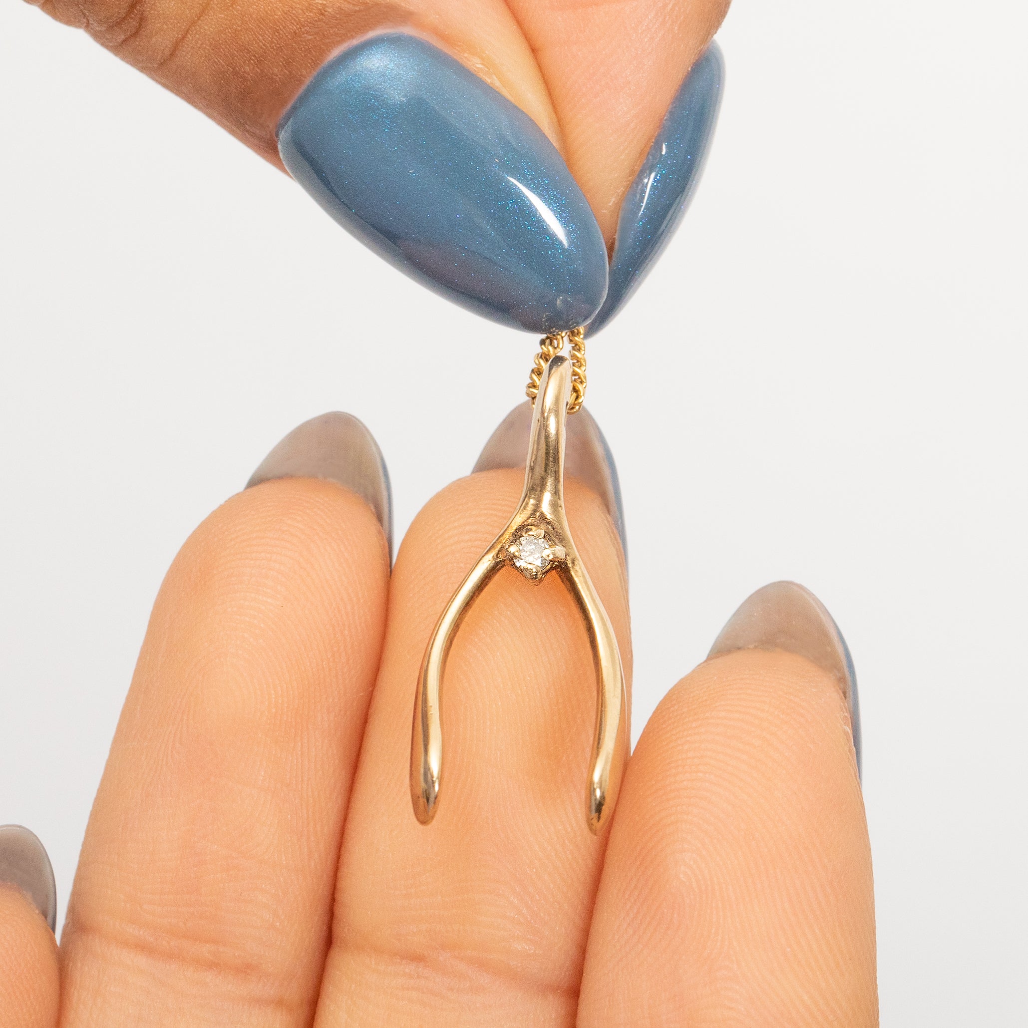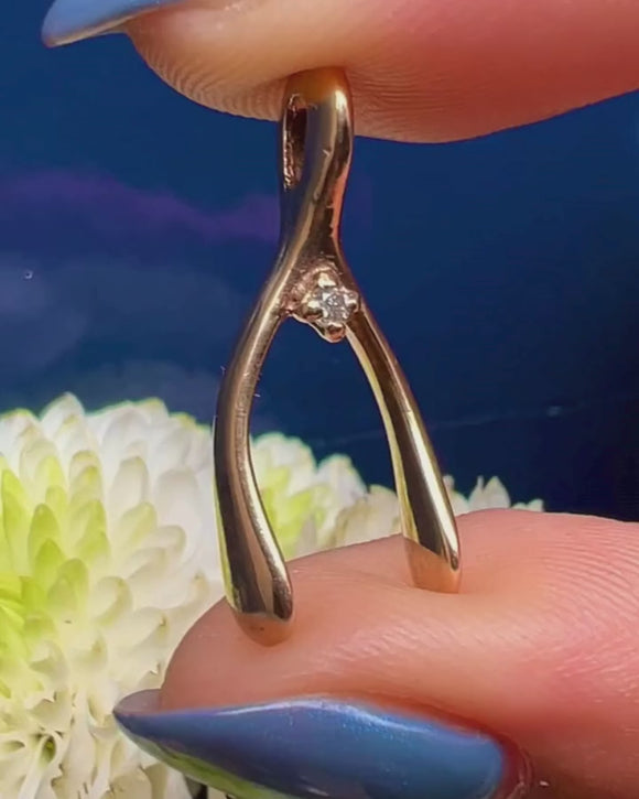Keep this 9ct Gold Diamond wishbone pendant close at all times and may all your wishes come true! Crafted from glossy 9ct Gold with a dainty Diamond poised at her centre, this slender Vintage wishbone pendant is steeped in symbolism.