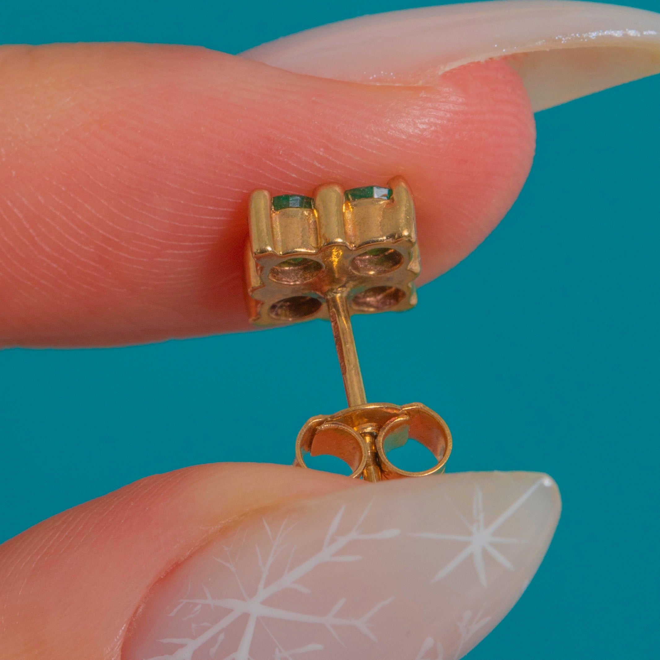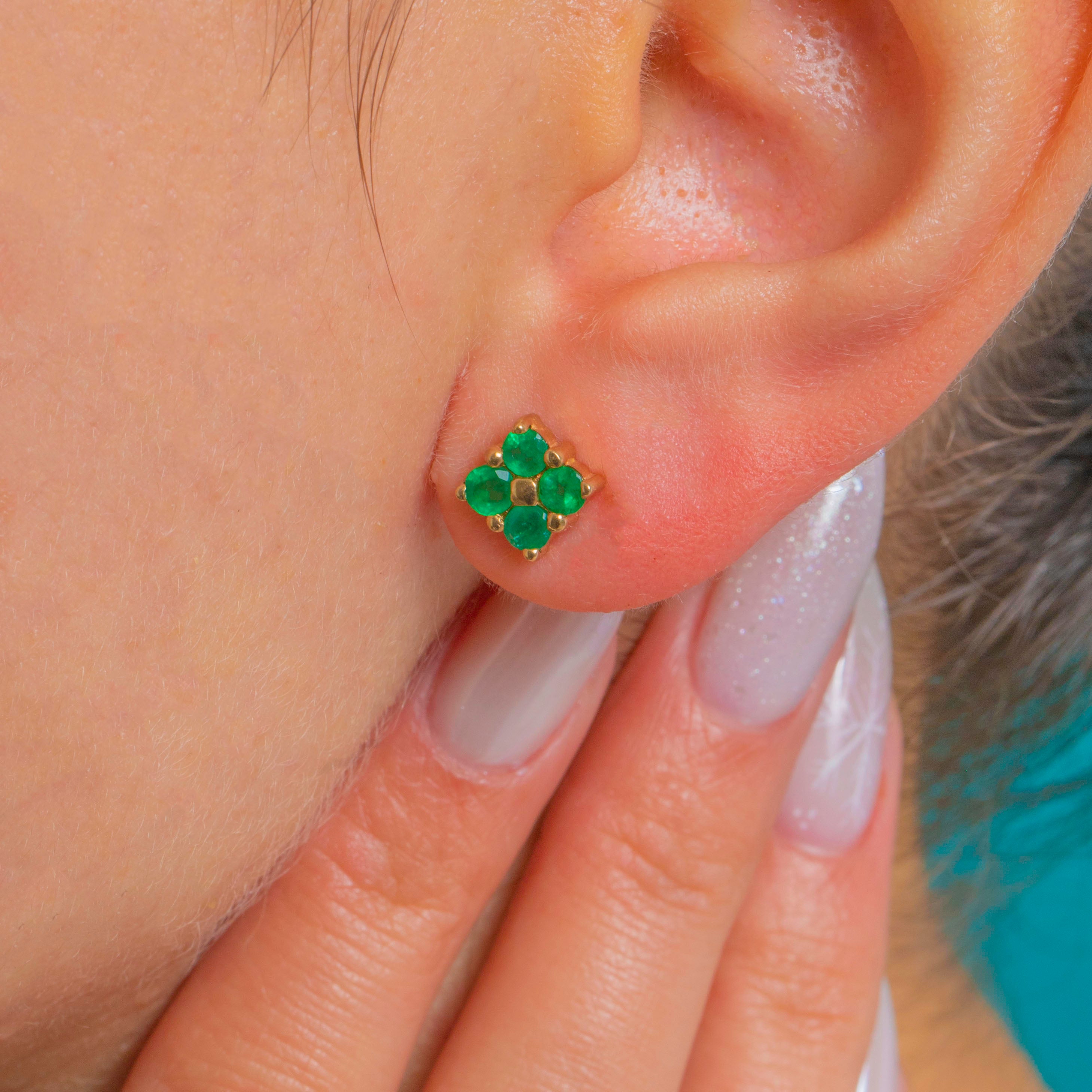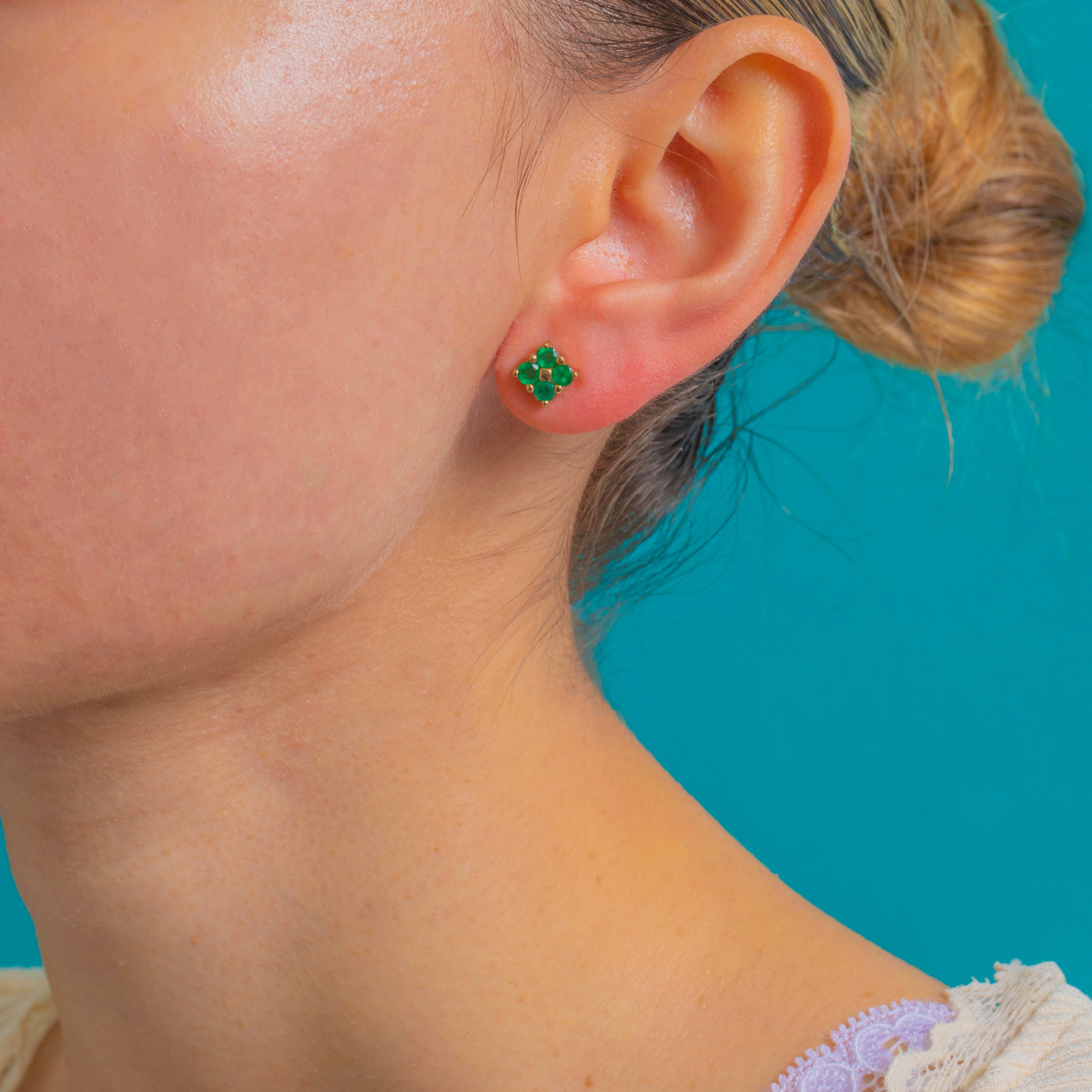Perfectly petite and beautifully bright, these Vintage 9ct Gold Emerald flower studs are a timeless everyday luxury. Each earring forms a four‑leaf clover/quatrefoil with vivid green Emeralds circling a domed Gold bead, the open backs inviting light through for a lively glow.