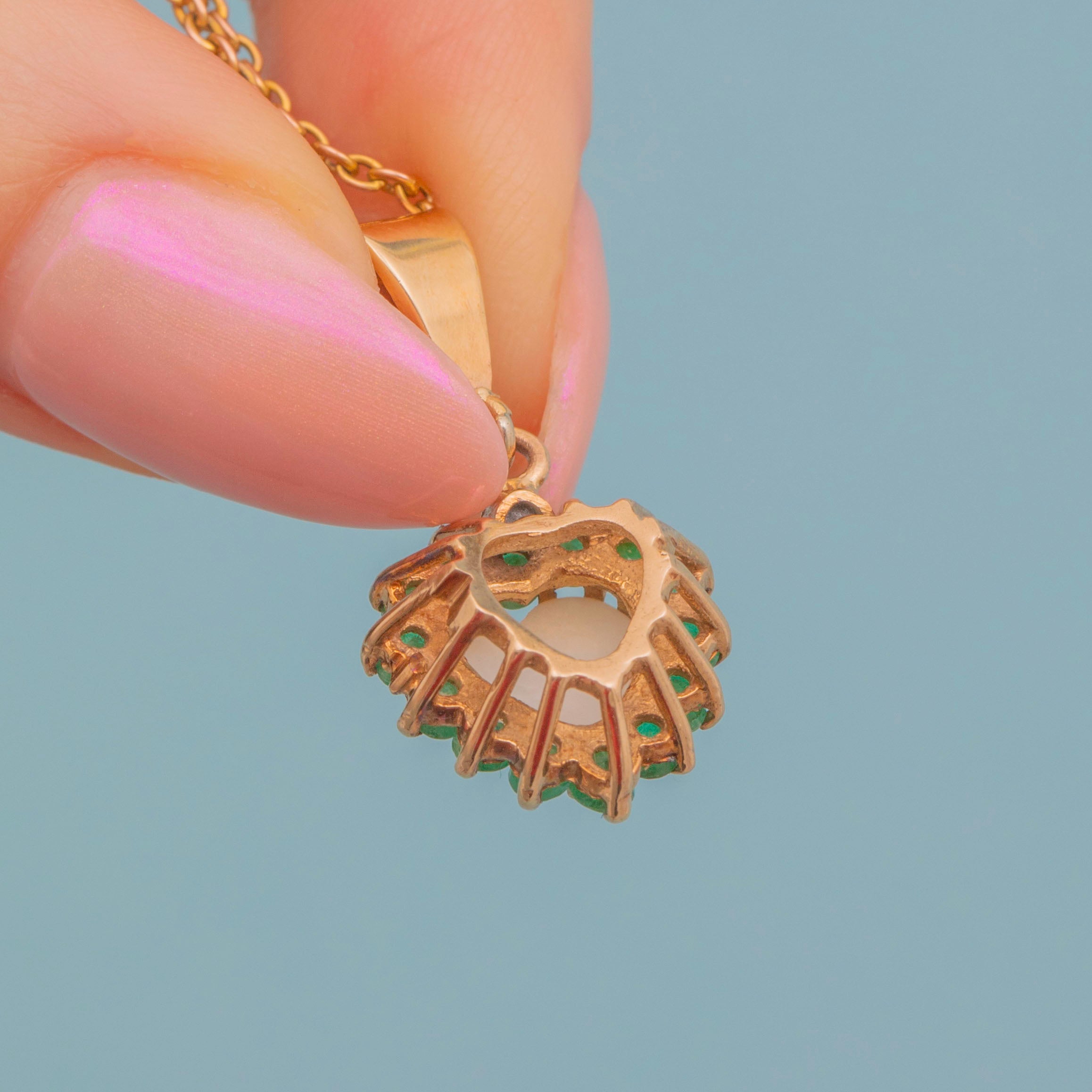 This enchanting 9ct Gold Emerald Opal Heart Cluster Charm is a modern vintage beauty with timeless appeal. She features a delicate heart-shaped design adorned with a luminous heart-cut cabochon Opal that shimmers with soft milky hue that is speckled with confetti tones, beautifully complemented by a halo of verdant Emeralds. She is fit for a princess!