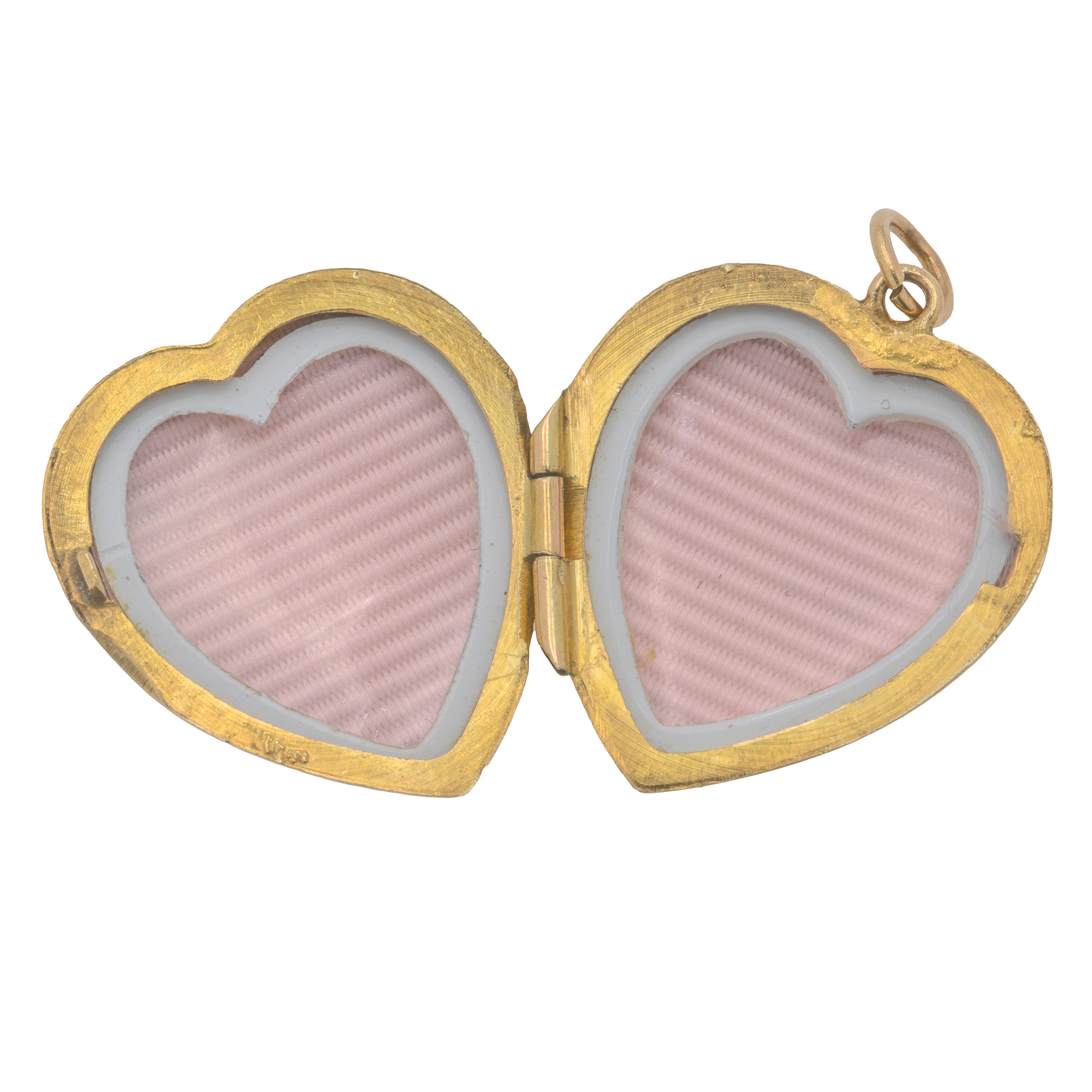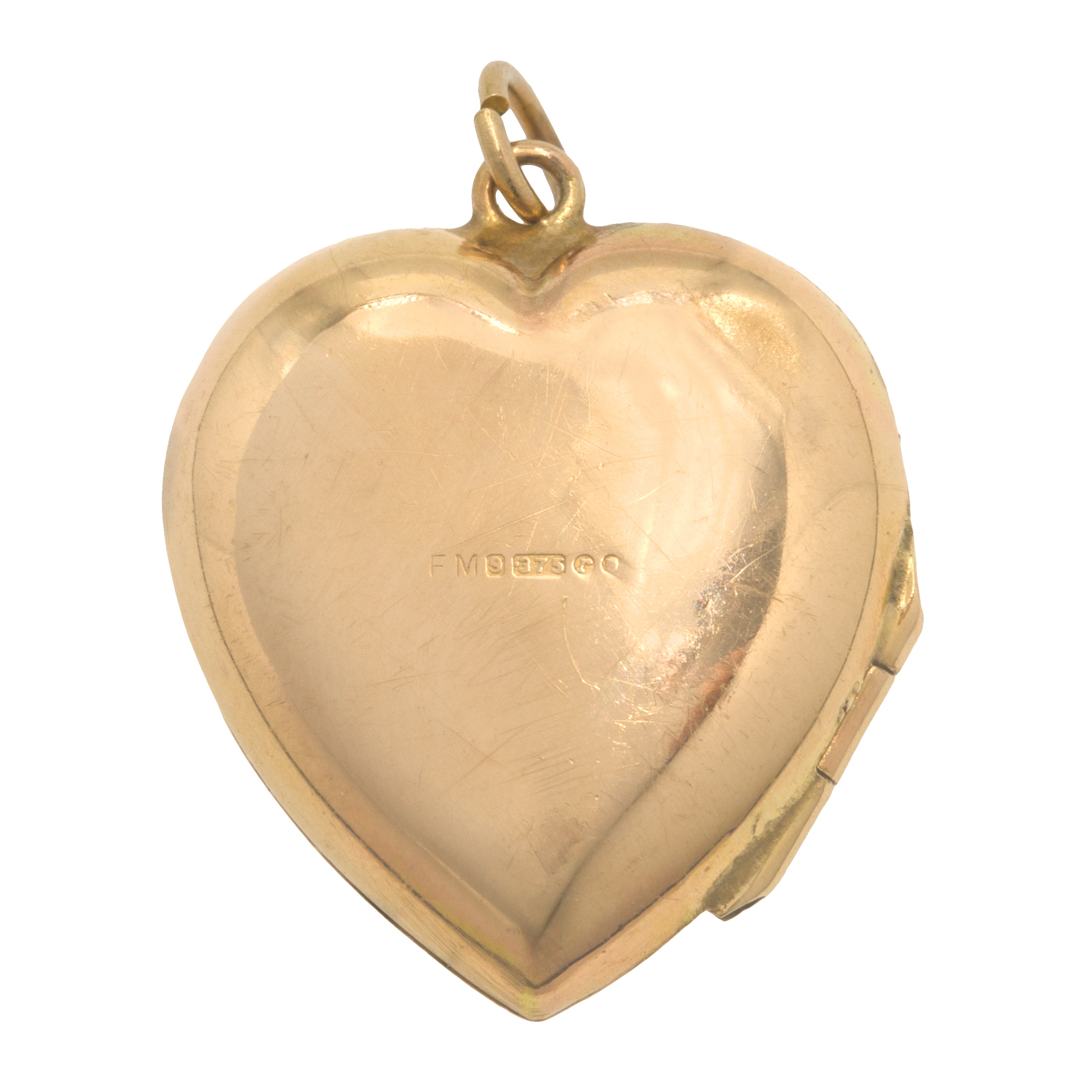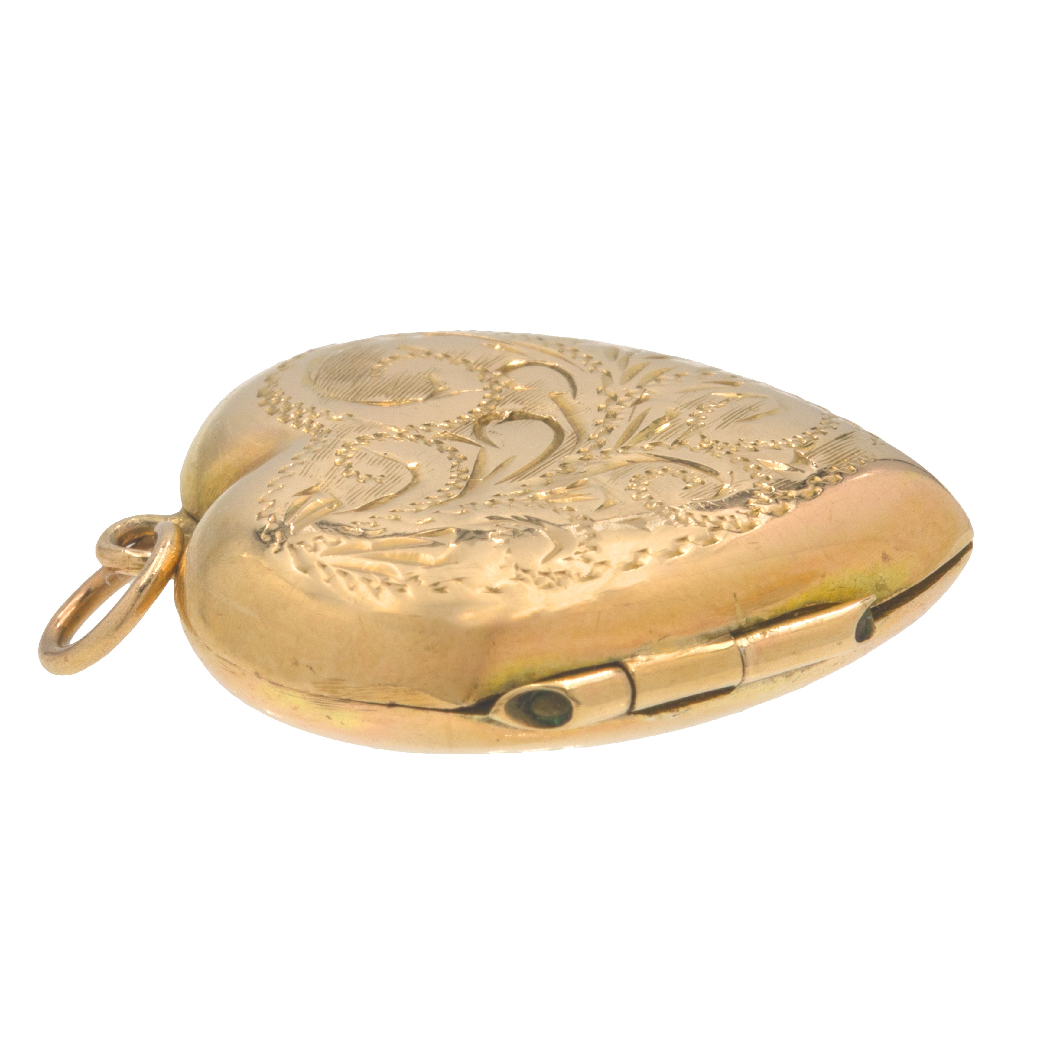 VERY GOOD. This 9ct Gold engraved heart locket is in very good condition. The Gold is buttery and smooth and the engraved details have remained crisp. There is some general wear on the locket including some light scuffs, and the photo frames are not original to the piece, but the locket closes with a "click" giving you peace of mind that your photographs will be held safely inside. With a full set of hallmarks, this is a collectible vintage locket ready to be suspended from your favorite Gold chain!