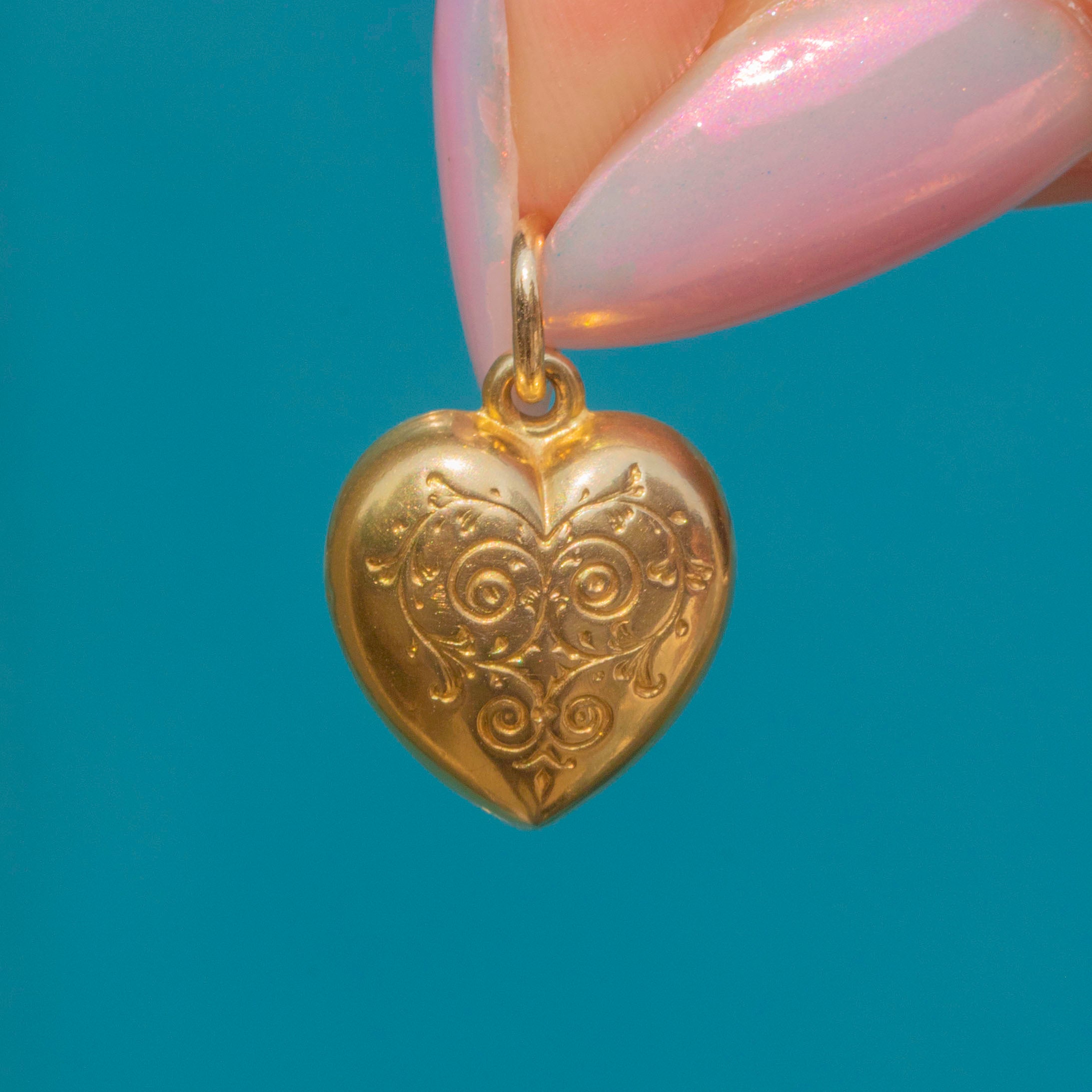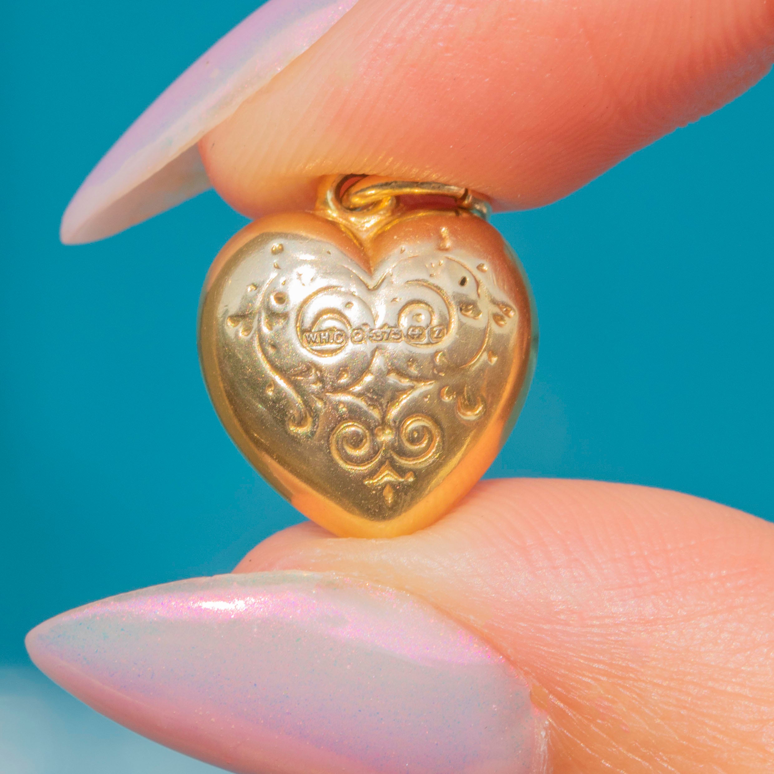 EXCELLENT: This 9ct Gold engraved puffy heart charm is in excellent condition. The Gold is buttery and her engraved details are defined with no signs of surface wear. With so much wear potential, this vintage Gold heart pendant can be worn and enjoyed every day!