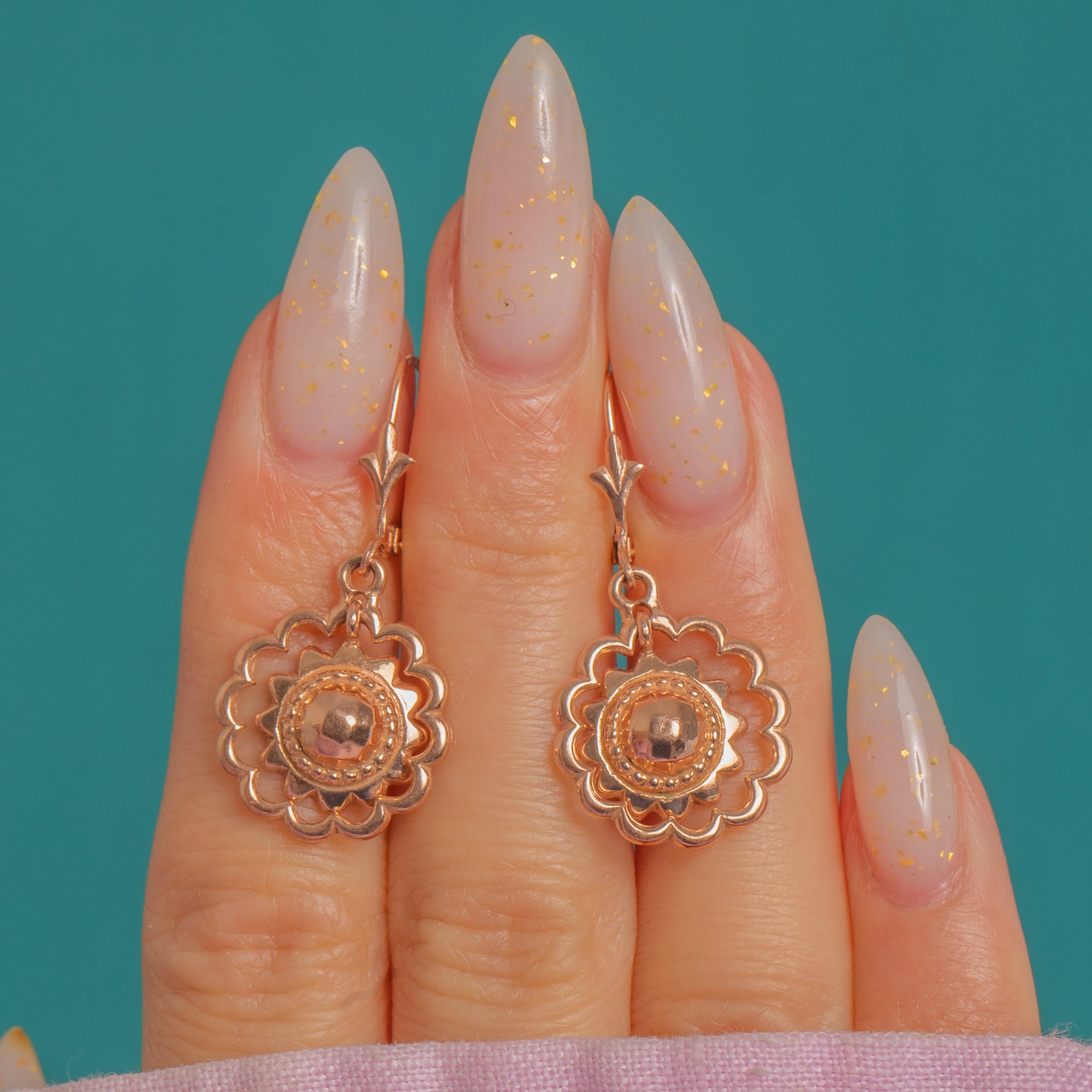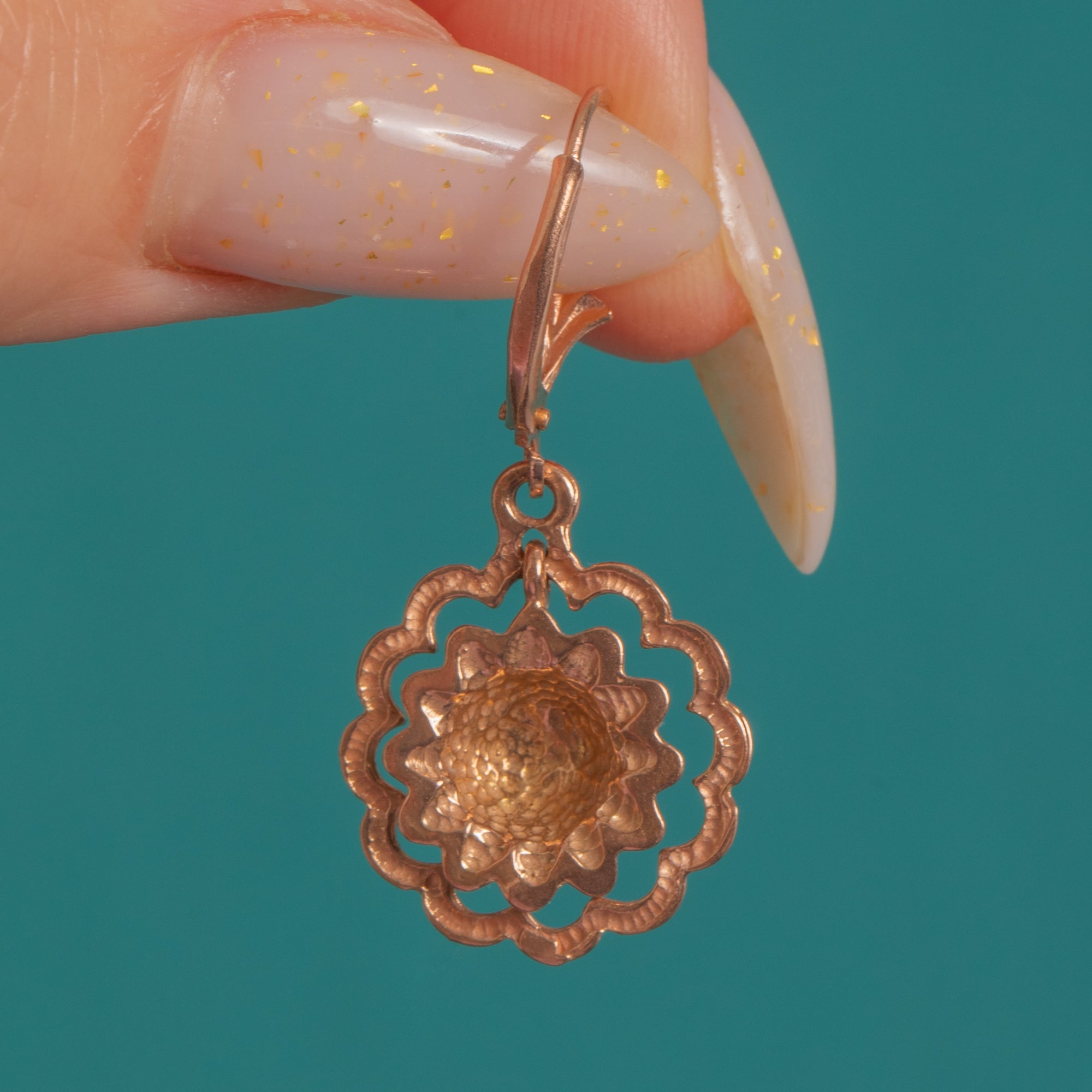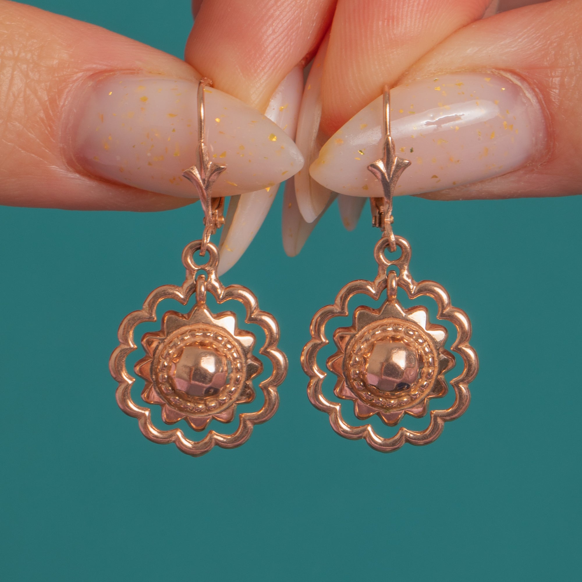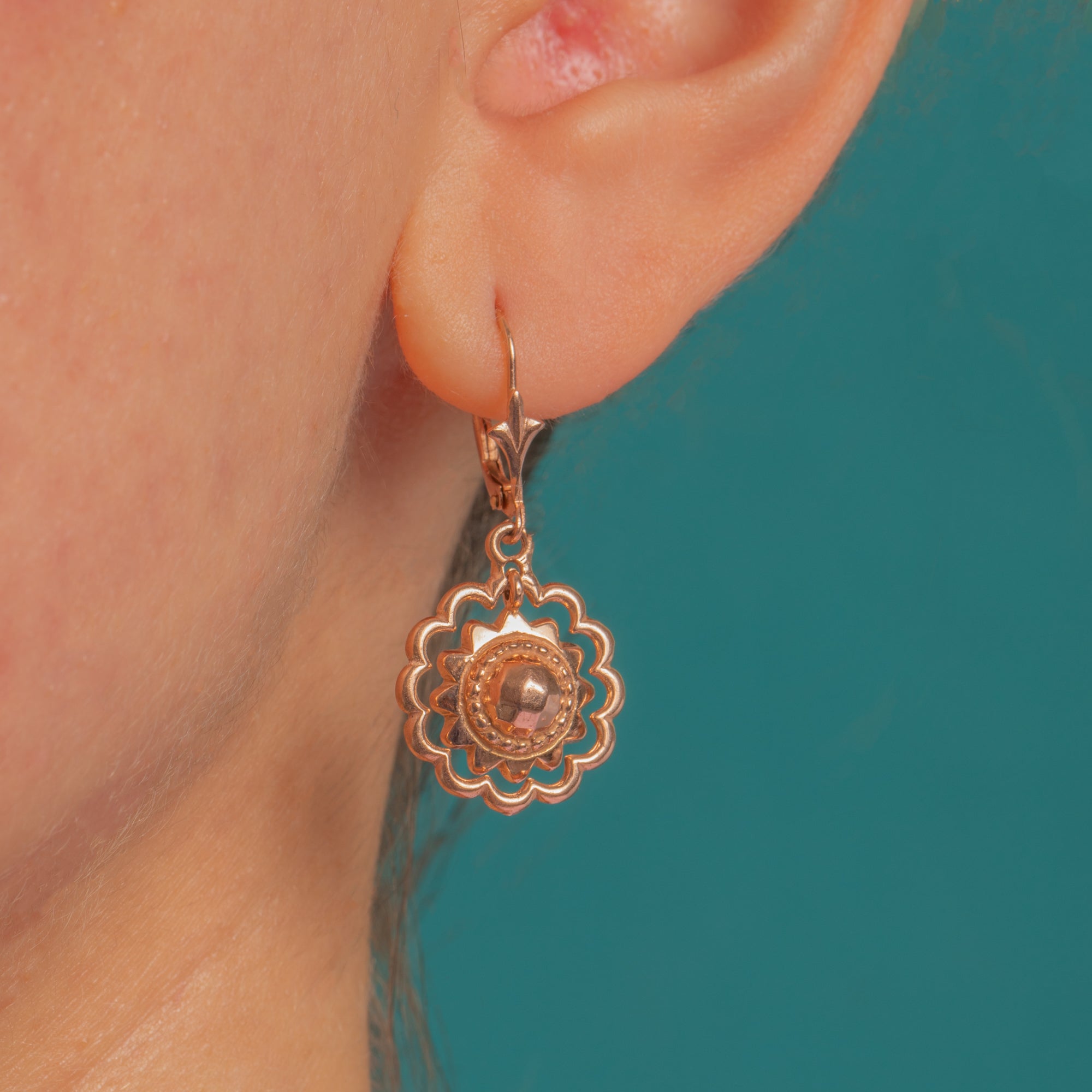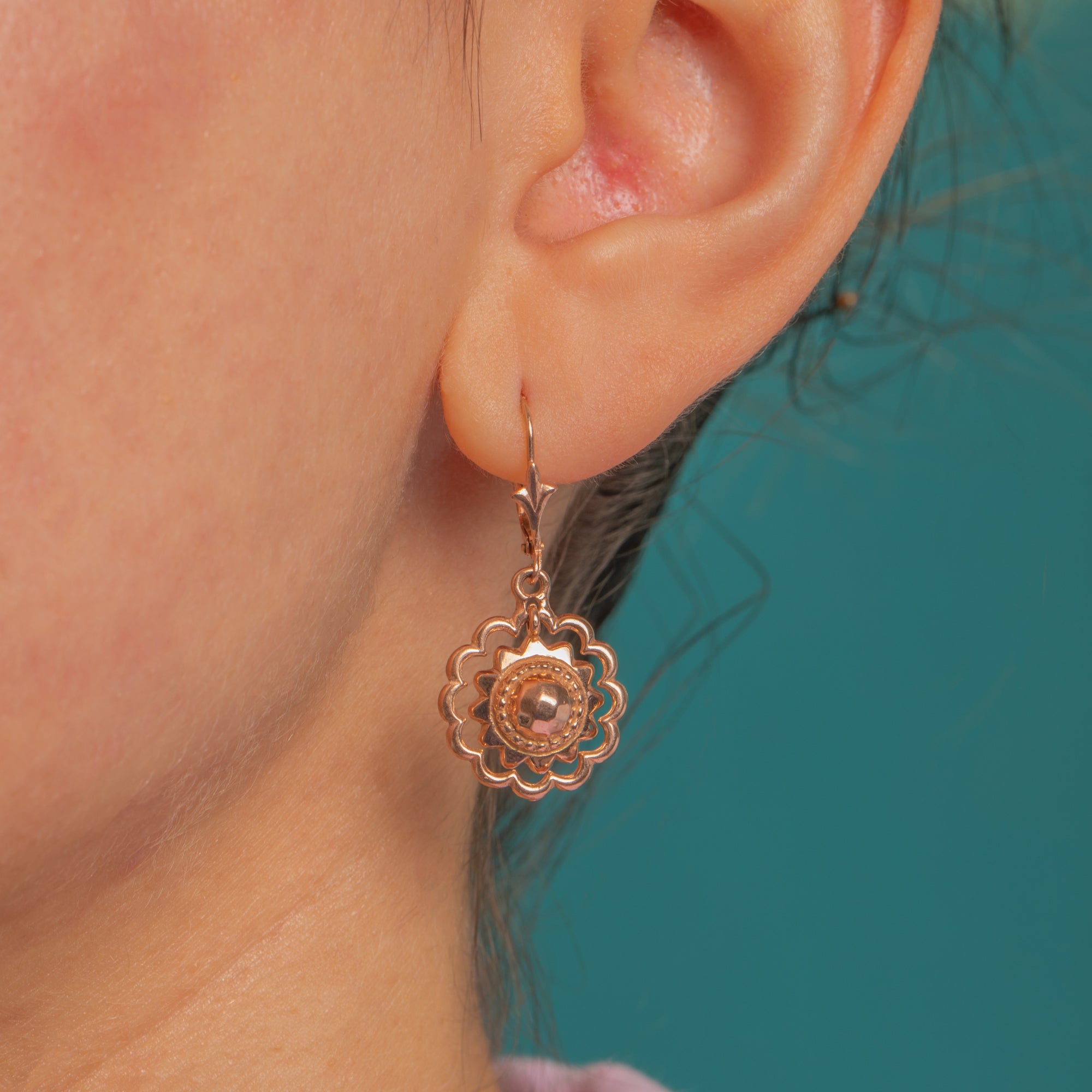 Delicate and beautifully detailed, these Etruscan-style 9ct Gold drop earrings showcase openwork rosettes with scalloped “petals,” a raised domed central boss and a fine beaded collar. The articulated construction gives them a graceful, fluttering movement, while the foliate-detailed ear wires add a refined finishing touch.