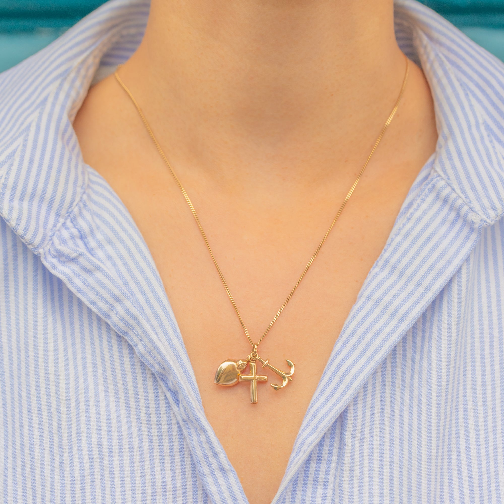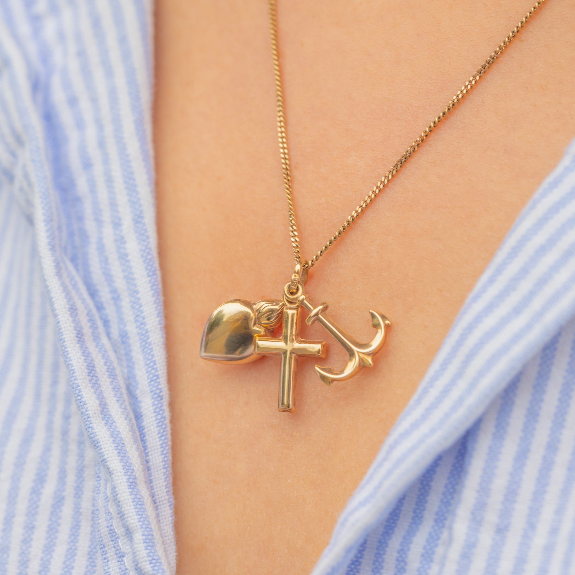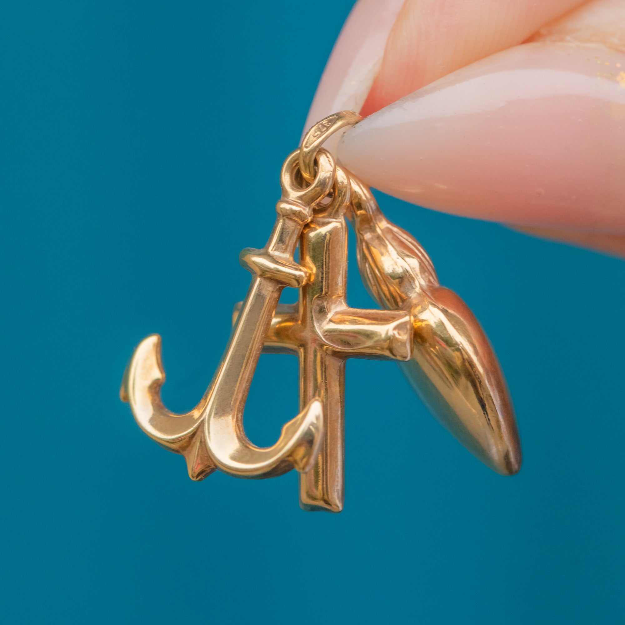 This Vintage charm brings together the classic symbols of Faith, Hope, and Charity — the cross, anchor, and heart. Crafted in 9ct Gold, it has a warm tone and is perfect as a meaningful pendant or bracelet charm.