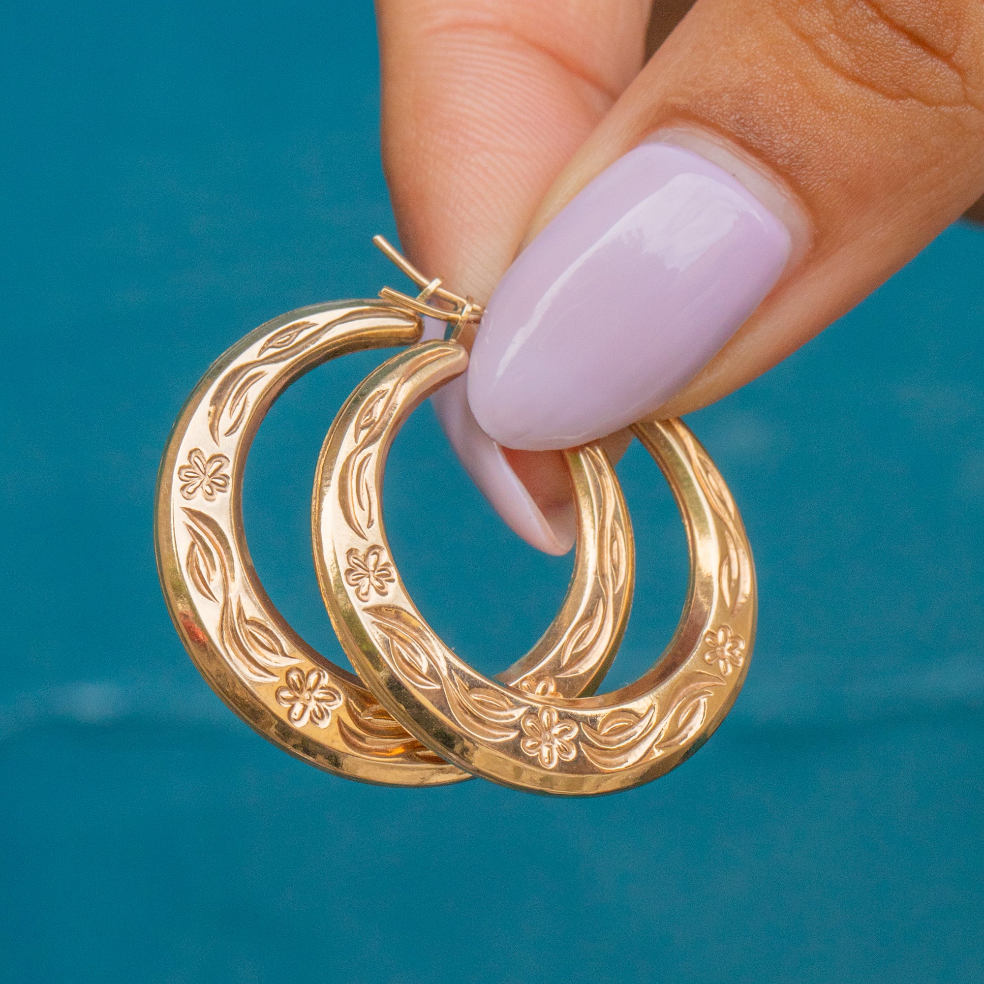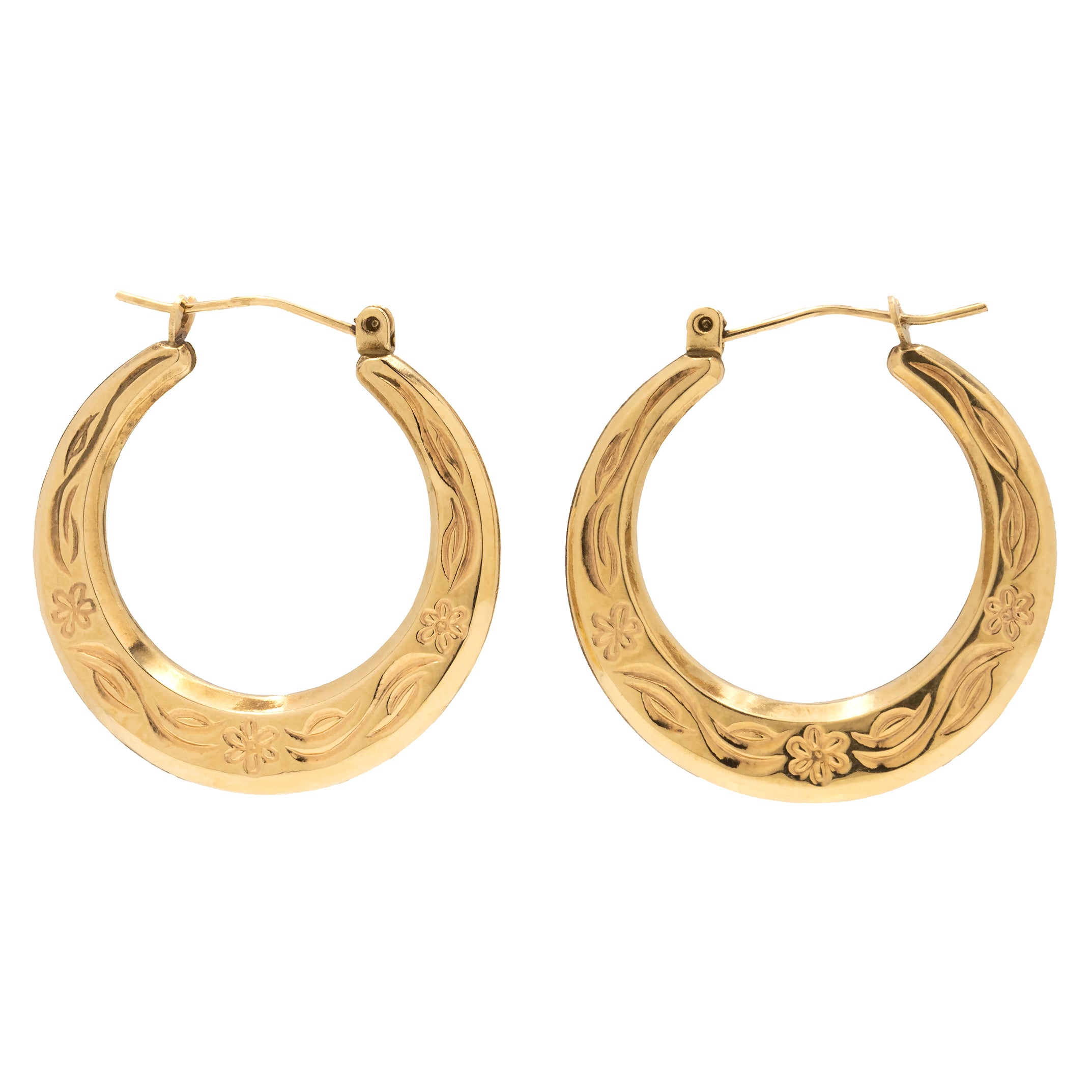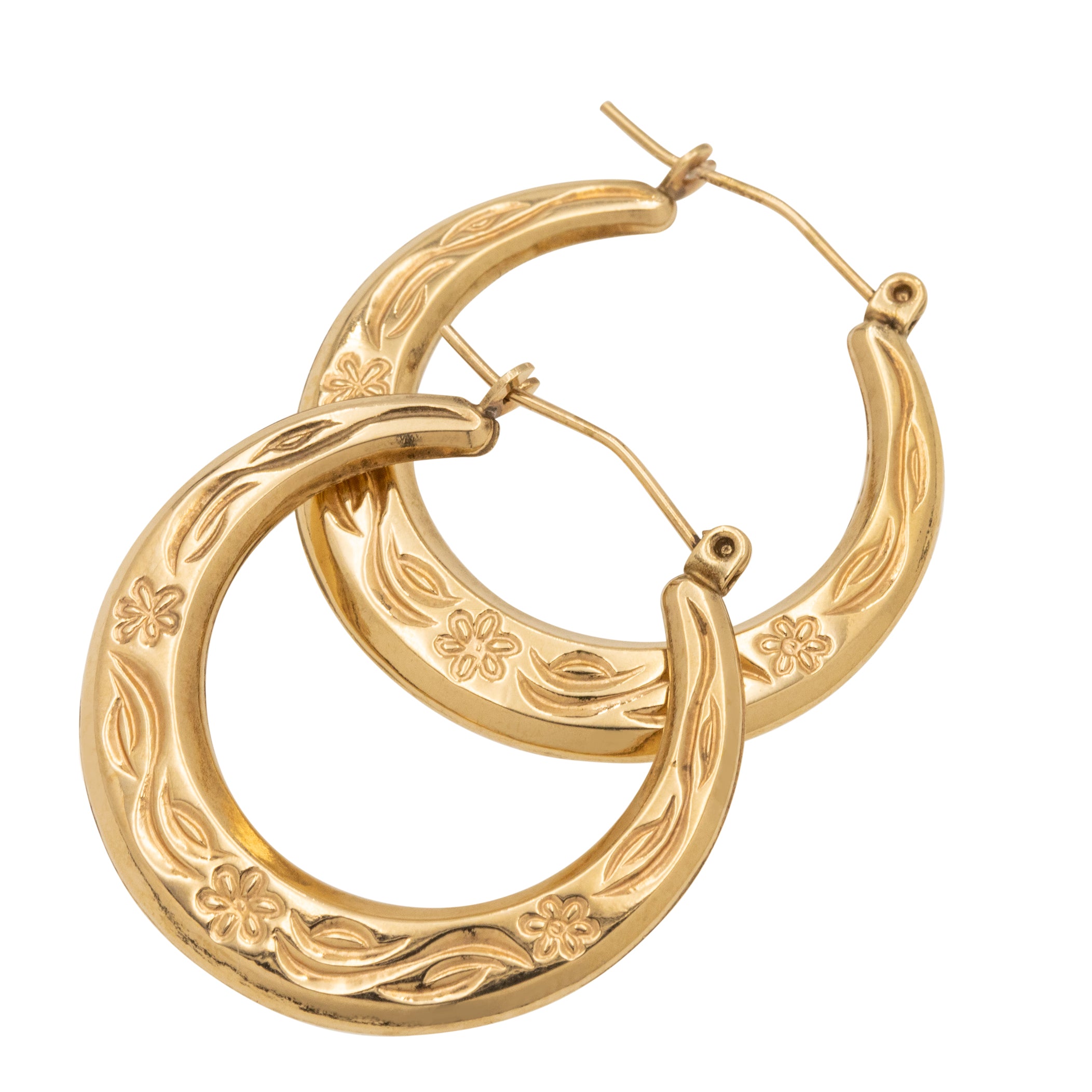 EXCELLENT. These 9ct Gold flower engraved hoop earrings are in excellent condition! With crisp engravings, sturdy ear posts, and great form, there is nothing to report other than how gorgeous they are.
