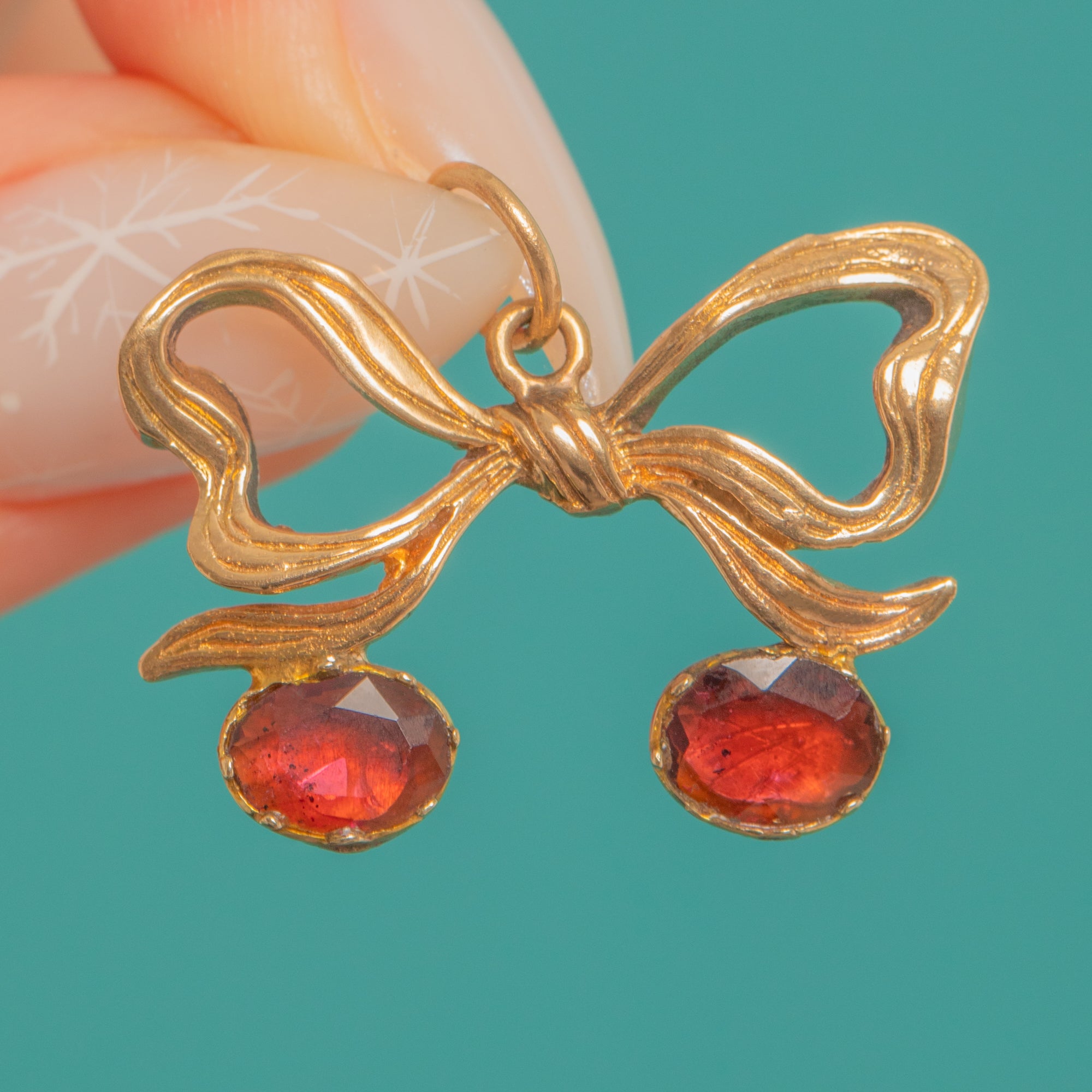 A romantic ribbon rendered in warm 9ct Gold unfurls into a graceful bow, suspending a pair of cherry-like drops that dance with every movement. The bow is crisply detailed with chased folds and the Garnet drops are neatly held in closed-back piecrust settings, their deep claret hue intensified by historic foiling.