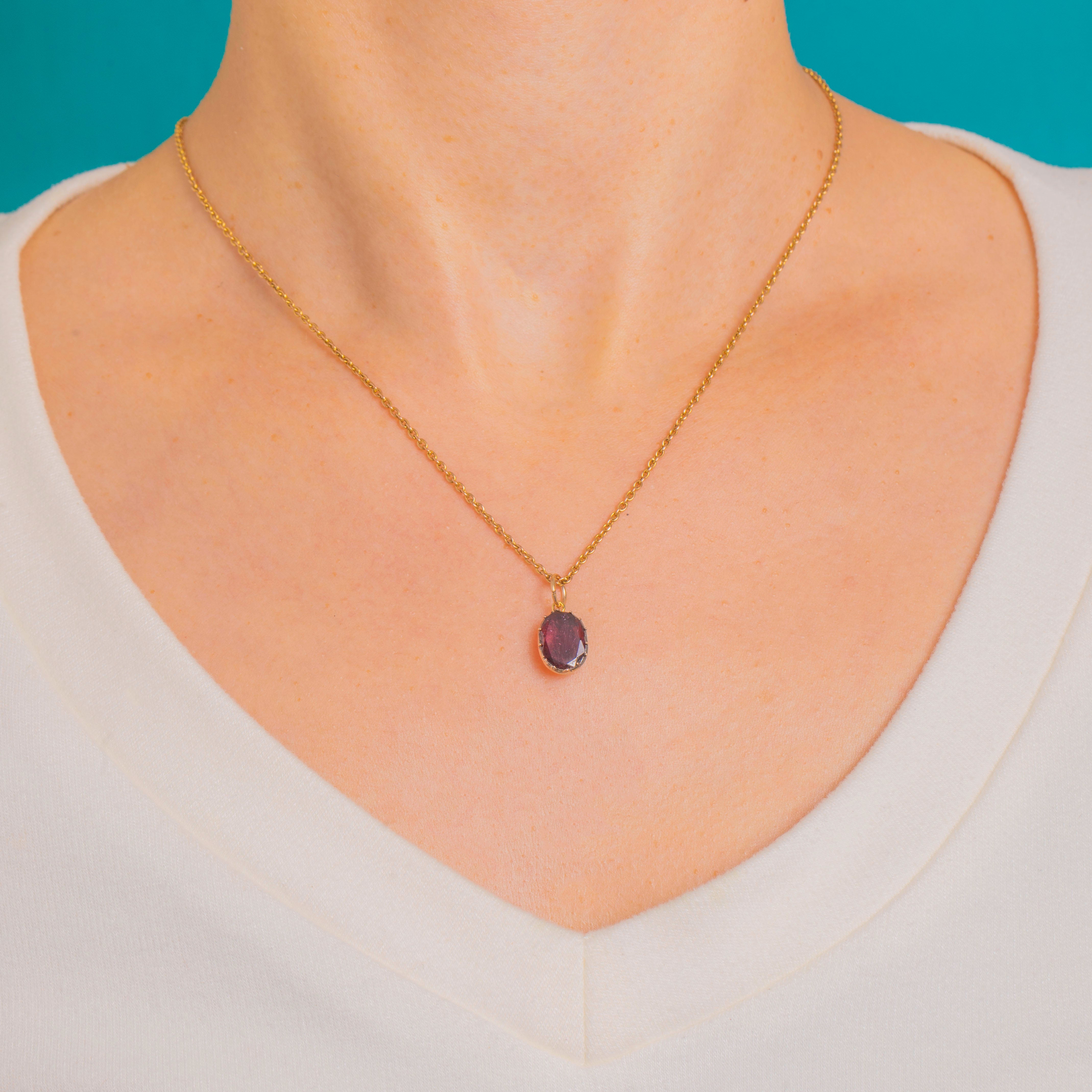 Glowing with a deep, wine-red hue, this Georgian foiled flat-cut Garnet charm is a petite beauty in warm 9ct Gold. The oval Garnet sits in a closed-back collet, lending a softly antique silhouette and a delicious richness of colour.