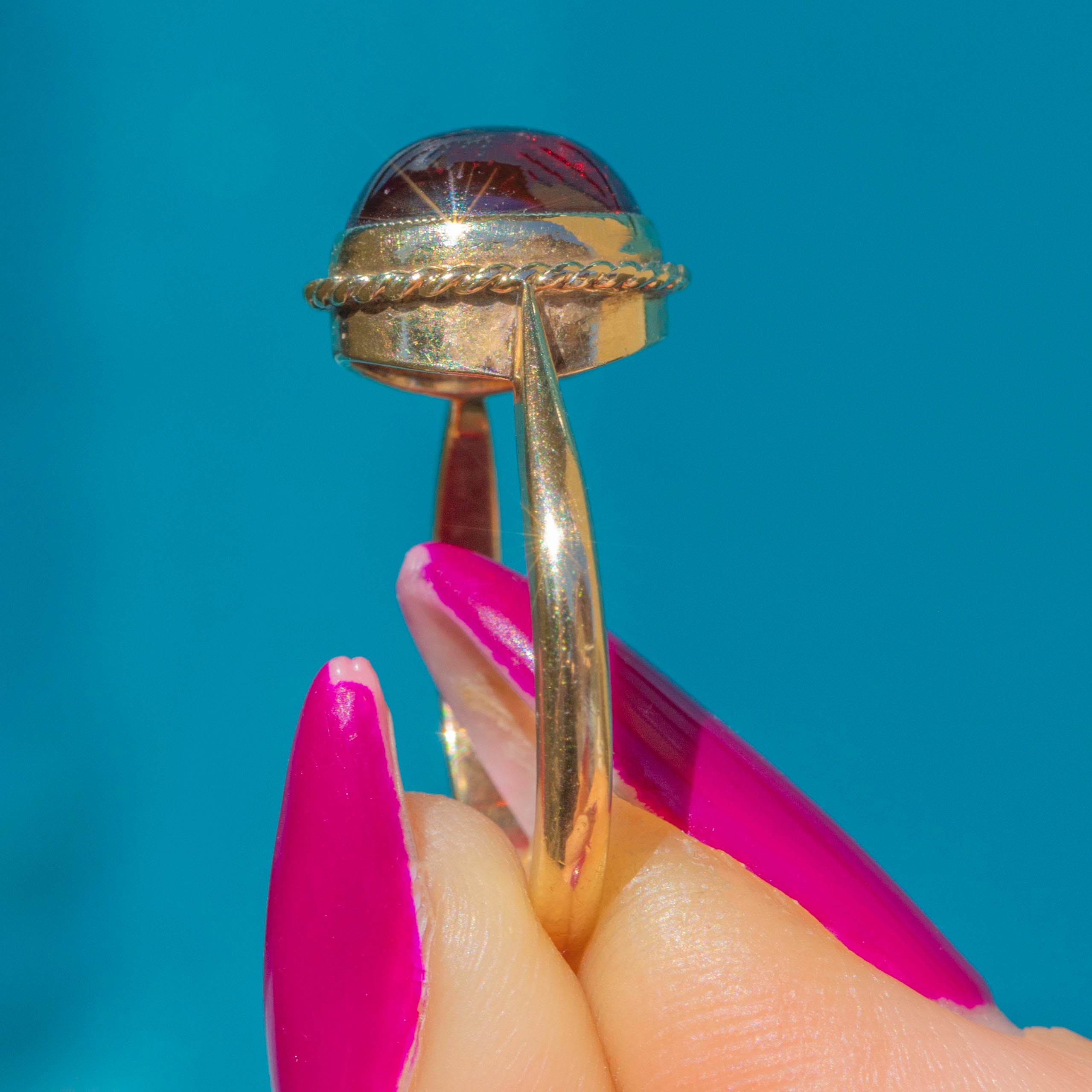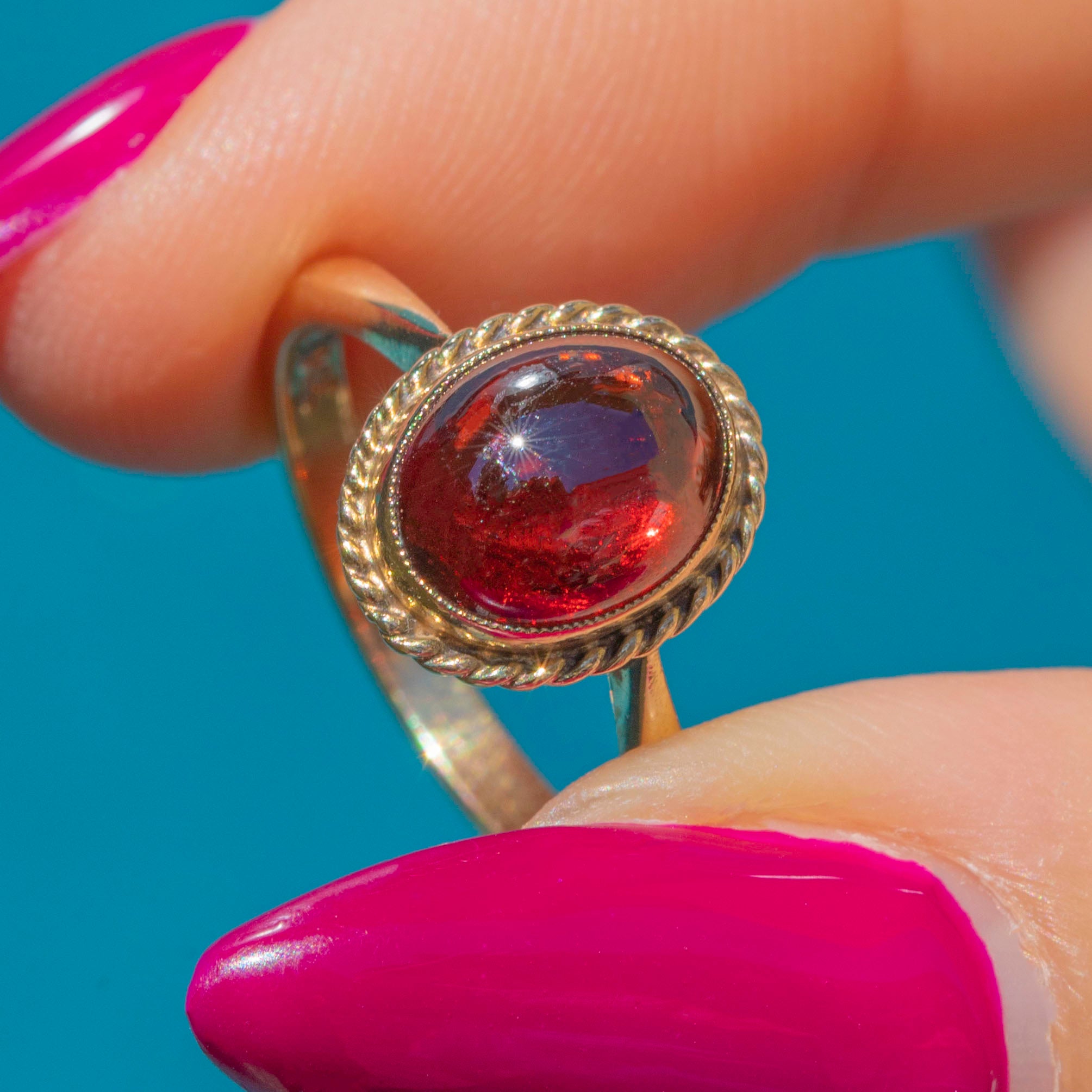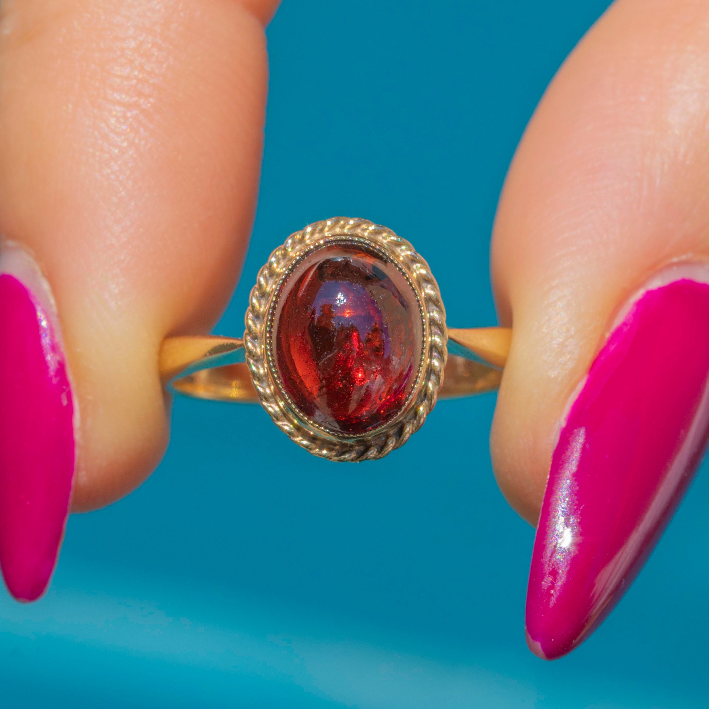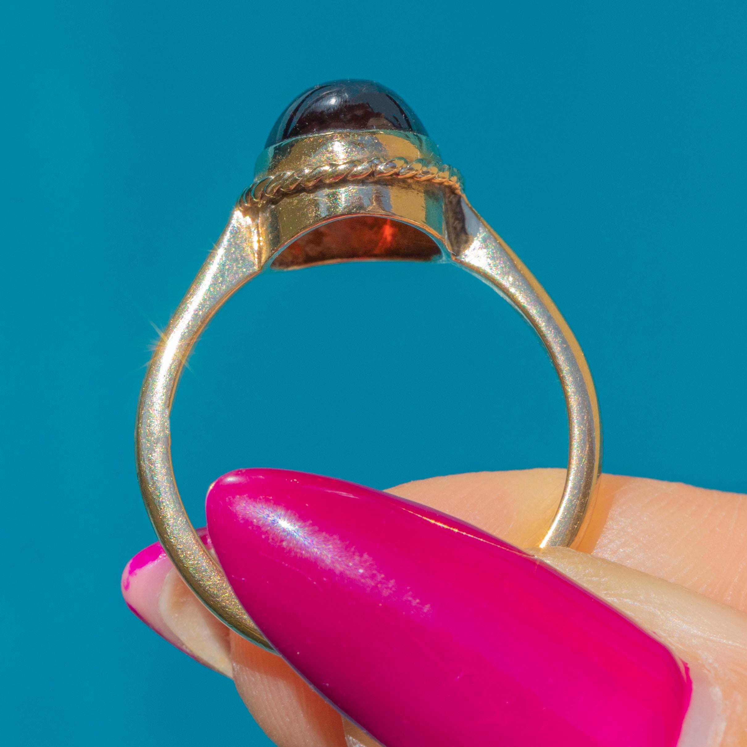 The domed 3.80ct Garnet cabochon is definitely the star of the show, crafted from solid 9ct Gold.