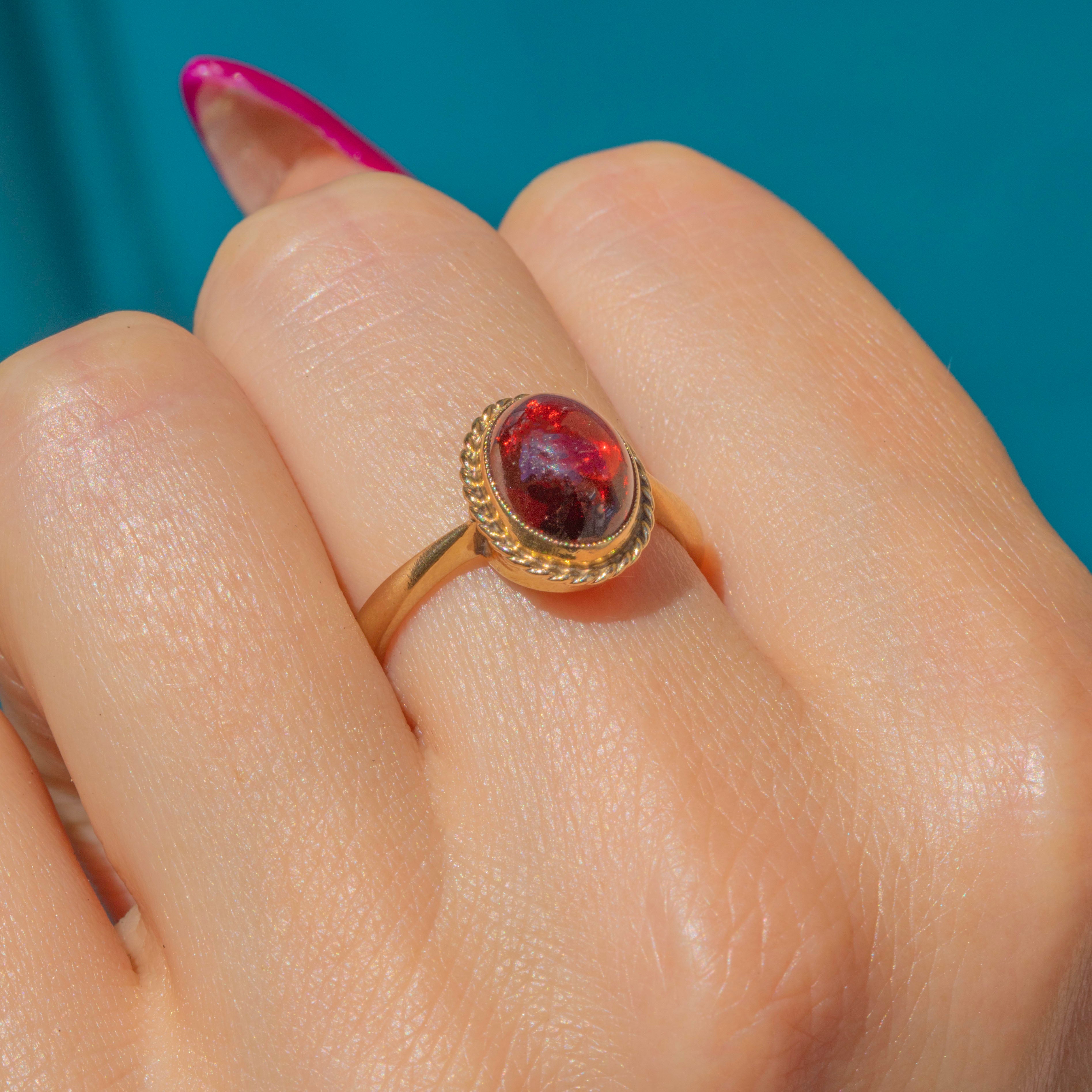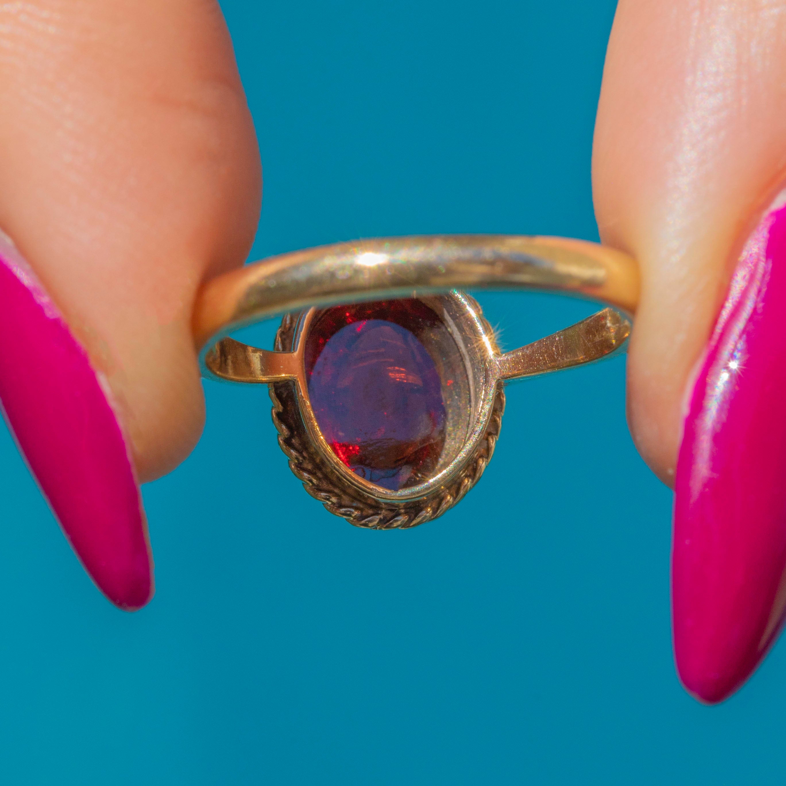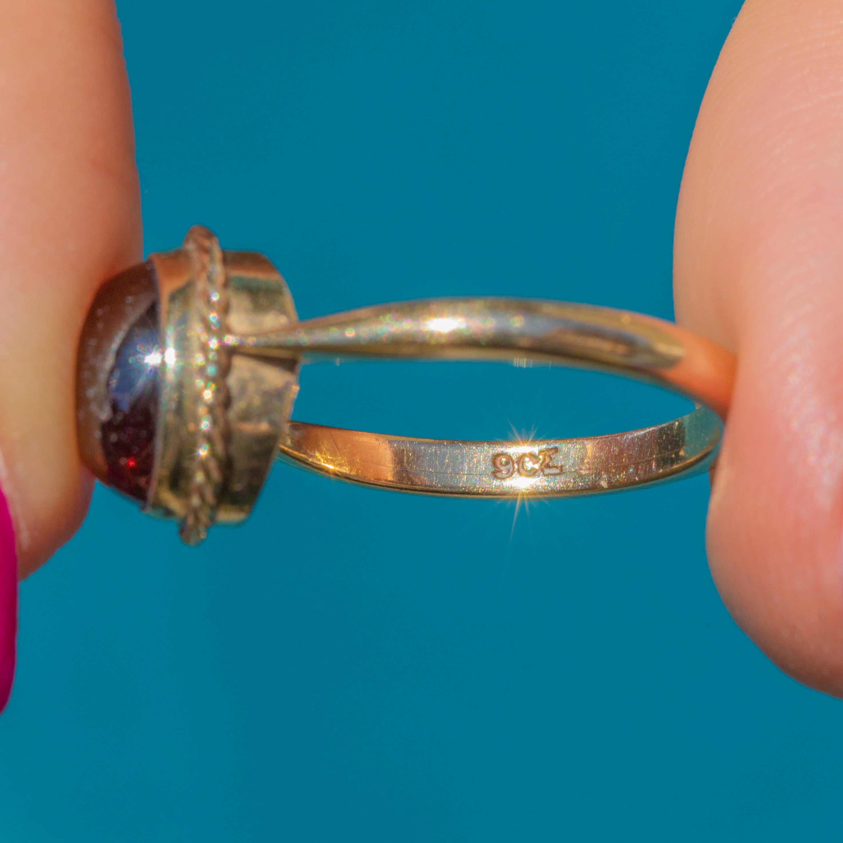 EXCELLENT: The Garnet is smooth and although she does have some mild surface wear, is secure within her bezel setting. The 9ct Gold band is smooth and the shoulders fully support the stone! We love this piece.