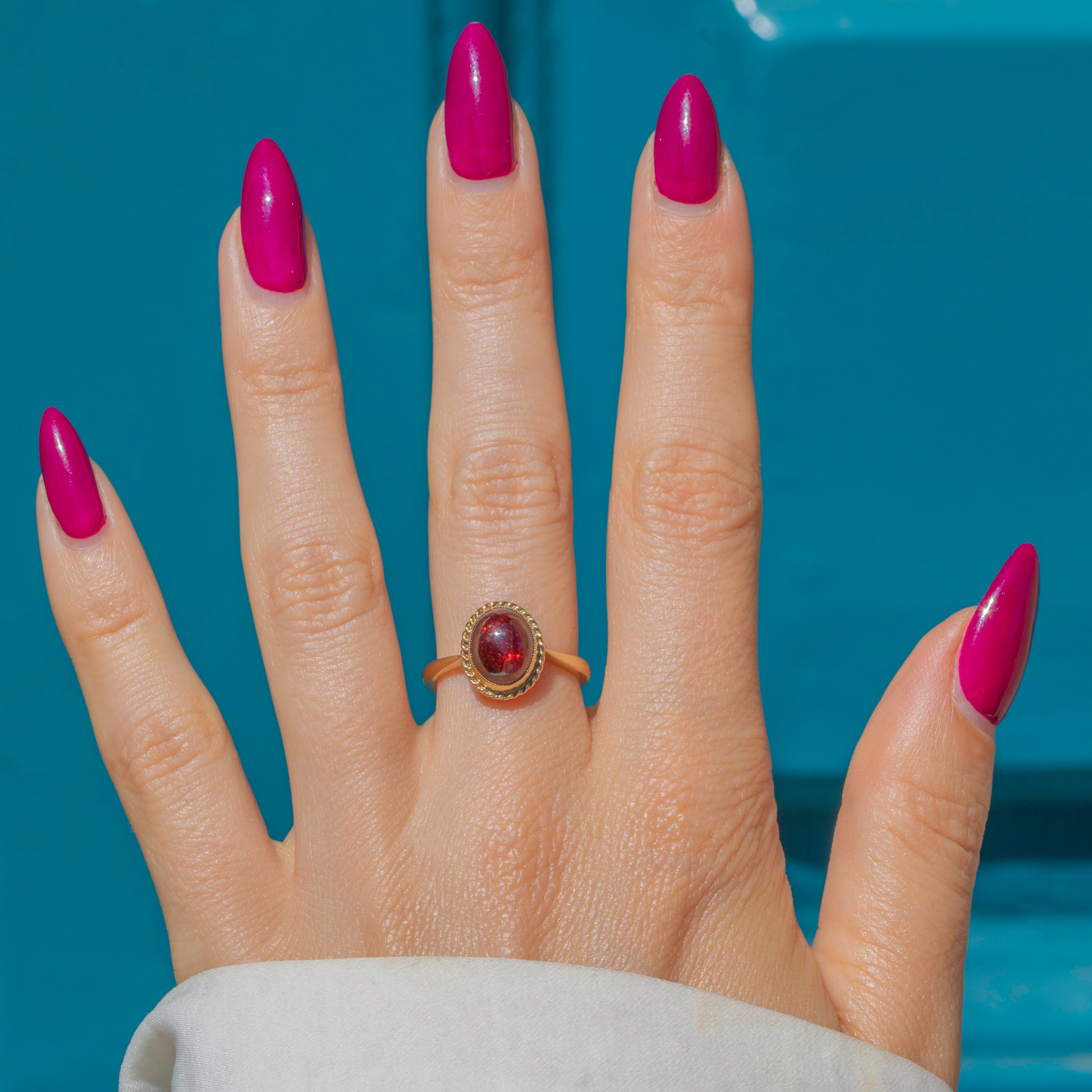 We adore this 9ct Gold Garnet cabochon ring! With a plump, juicy 3.80ct Garnet taking centre stage, we think that you're destined to fall in love with her- how could you resist that deep wine red hue?!